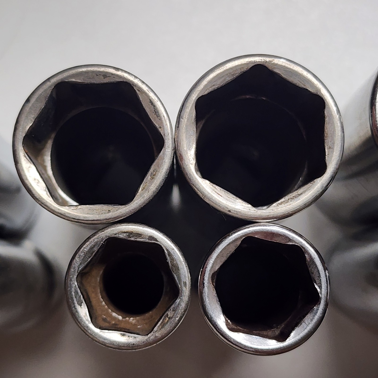 The sockets are pre-owned with wear from use, including scratches, dings, patina, shop grime, other potential wear, and could use a deep clean on the inside if you were motivated enough lol. Please review all of the pictures as they are part of the description. Ask any questions before purchasing. Thank you