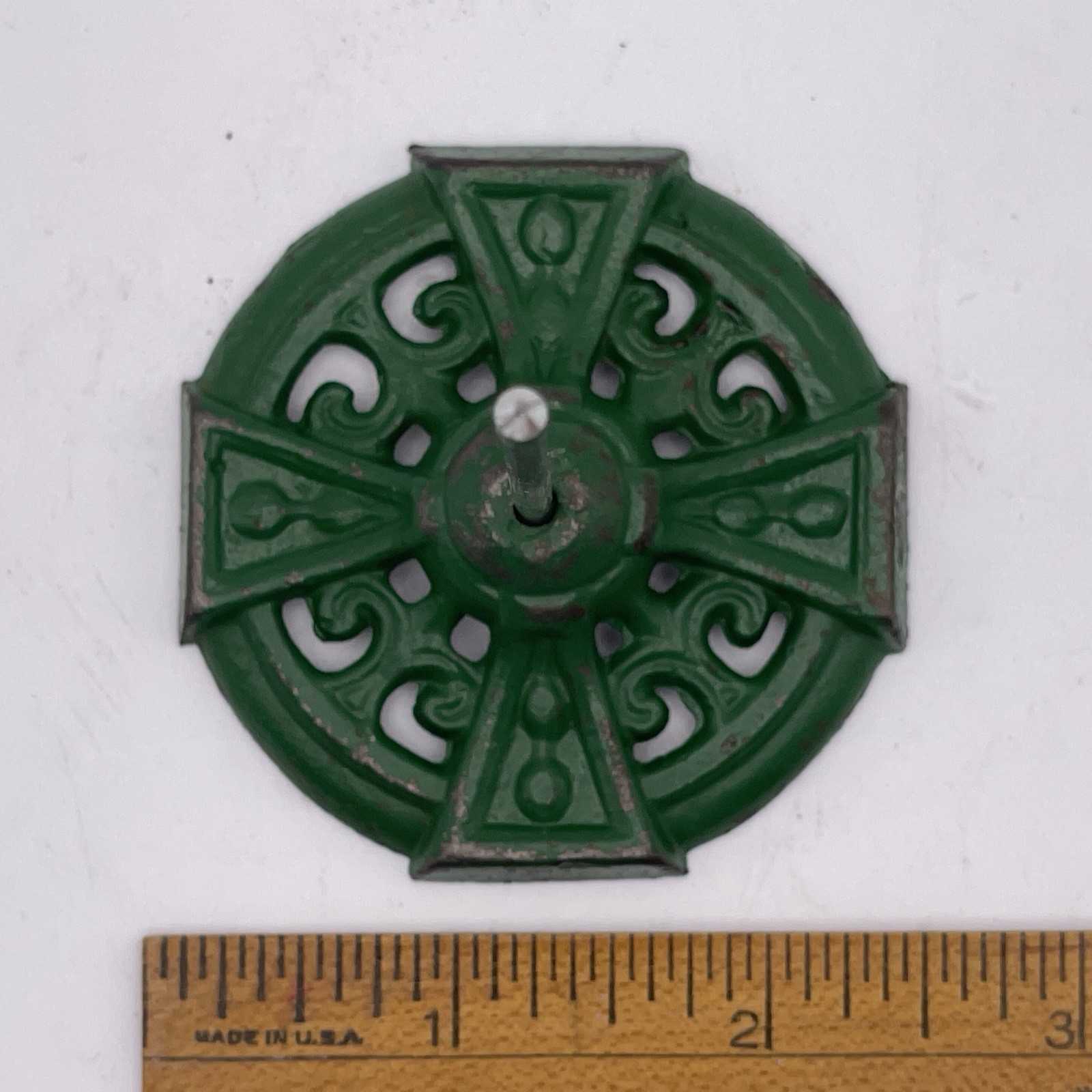 Classic vintage cast iron memo spike (also called a receipt holder or bill spike). Features a decorative green-painted octagonal base with intricate cut-out scrollwork and cross design. The sturdy metal spike is pointed for easily stabbing receipts, memos, orders, or notes.