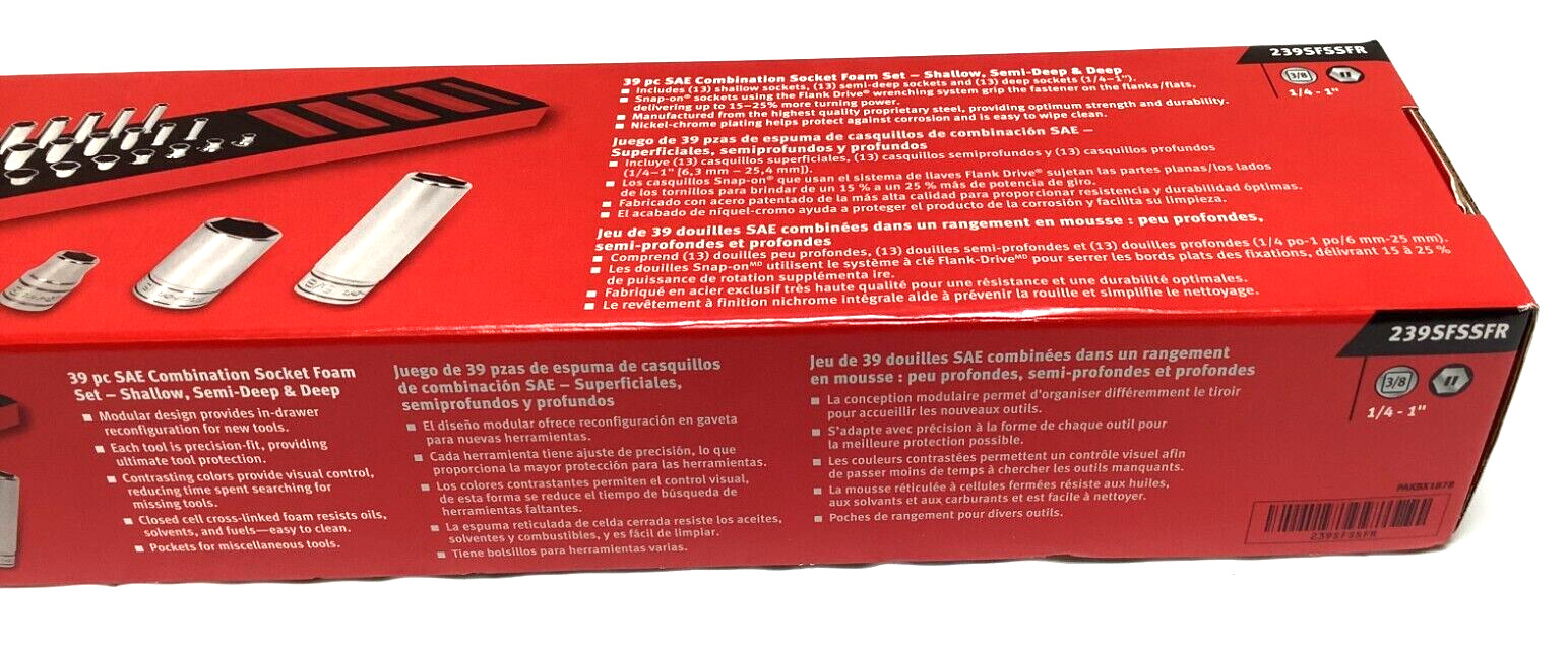 Snap-on™ 239SFSSFR 3/8" dr 1/4" thru 1" 3/8" dr 6 thru 20 mm 6pt Shallow Semideep Deep Socket Set in Sealed Packaging. New, Unused. No owner markings.
