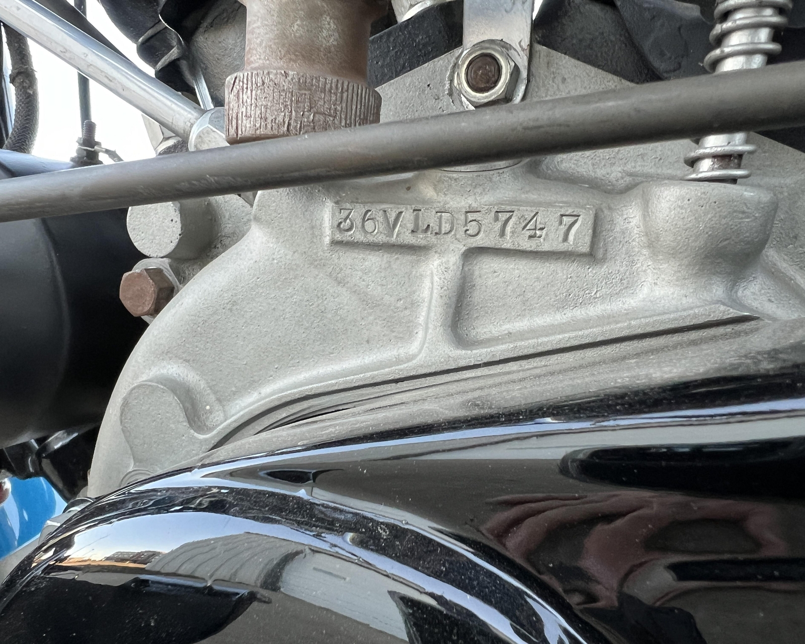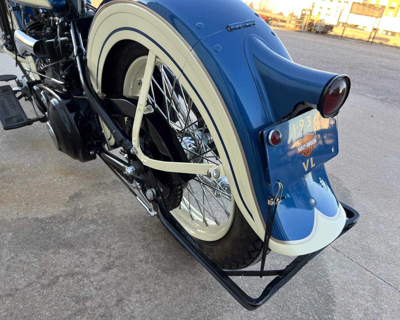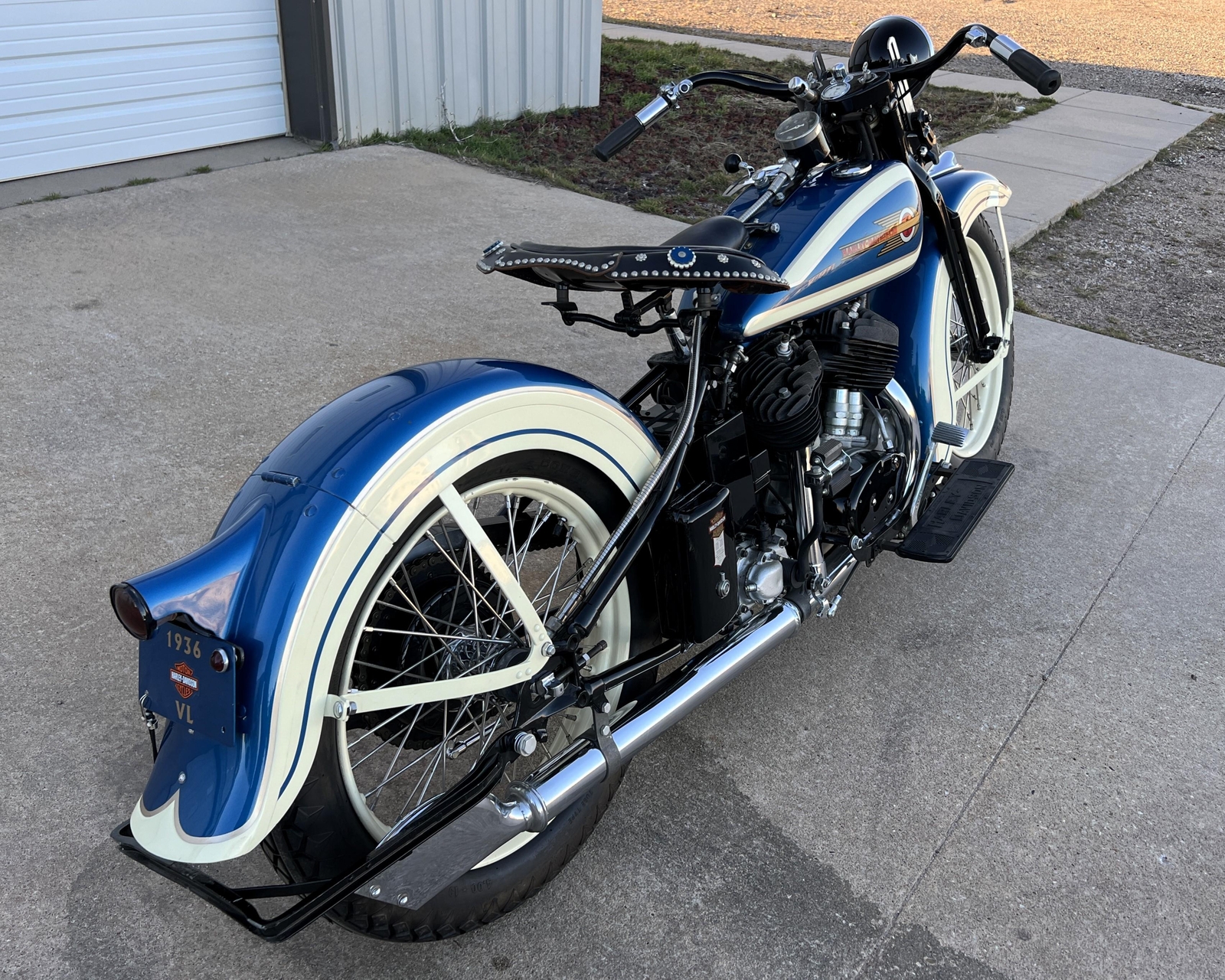 Year: 1936 Make: Harley Davidson Model: VLD Color: Blue and Cream Engine Size: 1200cc - 74"cu Cylinders: 2 Transmission: 3 Speed Mileage: 00005 VIN Number: 36VLD5747 Frame Number: No Frame number in 1936 Motorcycle Currently Registered: Yes Ownership: Clear Title in Owners Name