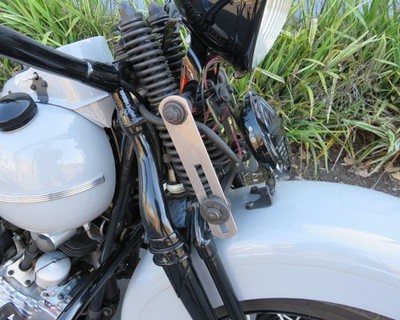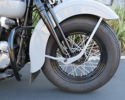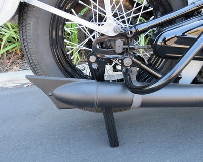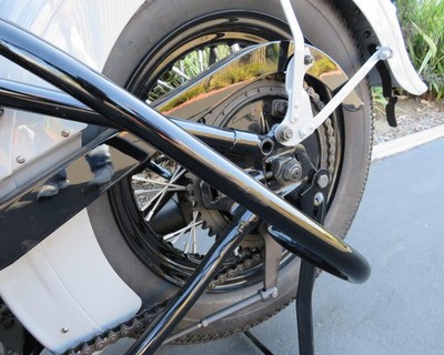 The bike features many one- or two-year parts that are only found on wartime civilian production motorcycles that were offered by the motor company. Civilian production was limited to essential use, making the number of units sold quite low. The frame and fork main leg are correct for 1944 and 1945. The fork spring leg is a number 13, also correct for âÂÂ45.