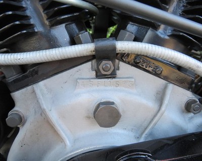 The cylinders and heads are all from 1945 and as visible in the photos, they bear the raised date code verifying that. The valve seats in the heads were given a grind with the correct angles to seal all combustion in the chambers. The valve guides are all new and while they were out, the rocker covers were parkerized and the oil feed lines were checked to make sure there were no obstructions to the oiling system. The carburetor is the correct Linkert M-35 and is finished in black as it should be and all adjusting screws and needles are cadmium plated, as Linkert had their own source for cadmium plating. The manifold and nuts are parkerized as are the pushrod tubes and rocker shaft nuts. This is all correct for 1945 production. The lifter blocks and oil pump are painted white as cadmium plating and silver paint was reserved for the war effort. The transmission gear case is also date coded 1945 as is the kick starter cover.