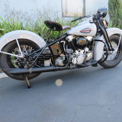 This is a 1945 Harley Davidson FL motorcycle that has undergone a concours restoration/rebuild. The 1945 Harley Davidson FL is listed in The Harley Davidson Data Book as a Special Sport Solo; 74 cubic inch high-compression Knucklehead OHV V-Twin with a 4 speed transmission. Price of $465 and 619 produced. Color offered of Grey.