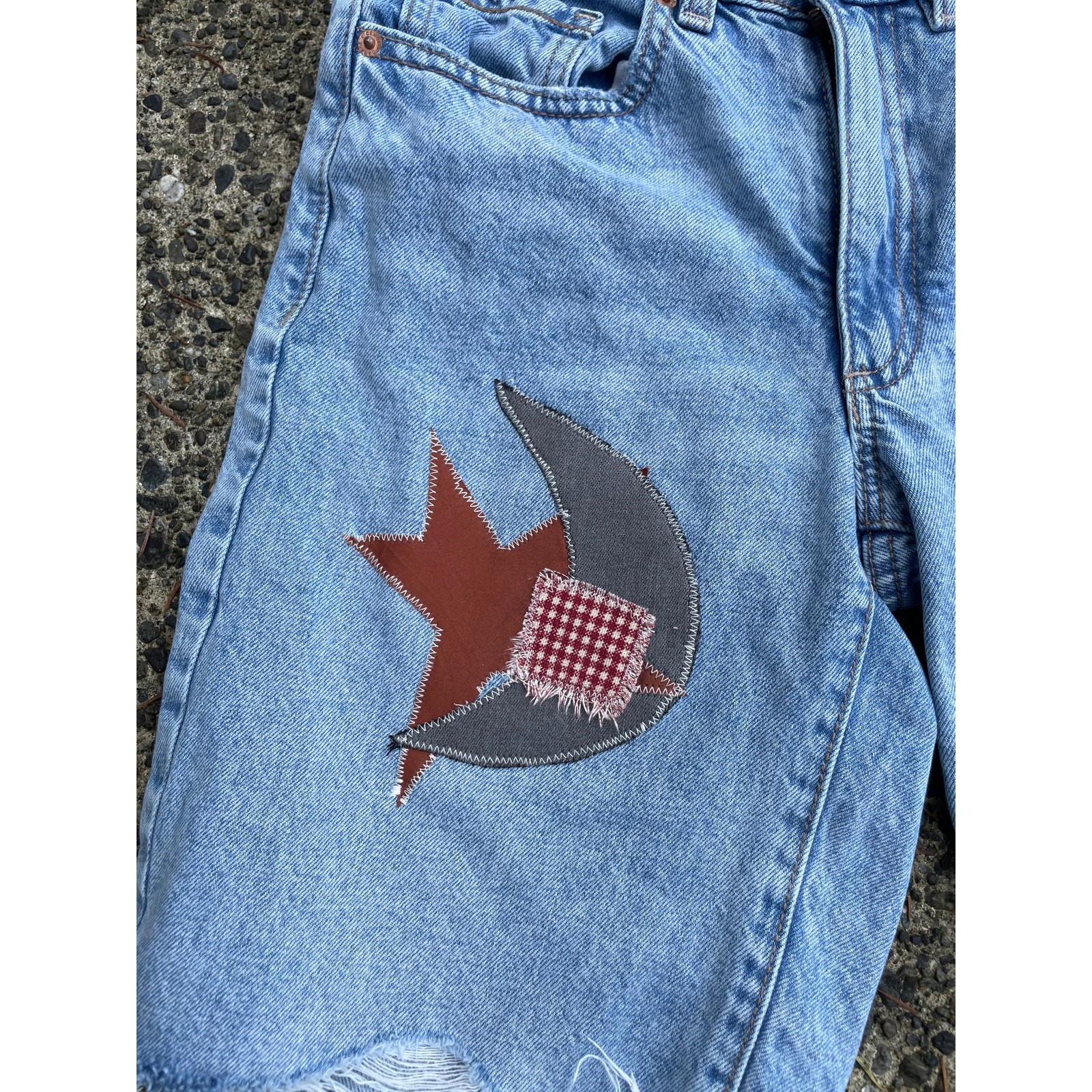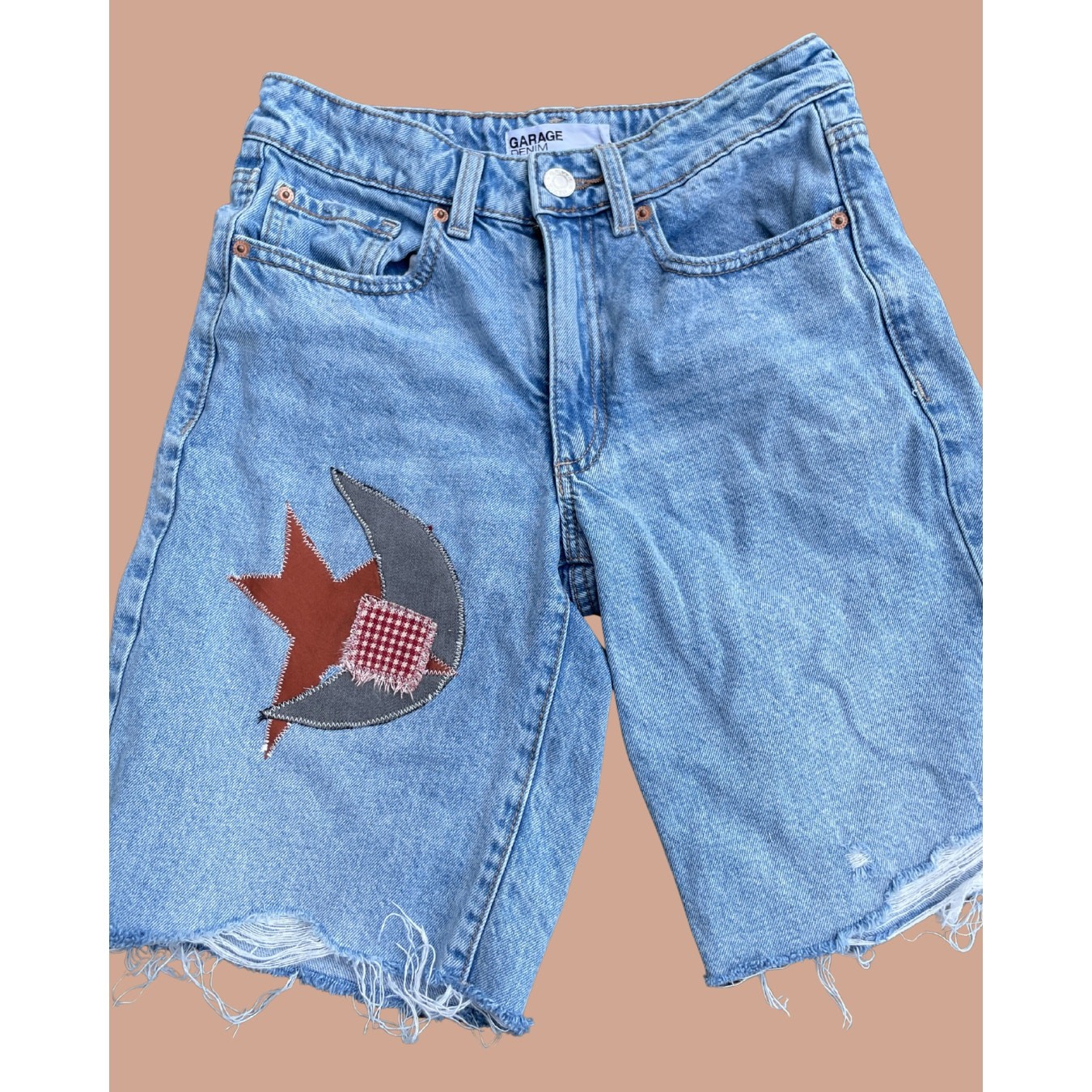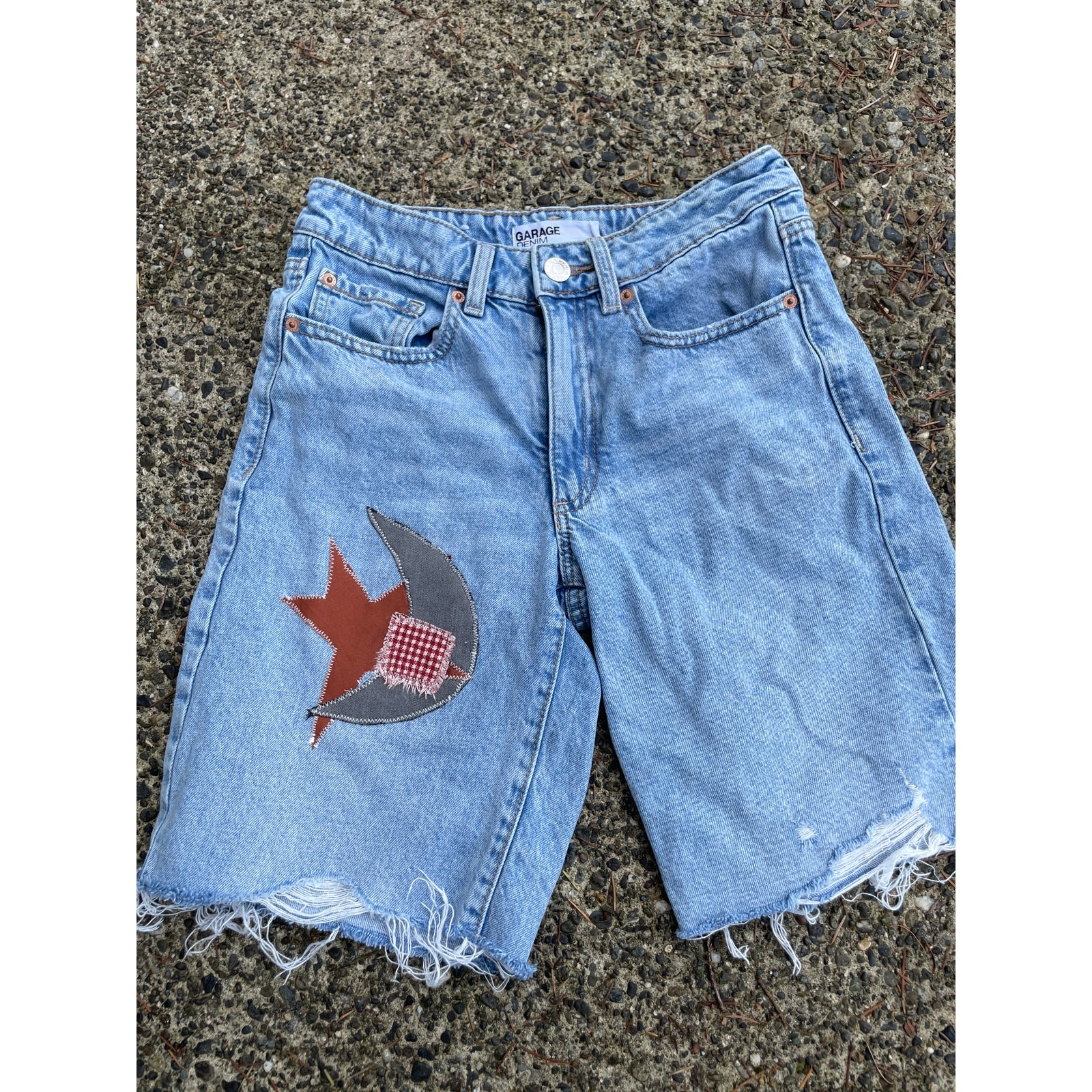 These perfect condition shorts have been upcycled to feature a handmade celestial applique.