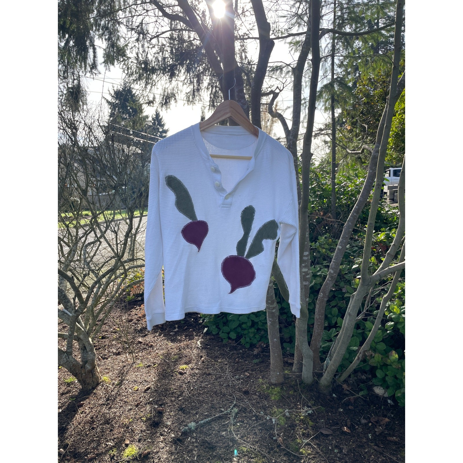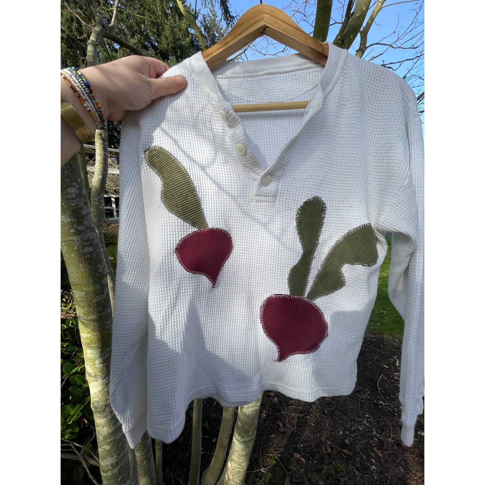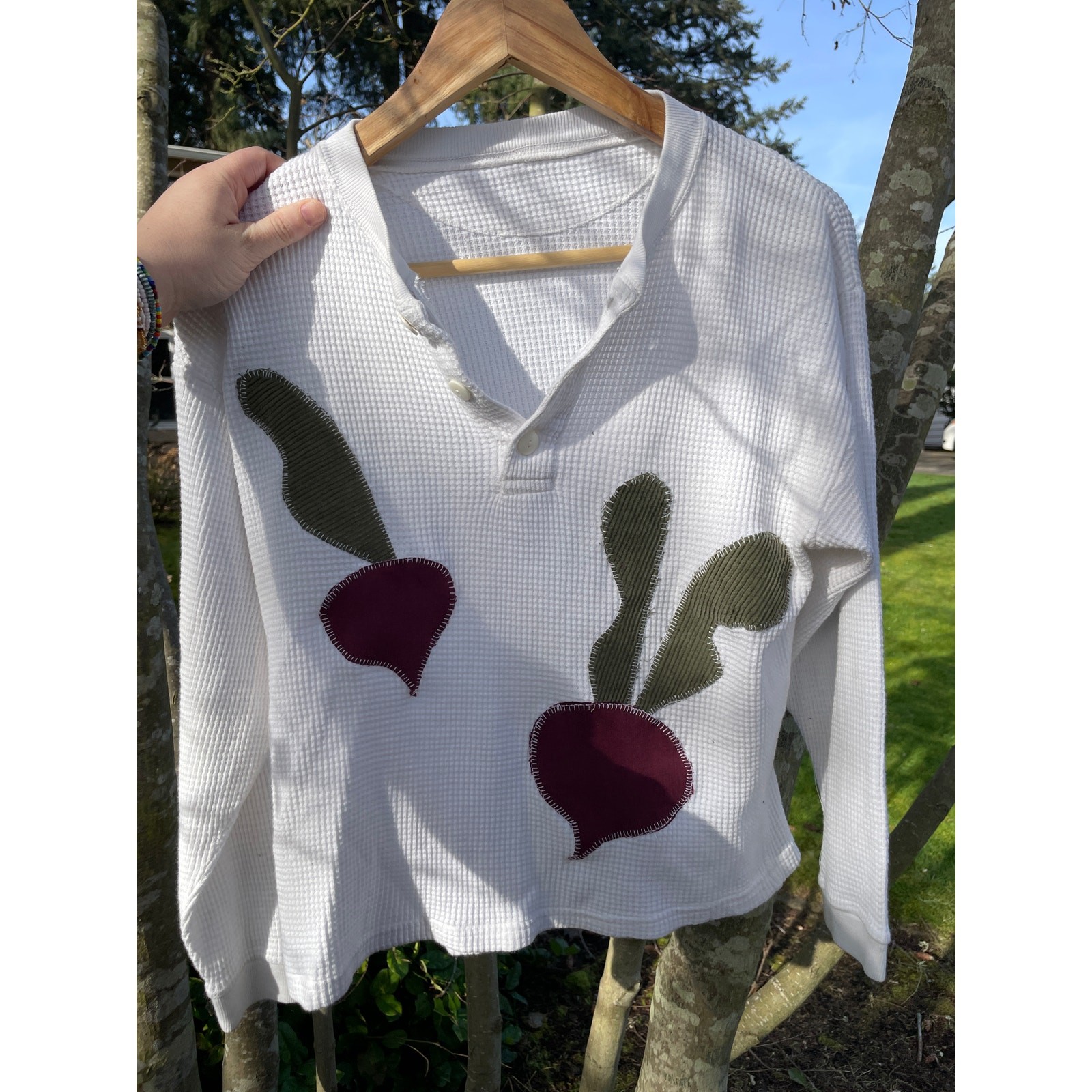 This upcycled white waffle knit shirt features handmade beet appliques.
