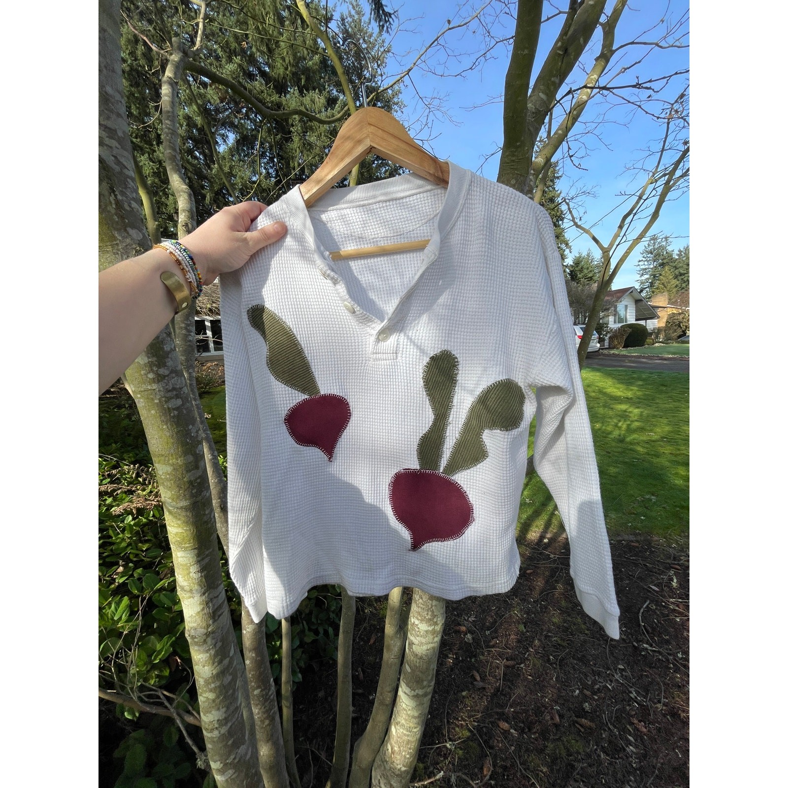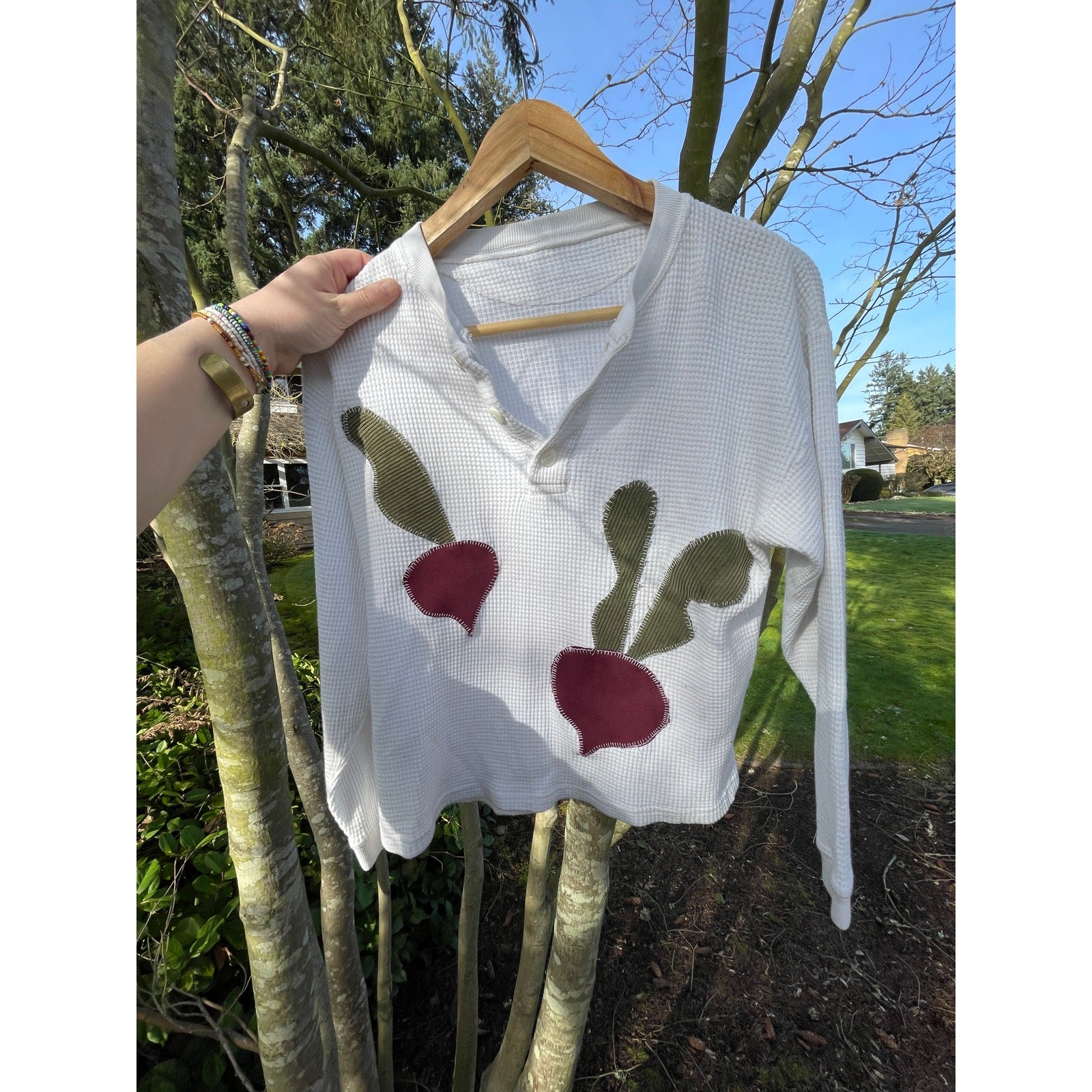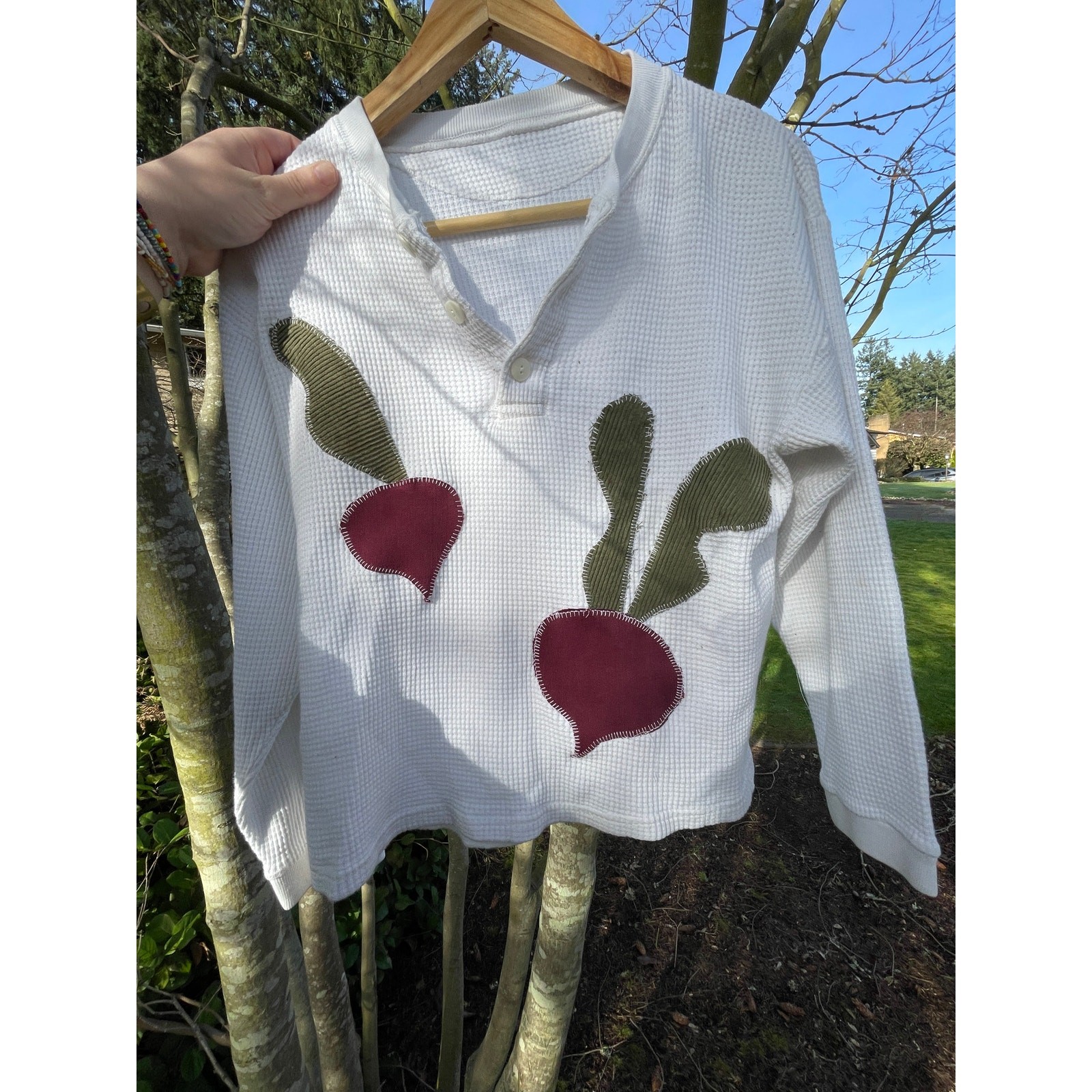 This upcycled white waffle knit shirt features handmade beet appliques.