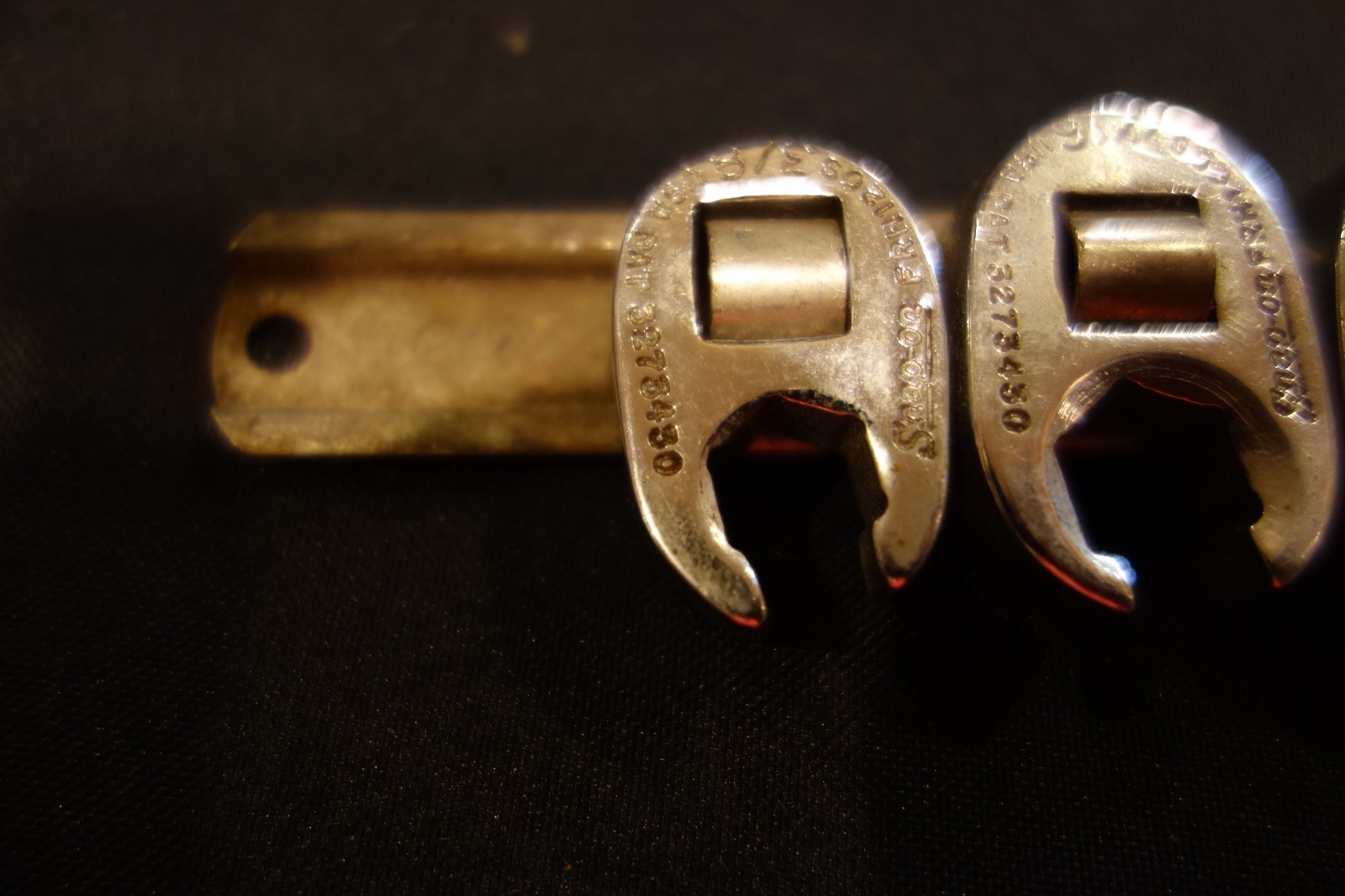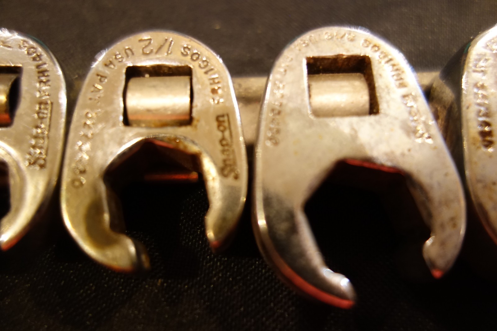 Hi, Up for sale is a set of Snap On Crowfeet flare wrenches. This set includes frhm10, frh120s, frh200s, frh160s, frh140s, frh180s, frh220s, frh240s. These pieces have marks, scratches, dirt, grime, and light rust. Please see photos for actual condition. All of my sales are as-is but take a look at my feedback and you will see that I am a good Ebay seller. I only ship to the Contiguous United States. Thanks for looking.