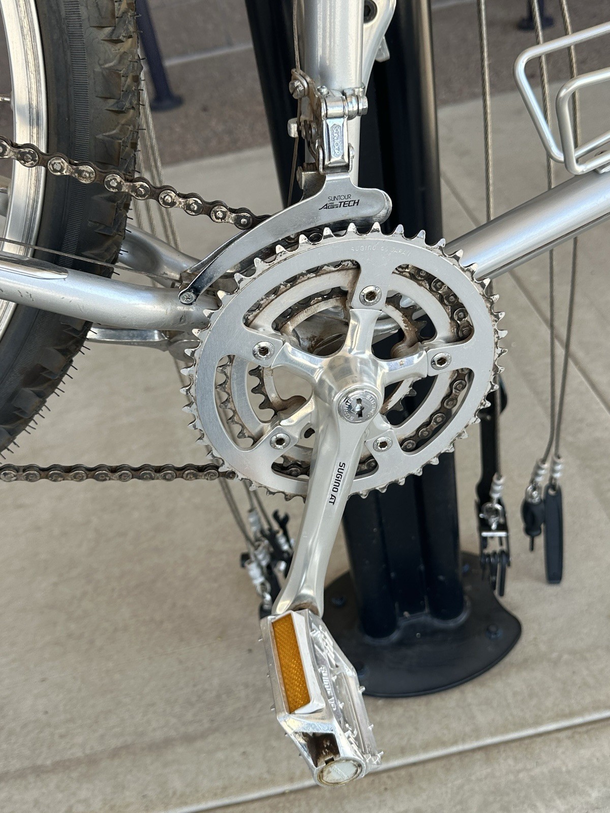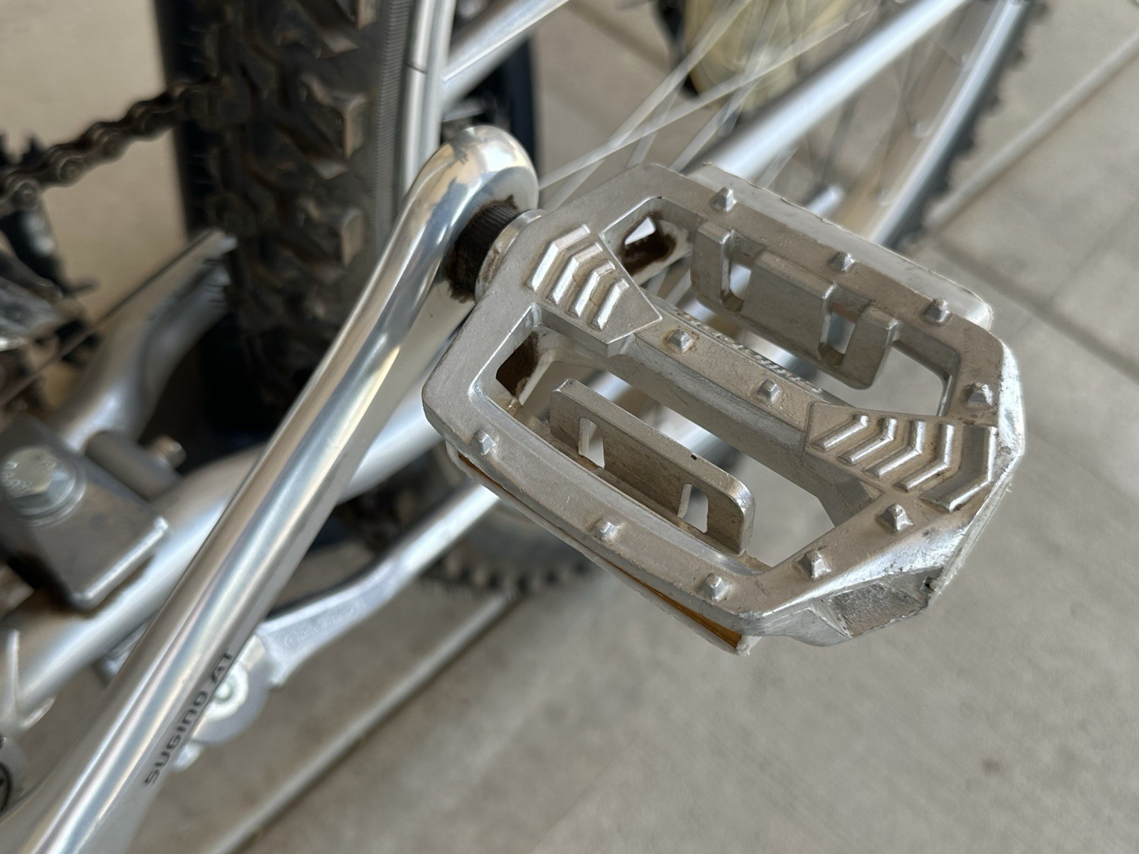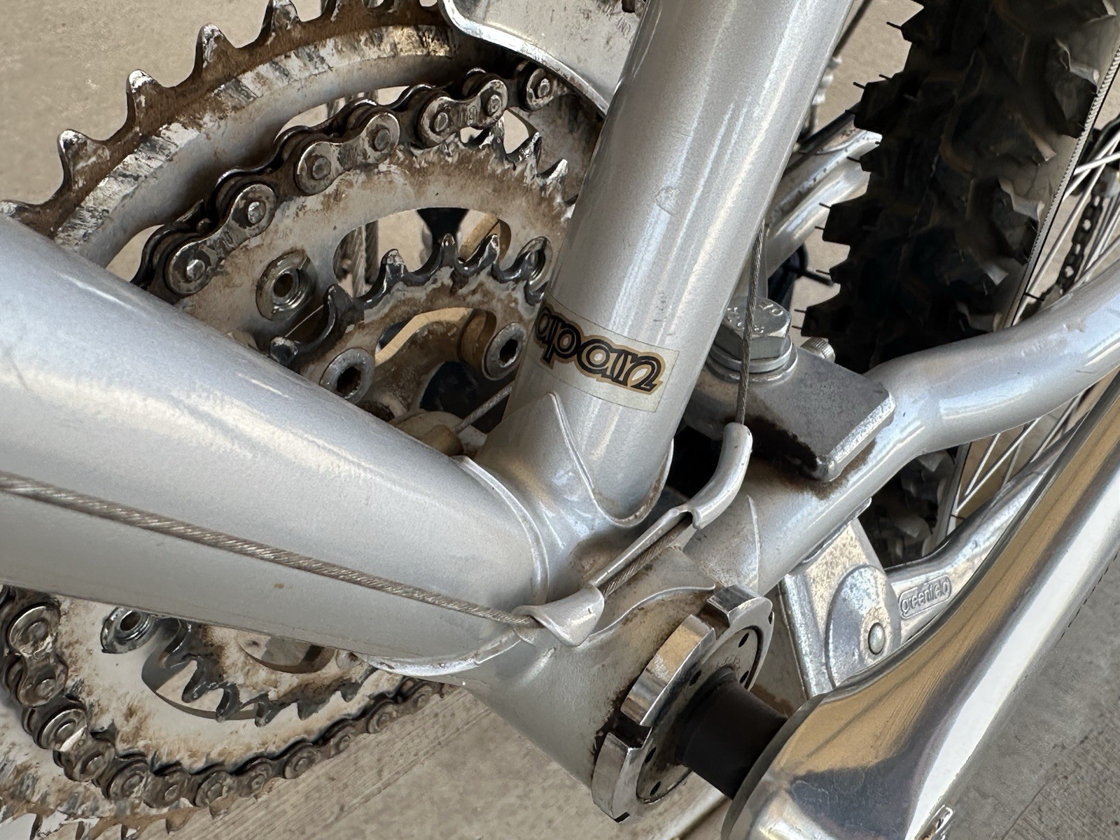Up for sale is an incredible piece of mountain biking history: a 1982/1983 Specialized Stumpjumper in its iconic satin silver finish. This is a remarkably well-preserved "survivor" that has been cherished and well-maintained for over 40 years. This particular frame (Serial #AJ346040) features the highly desirable "Bi-Plane" crown fork, found only on the earliest production models. This bike represents the dawn of the mountain bike era and is a must-have for any serious vintage cycling collection. Mechanical Specifications & Features • Frame: TIG-welded/Lugged Japanese 4130 Chromoly Steel (Hand-built quality). • Fork: Original Lugged "Bi-Plane" Crown (Straight and true). • Crankset: Period-correct Sugino AT (Aero Tour) Triple – The gold standard of early 80s MTB cranks. • Drivetrain: Suntour MounTech rear derailleur and front derailleur. Original thumb shifters. • Cockpit: Original integrated Bullmoose / Sling-shot handlebars with massive Tomaselli-style levers. • Pedals: Original Shimano Flat Bmx Pedals • Saddle: Original Avocet Touring I in fair-good condition. • Brakes: Original cantilever brakes with period-correct pads. Condition Report This bike is in amazing condition for its age. While it shows honest signs of use—commensurate with a 40-year-old vintage machine—it has clearly been well taken care of and stored indoors. • Paint: The silver finish retains a great luster with minimal scuffs. Decals are largely intact and crisp. • Mechanical: Shifting is smooth and the braking is firm. The Sugino AT crankset is in beautiful shape. • Wear: No major dents, dings, or structural issues. Minor surface patina consistent with light use. Shipping & Handling The bike will be partially disassembled and professionally packed to ensure safe transit. I recommend a basic tune-up/safety check before hitting the trails, as the grease and components are vintage.