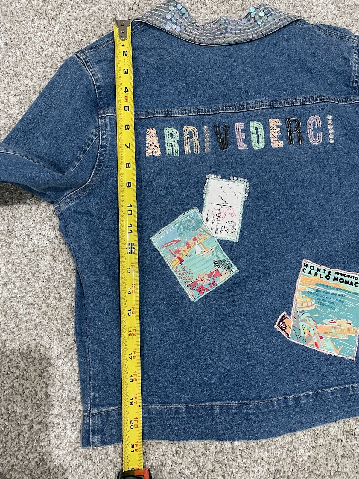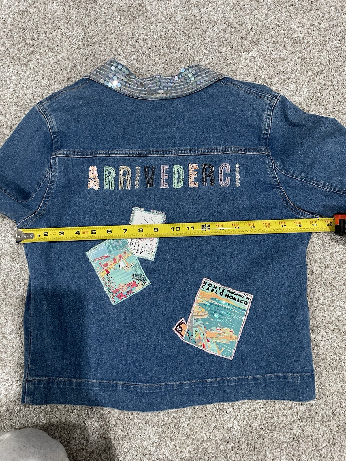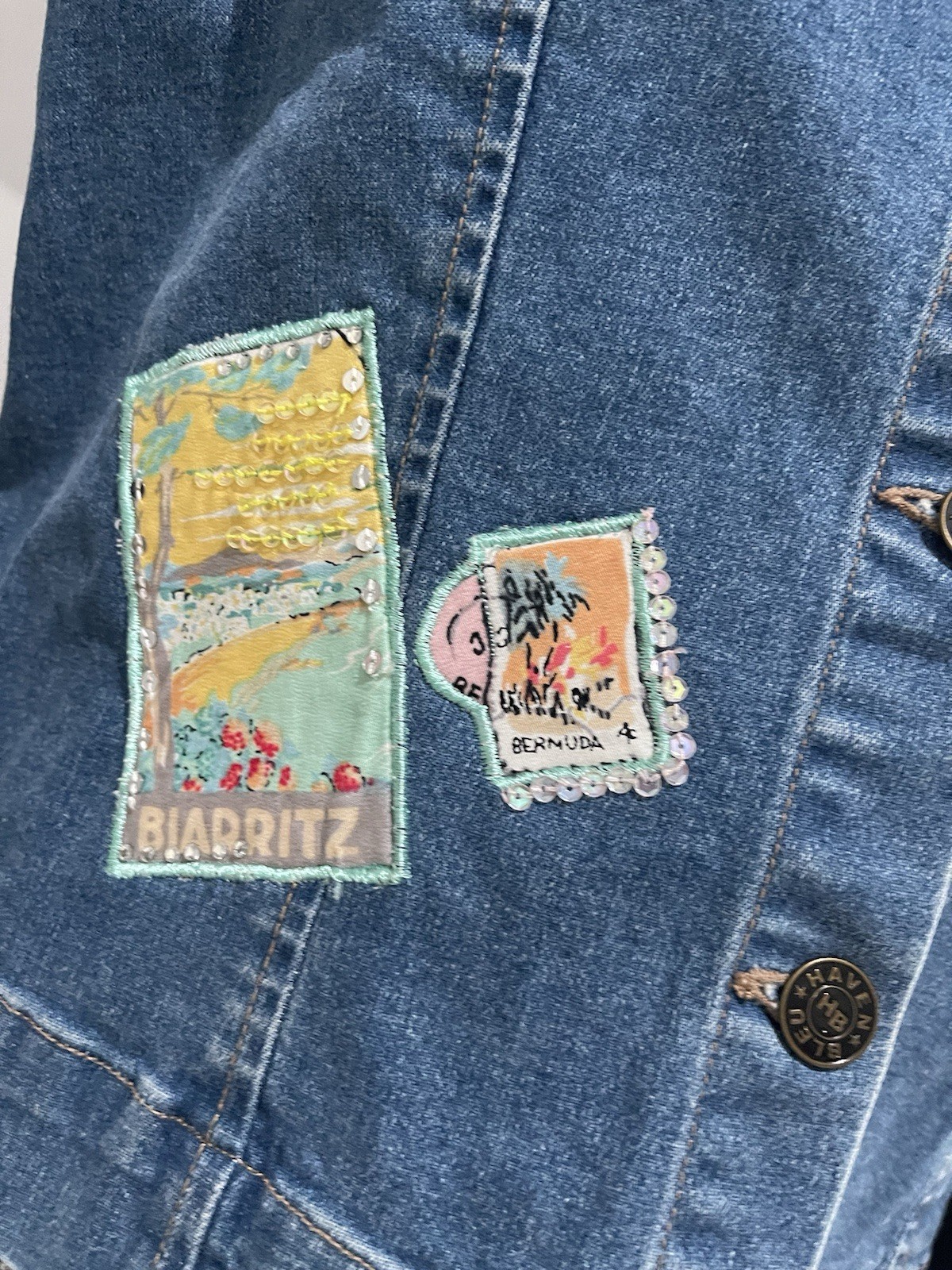 Are you set for your inaugural spring excursion of the new year? Kick-start it impeccably with this fantastic, lightweight upcycled denim jacket, boasting a sequined collar and an assortment of travel-inspired patches, notably the 'Biarritz' emblem. The patches signify ties to sundry travel destinations, with 'Biarritz' referring to a seaside town in France's Basque Country, esteemed for its shores and fashionable standing dating back to the 1800s. Other patches feature postcard-style depictions of diverse locations. Will you become the next owner of this exceptional jacket?