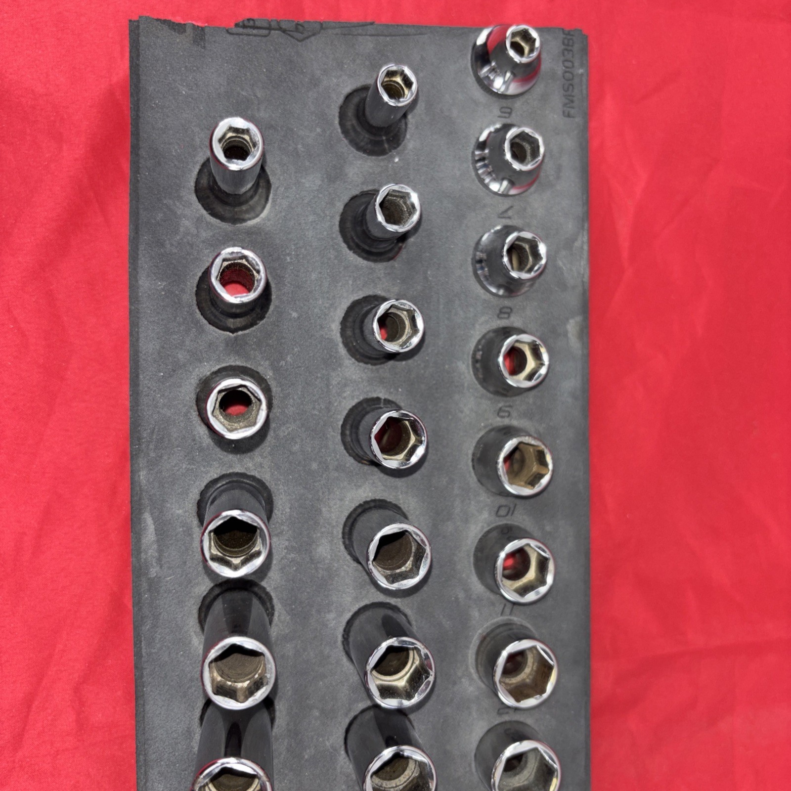 Snap on 45 piece 6 point 3/8”” inch drive socket set. The foam has been cut to only accommodate the 45 sockets. All 6mm-20mm.