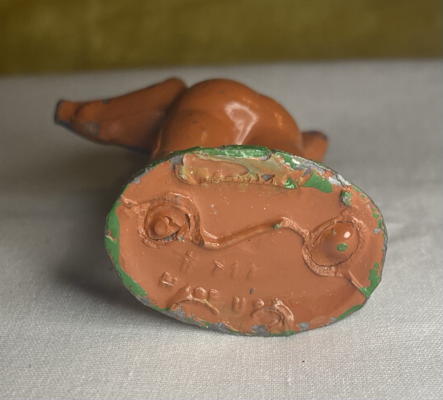 The 1930's Barclay Lead Indian Brave Figurine with Rifle, marked #717, is a vintage collectible toy made in the USA. This 3.25" figurine depicts a Native American character, reflecting the historical and cultural significance of the era. With its classic design and authentic craftsmanship, this piece is a valuable addition to any vintage toy collection, showcasing the artistry and quality of toys from the 1930s.