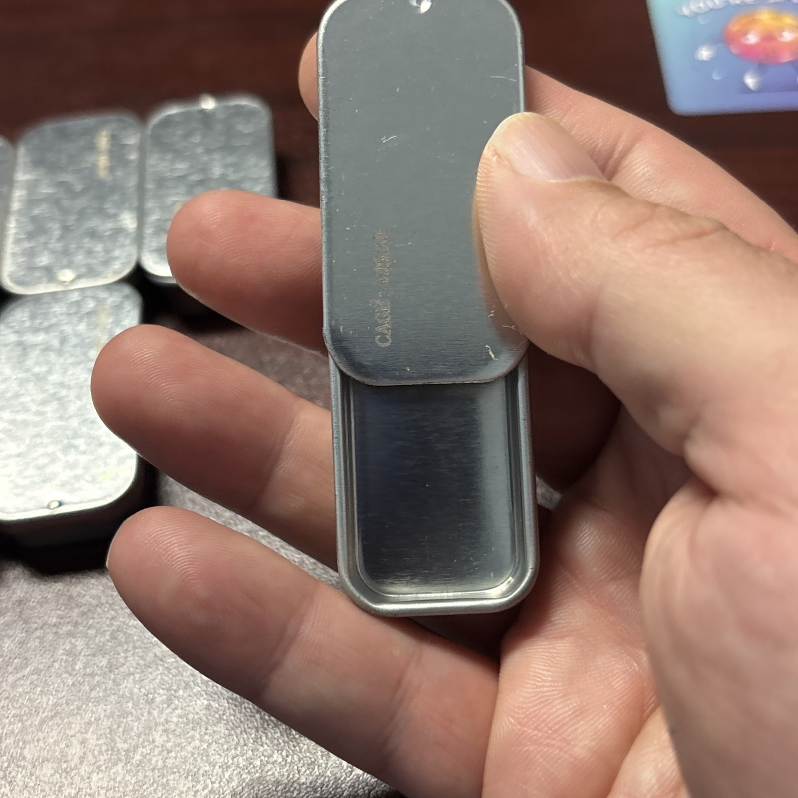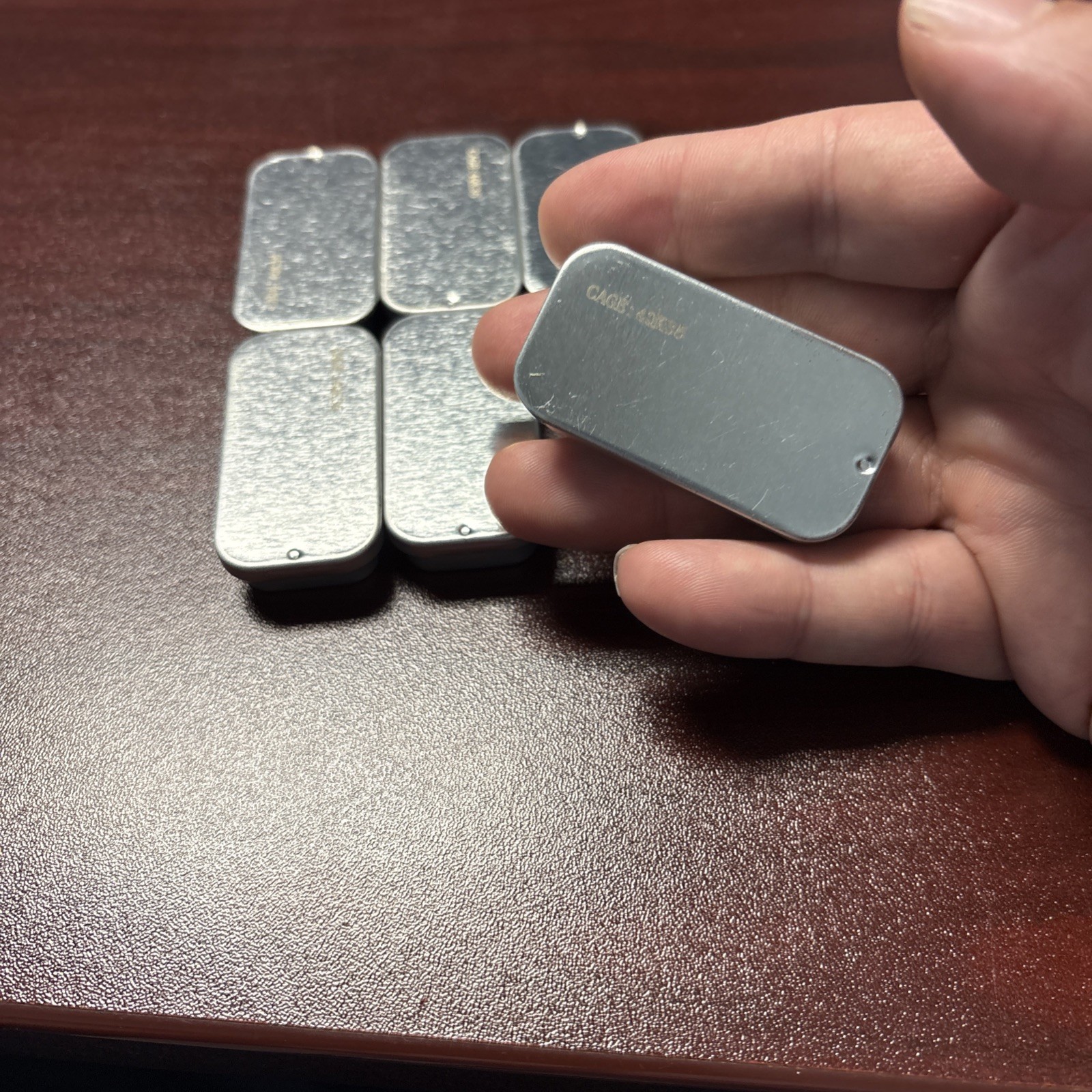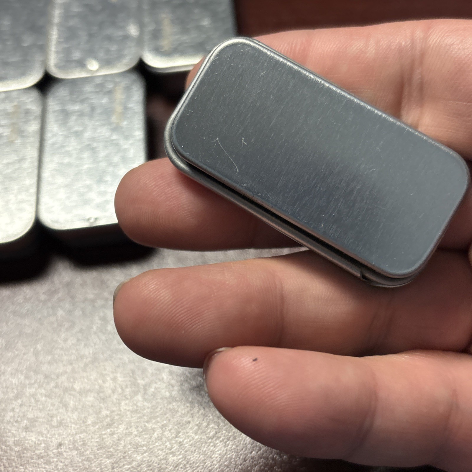 The sliding top mini food grade steel, candy boxes are great to store pills, spare parts, tools, EDC & survival kits. Some folks even use them to construct electronic projects. These handy boxes measure 2.05" x 1.10" x .45". They are 2.5 times the weight and thickness of similar size tins.