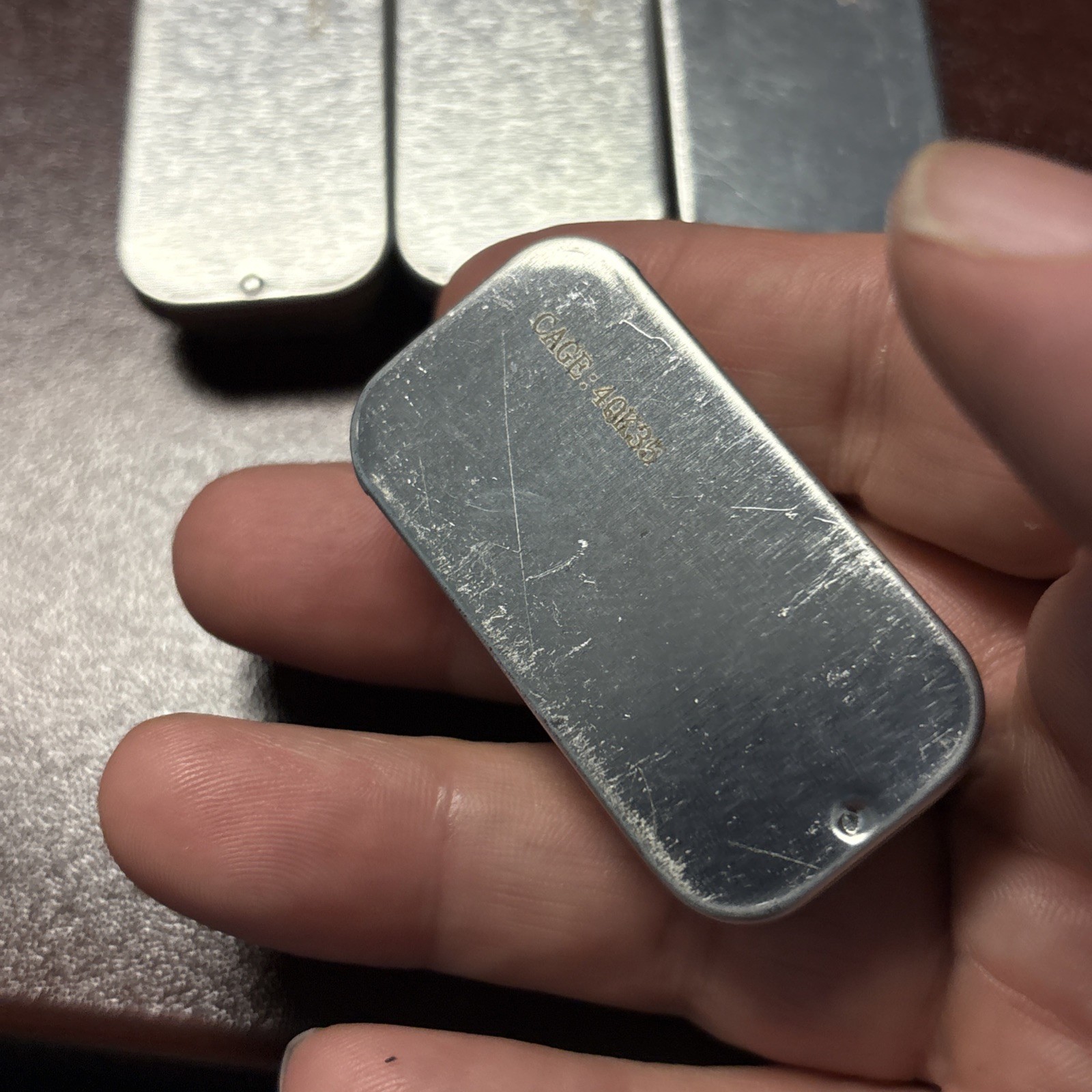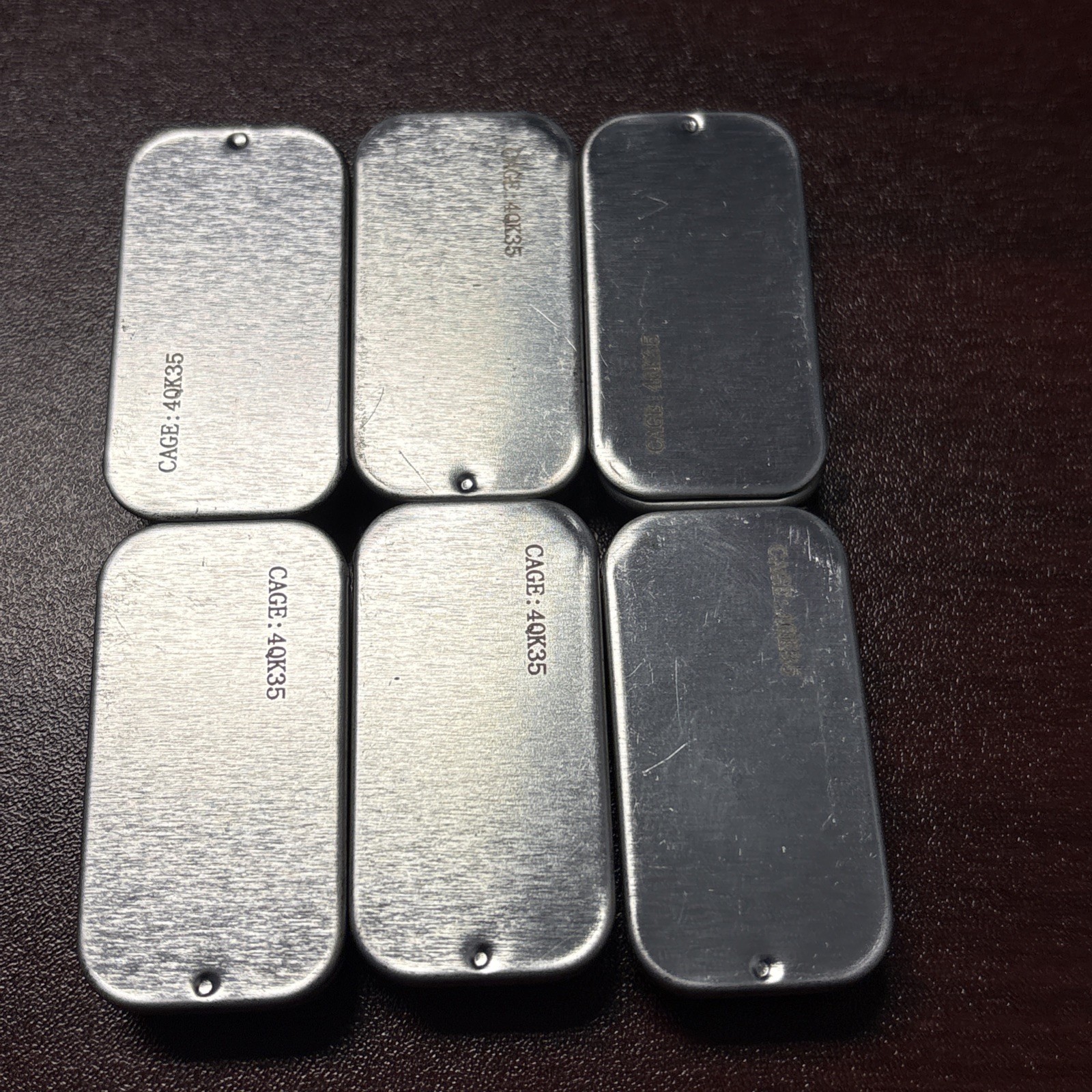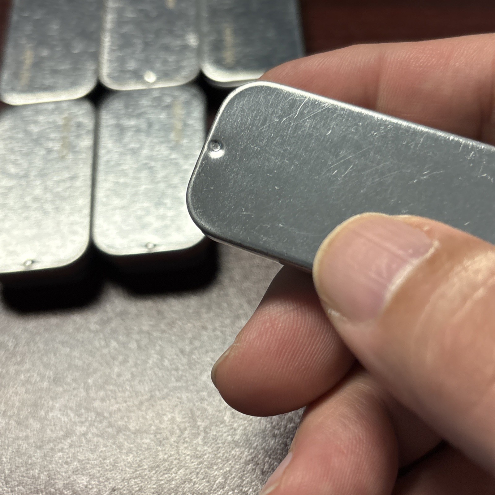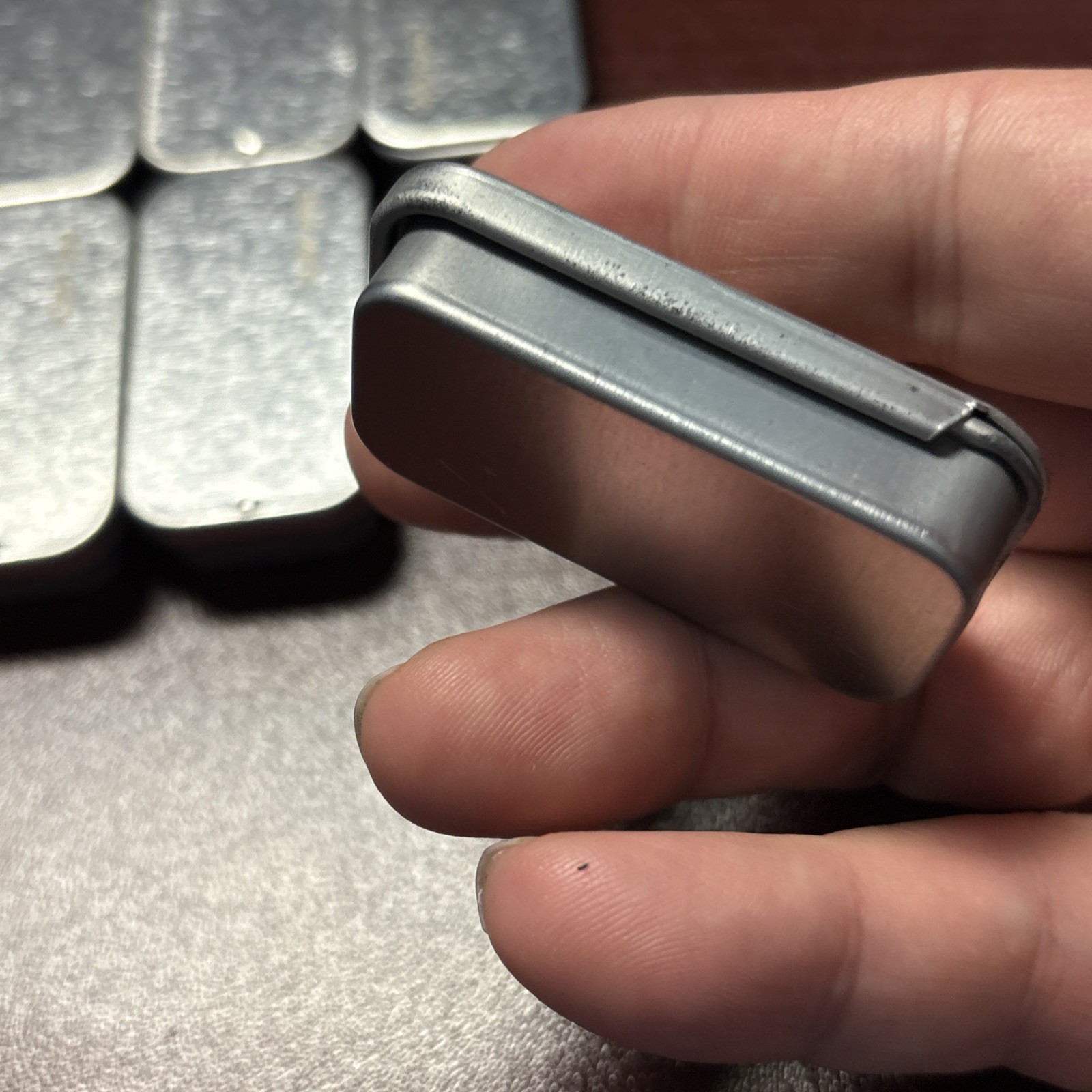 The sliding top mini food grade steel, candy boxes are great to store pills, spare parts, tools, EDC & survival kits. Some folks even use them to construct electronic projects. These handy boxes measure 2.05" x 1.10" x .45". They are 2.5 times the weight and thickness of similar size tins.