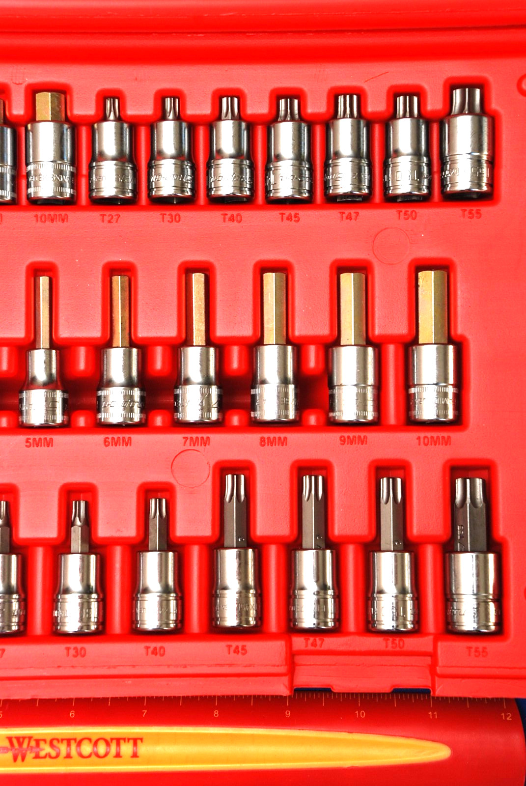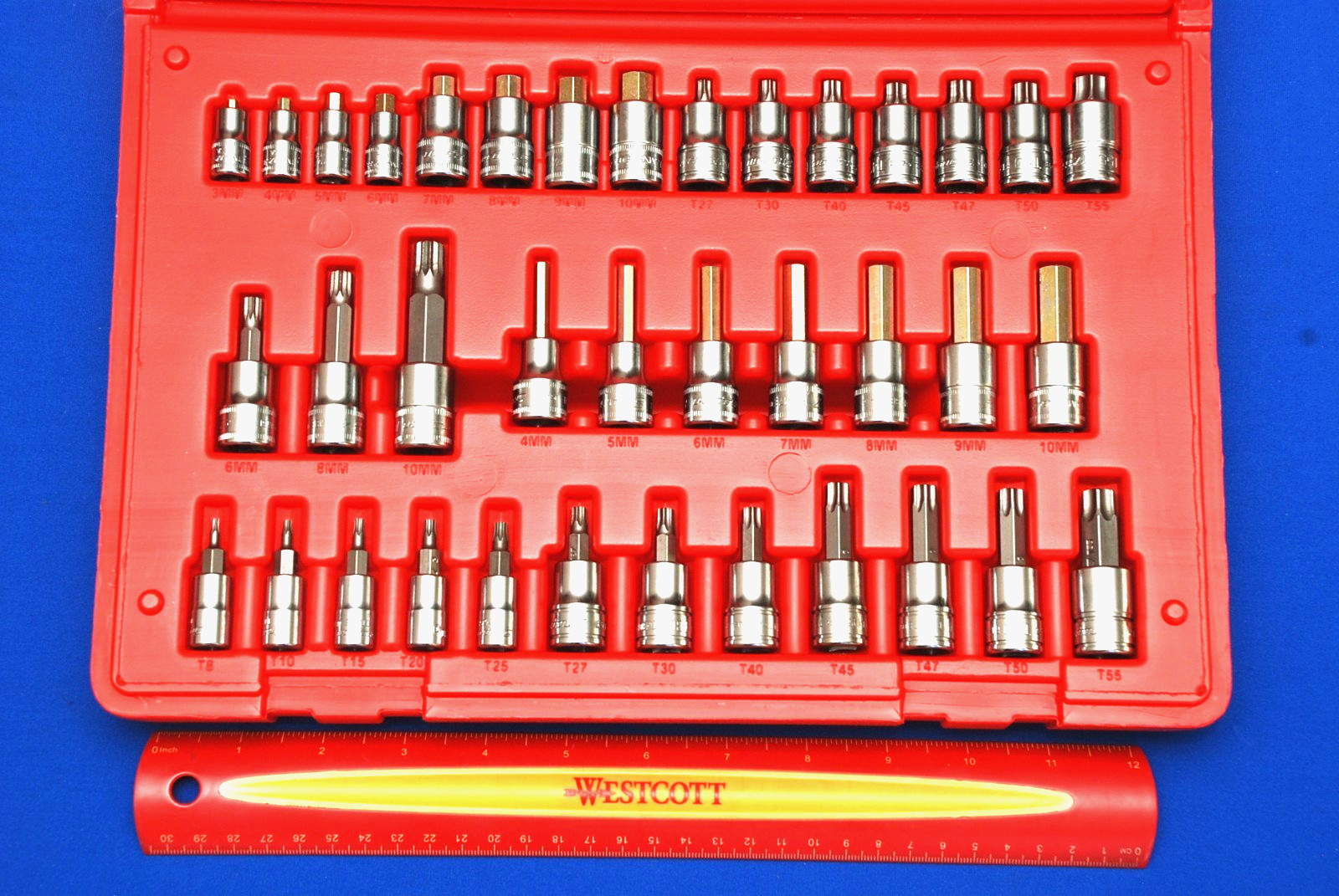 • Includes (5) 1/4" Drive Standard TORX Bit Sockets, (7) 3/8" Drive Standard TORX Bit Sockets, (7) 3/8" Drive Stubby TORX Bit Sockets, (3) 3/8" Drive Triple Square Drivers, (7) 3/8" Drive Metric Hex Bit Sockets, (4) 1/4" Drive Stubby Metric Hex Bit Sockets and (4) 3/8" Drive Stubby Metric Hex Bit Sockets in a storage case