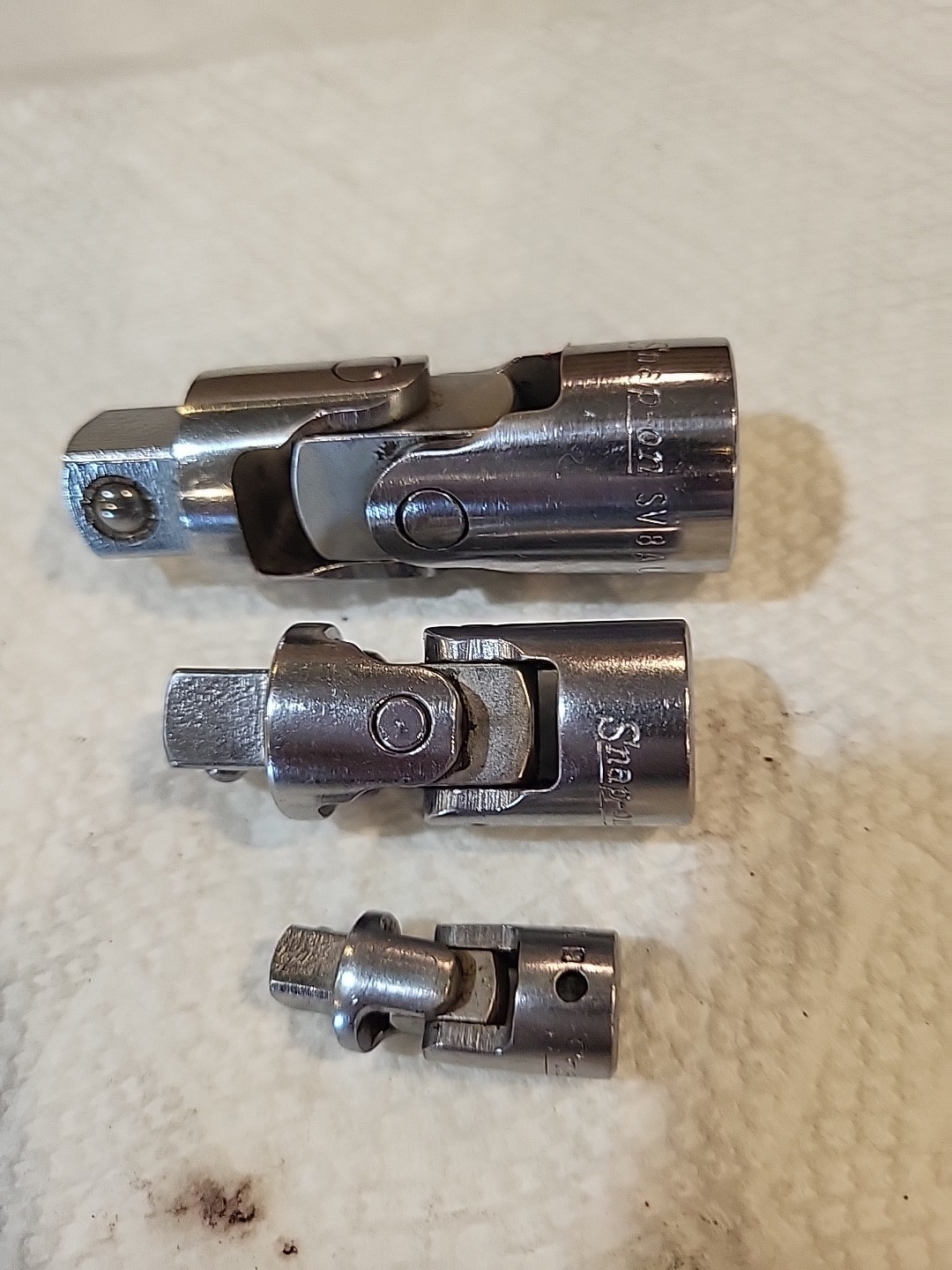 Snap On Tools 3Pc 1/4" 3/8"& 1/2" Drive Universal Swivel Socket Adapter Set. Set includes: 1/2" SV8A, 3/8" FV8, and 1/4" TMU8. In EXCELLENT Pre-owned Condition!! 🔥 Please refer to pictures.