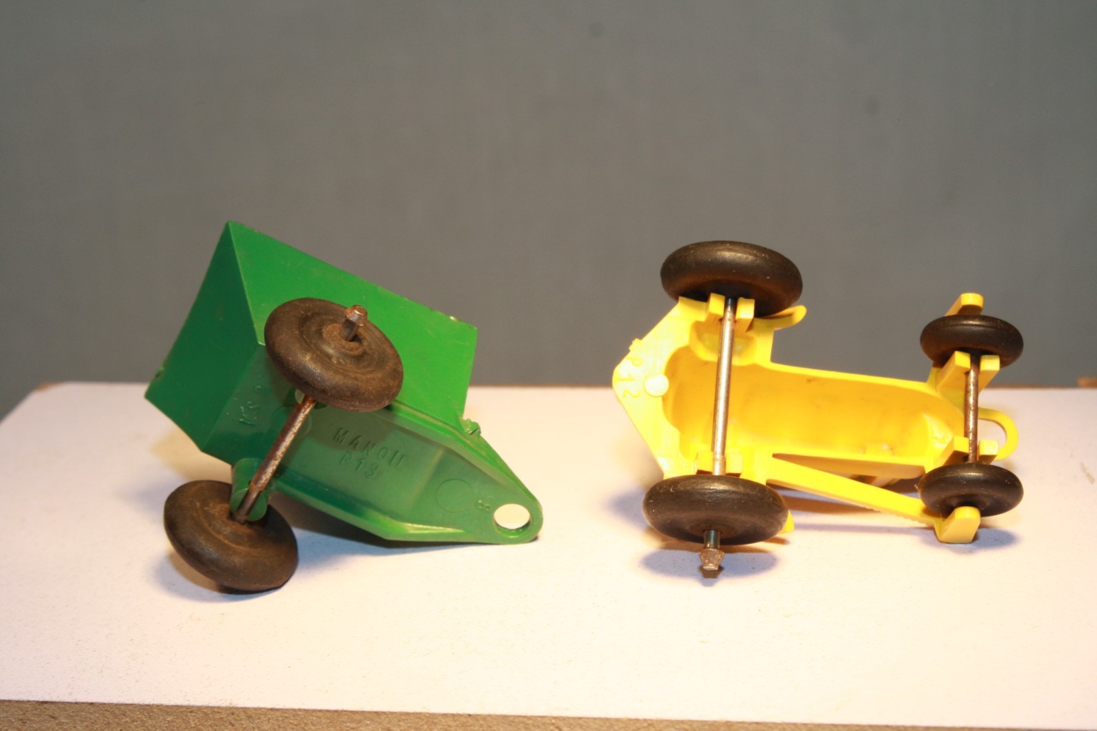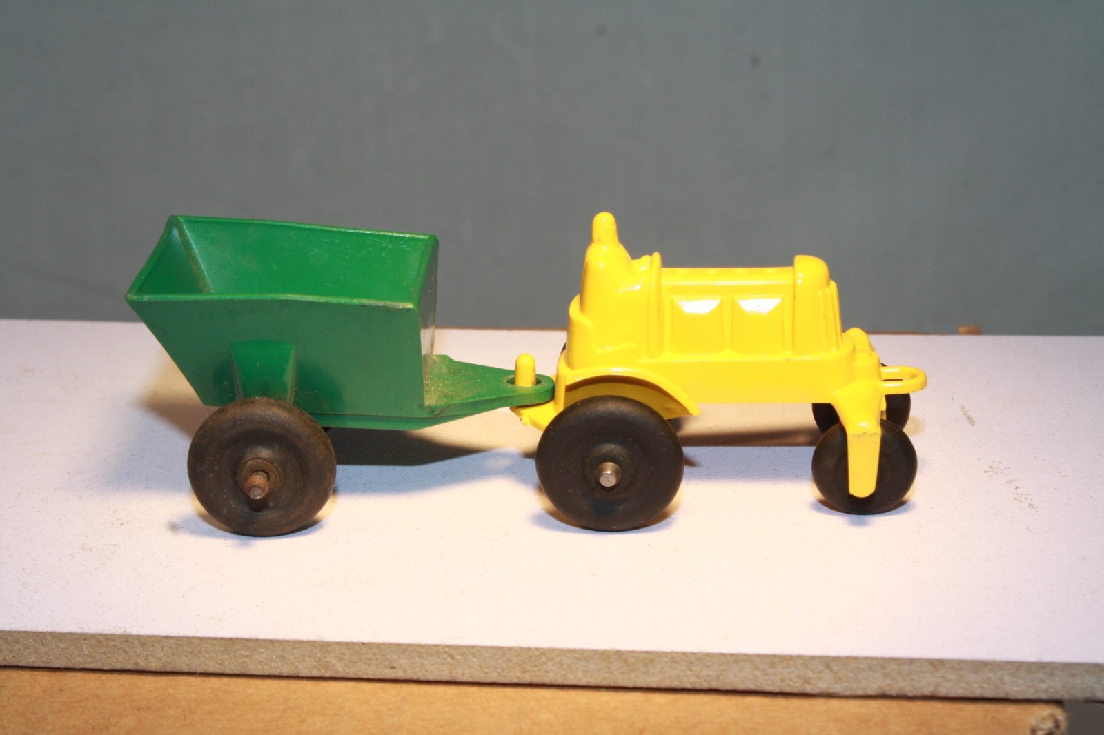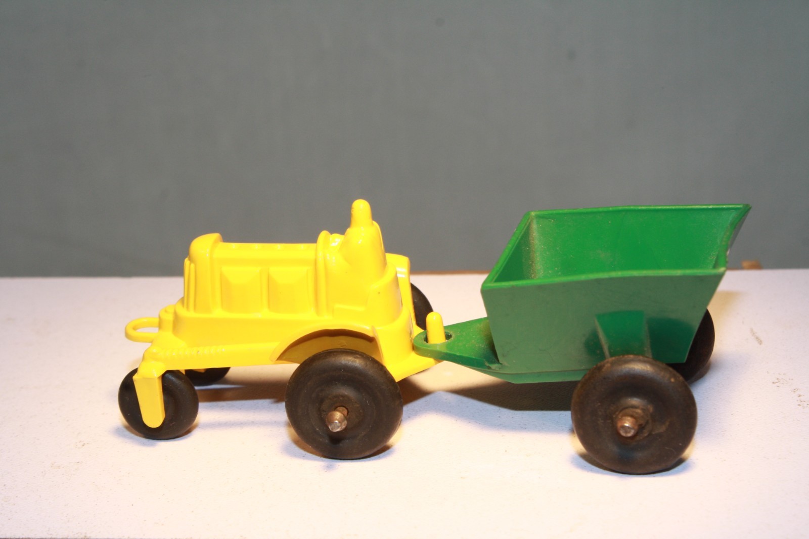 This auction is for a plastic farm tractor, trailer and various farm supplies and accessories. This toy set was made in the USA during the 1950s by Marx. The tractor is yellow and the trailer is green. Both toys have black wheels. The tractor measures 4 in. long and the trailer is 5 in. long. Each toy is in excellent condition. I combine shipping for multiple purchases.