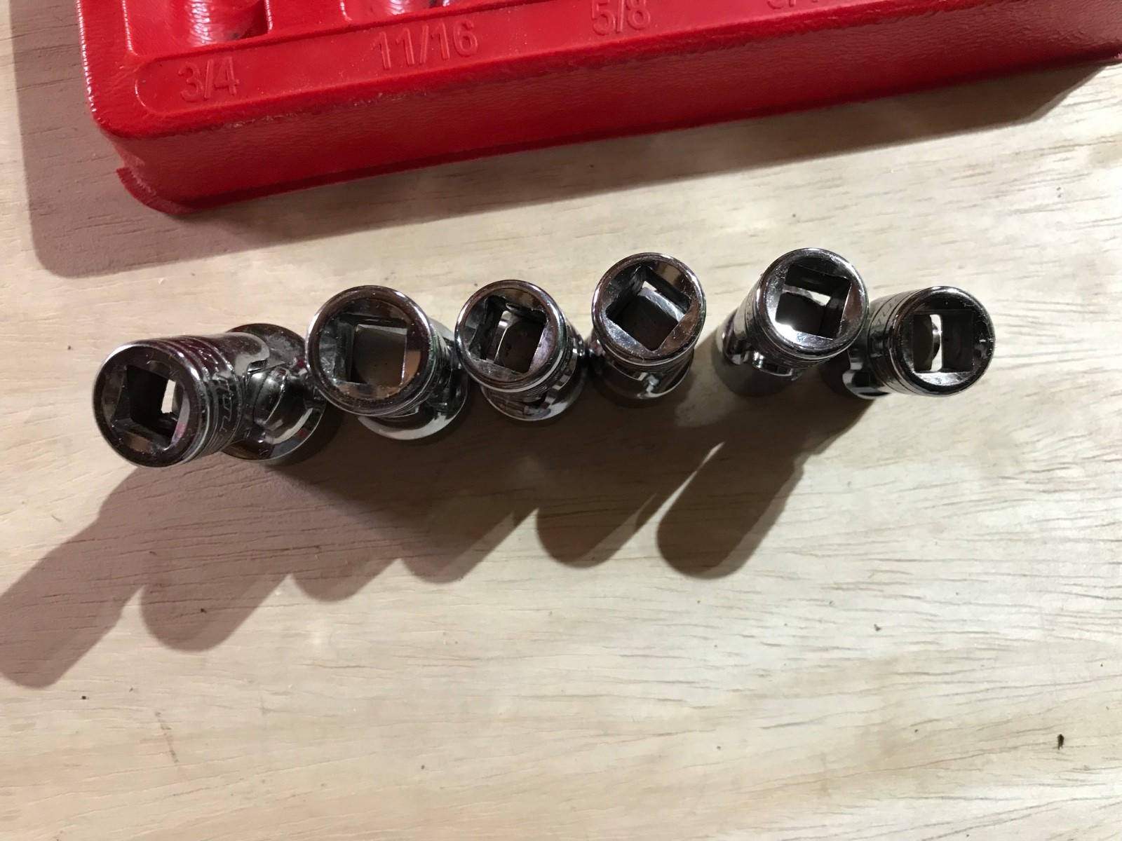 Up for sale is a Snap On 6pc swivel shallow 3/8" drive socket set show signs of light to no use all in very nice condition 7/16" to 3/4" see pics Please read Snap-On, Mac & Matco tools as they are the manufactures of the tools I make no claims as to warranty and do not represent the manufactures in any way. The Snap-On, Mac & Matco names and model numbers are used only to verify the maker and to identify the tool itself as being authentic. Please look at all photos closely as pictures are part of the description. If you have any questions on the item listed or shipping, please contact me first via email. Be sure to add me to your favorites list!!! ~Check out my Feedback, Sale Items & other Auctions~ ~Thank you for viewing my items~