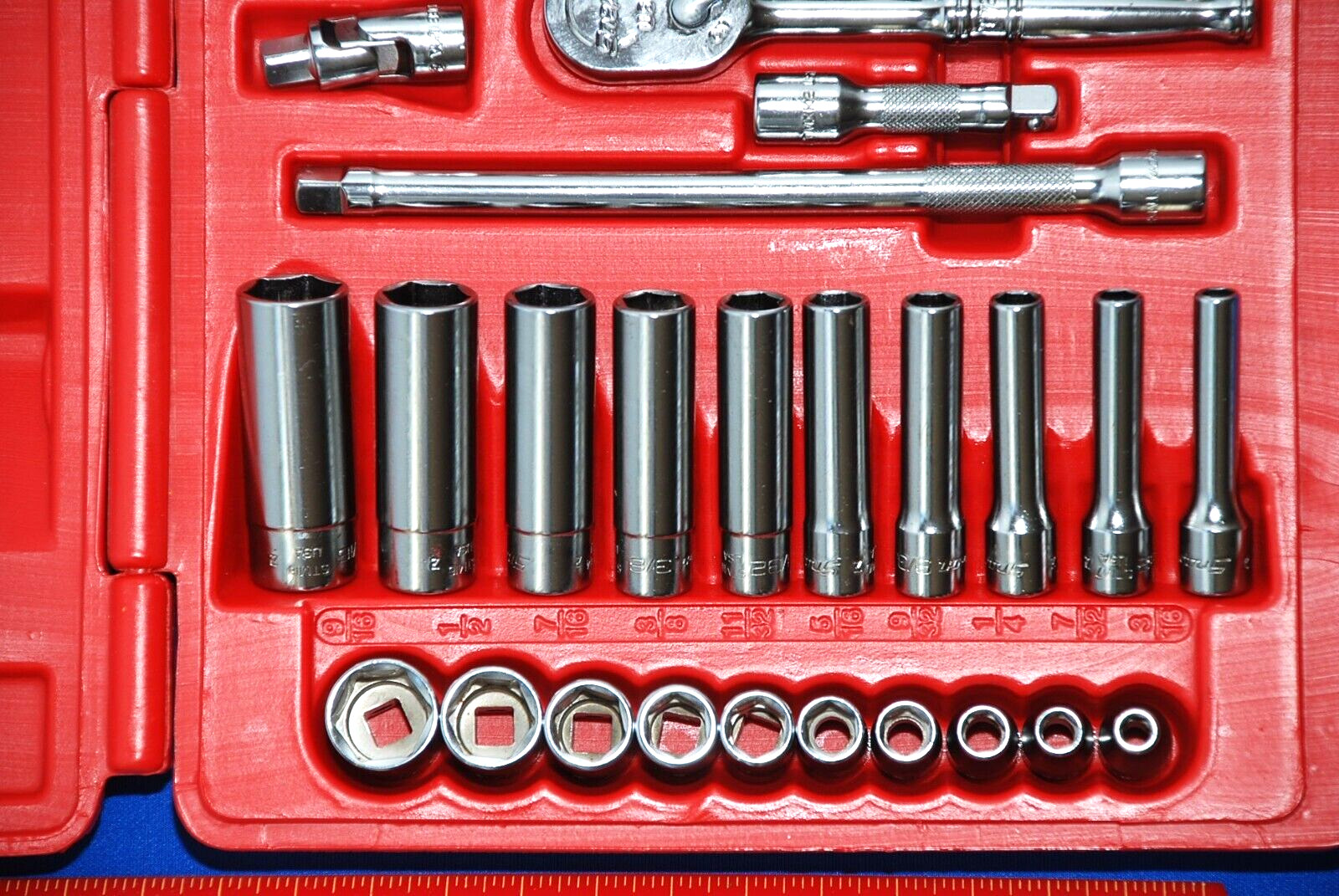 The set Includes (40) SAE and Metric Shallow and Deep Sockets, 2" Extension, 6" Extension, Universal Joint and T72 Ratchet in a blow-mold plastic storage case.