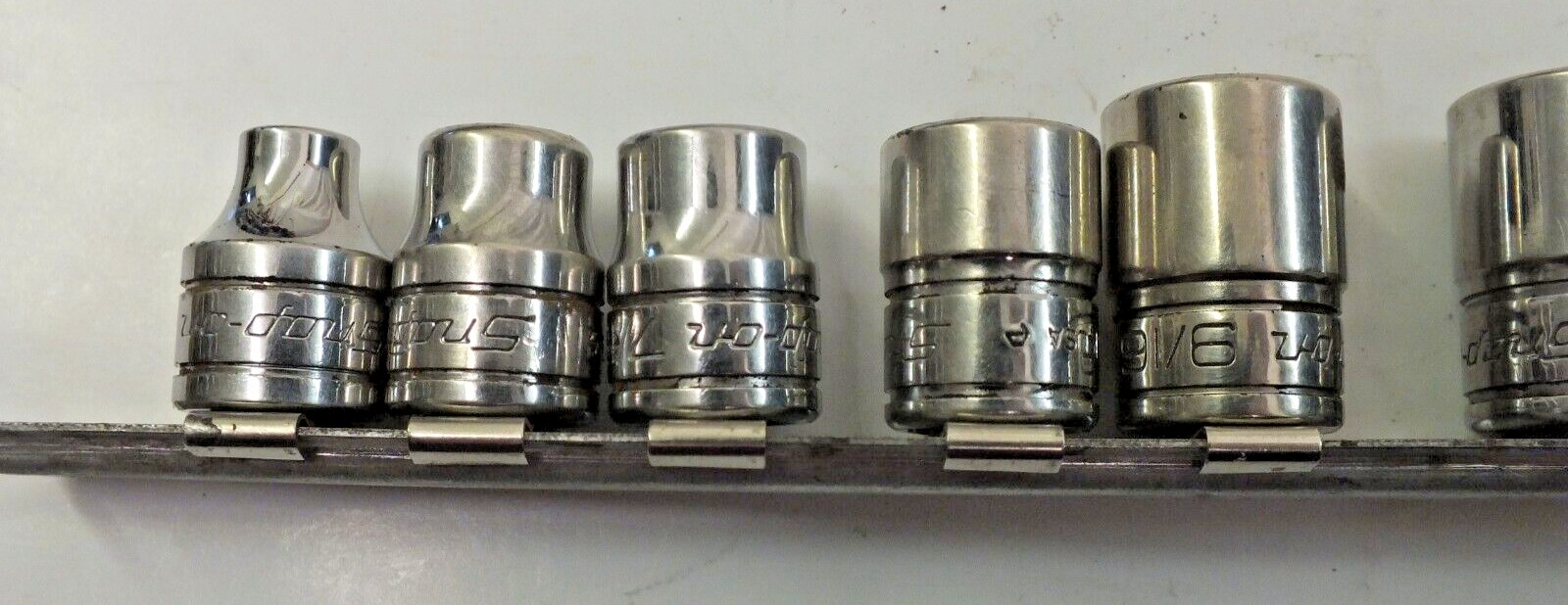 Snap-On 9 piece 3/8" drive 6 point shallow socket lot. SAE sizes 1/4"- 7/8". Model set number 211FSY. Originally an 11 piece set but is missing the FS241 and FS101 sockets. Date codes stamps are NOT matching, so pieces may have been upgraded/replaced over time or just purchased individually from the start. Includes: FS281 7/8", FS261 13/16", FS261 13/16", FS221 11/16", FS20 5/8", FS181 9/16", FS161 1/2", FS141 7/16", FS121 3/8", FS081 1/4". Pre-owned. Do have some cosmetic wear to their finish from use and being jumbled in with other tools. Have been wiped down to remove any surface dirt but do still have dirt and grime on the insides. May clean up better with a bit of soaking and/or scrubbing. Includes a Snap-On storage strip, but it is very worn. Please see our photos.