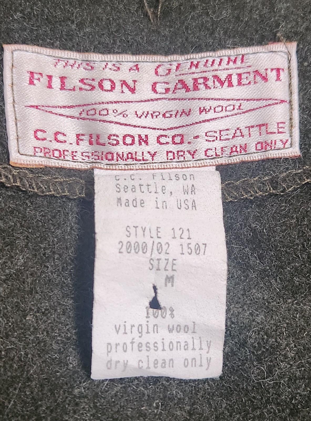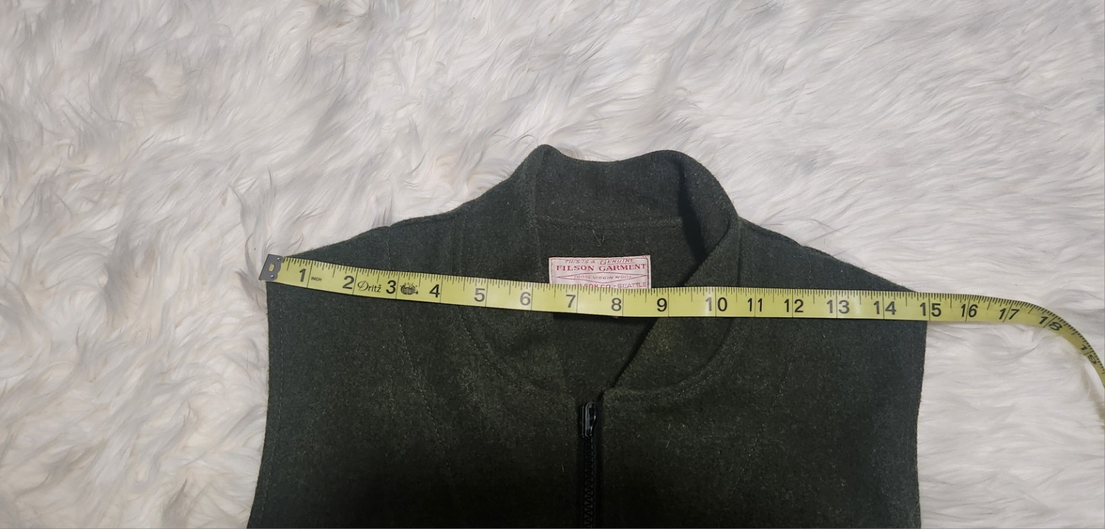 C.C. Filson Co. Men's Large 100% Virgin Wool Forest Green Vest Liner is a high-quality and stylish garment made in the USA. This solid green vest features a zip closure, perfect for casual and workwear occasions. It is crafted from wool providing both warmth and durability. With a vintage style and regular fit, this vest liner is ideal for hunting activities during the winter, fall, and spring seasons. The Filson brand ensures a classic and timeless look, making it a versatile and practical addition to any man's wardrobe. Used condition, lint.