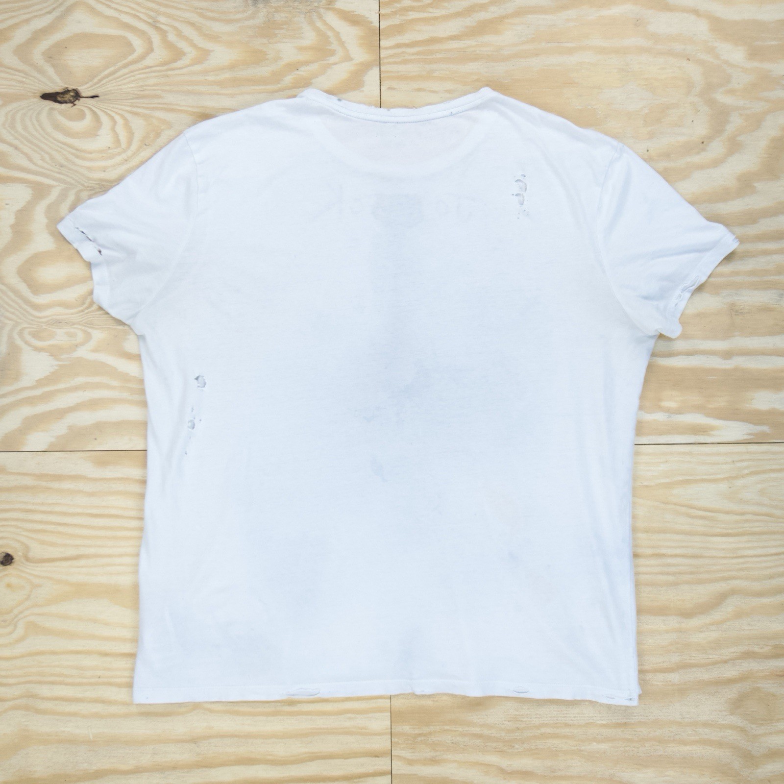 Hand distressed with an intentional peekaboo cutout that hits exactly where it should. Raw edges, controlled chaos, and a silhouette that turns a basic tee into a statement.