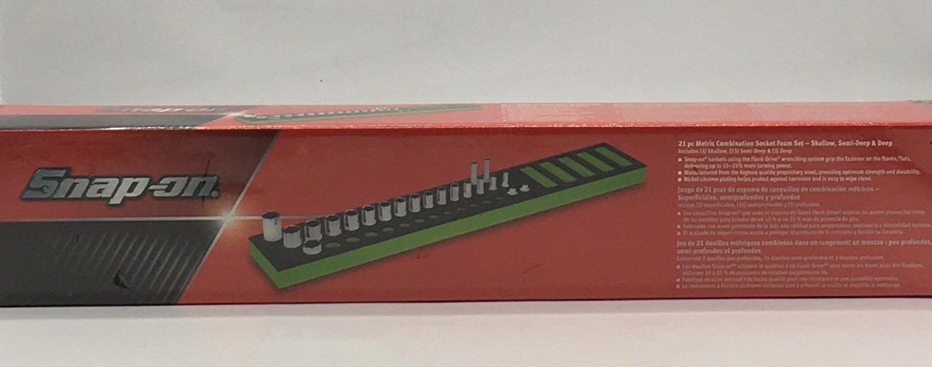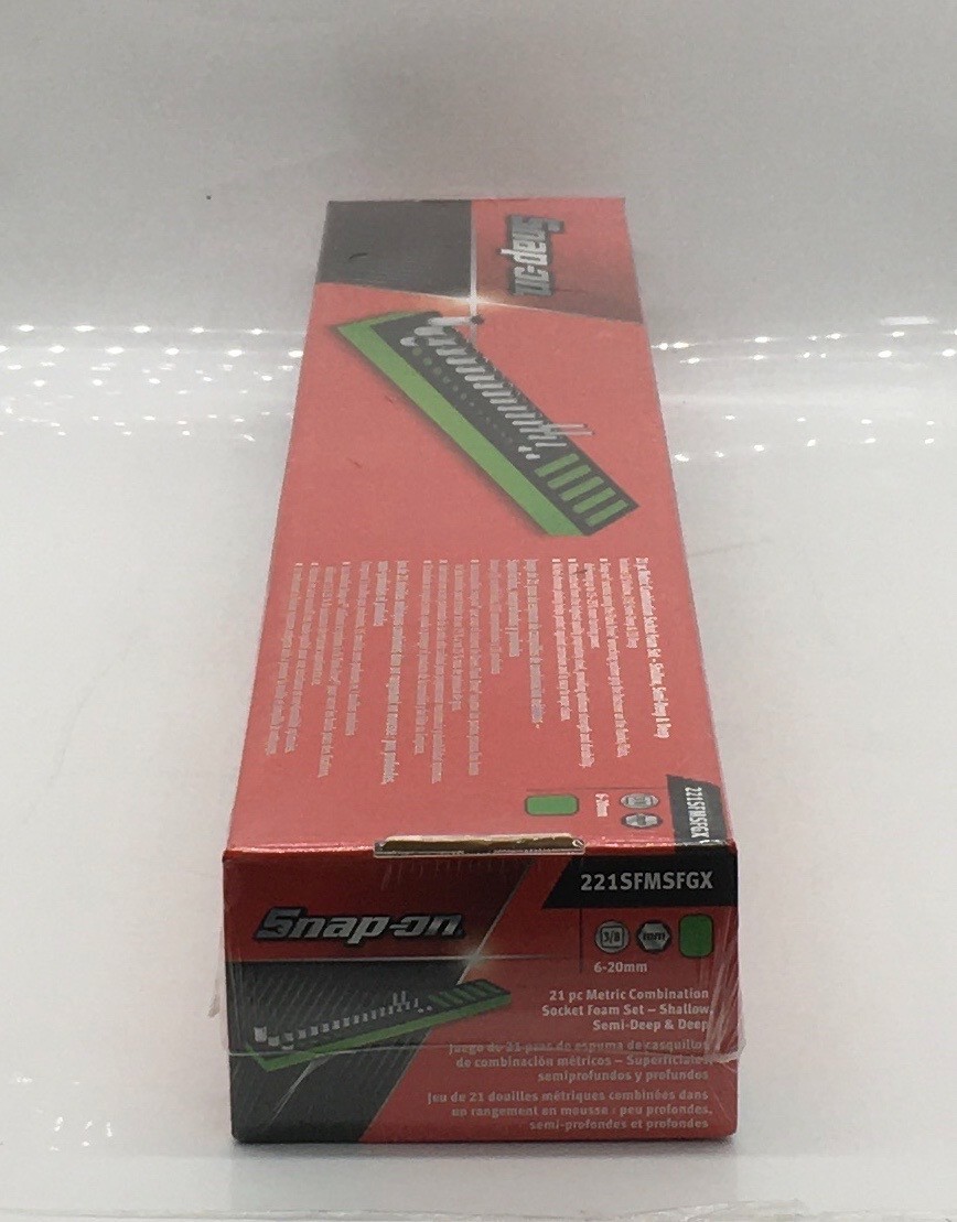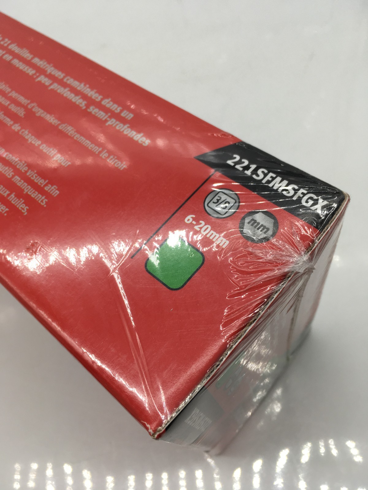 This is a brand new, unopened Snap-on 221SFMSFGX socket set featuring 21 pieces of high-quality 3/8" drive metric sockets. The set remains in its original shrink wrap, ensuring it is unused and preserved in factory condition.