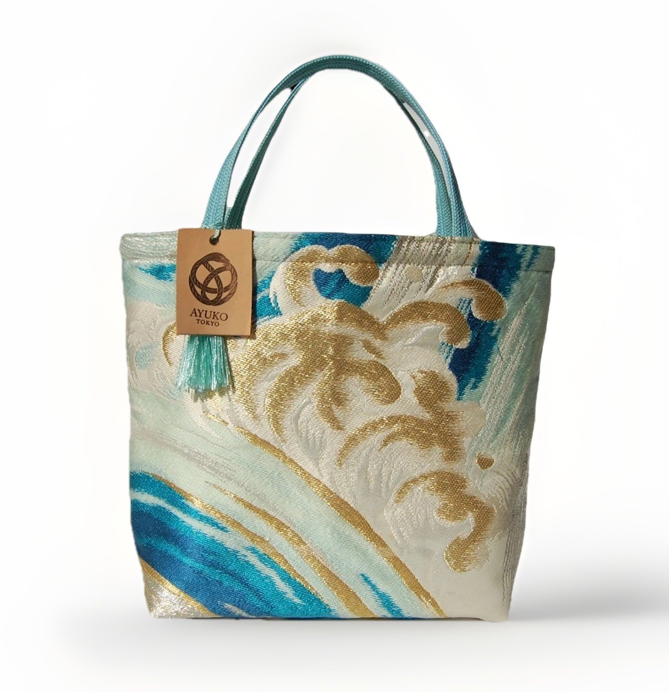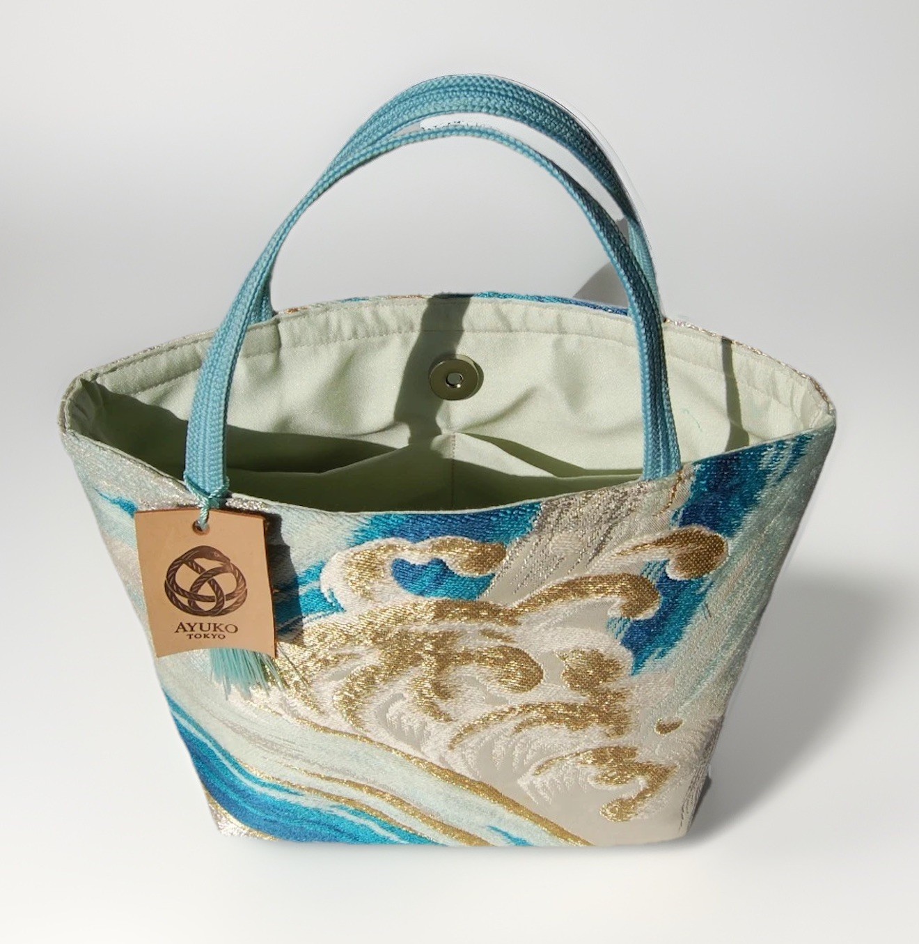 🧵 Materials • Outer: Vintage fukuro obi (100% silk with metallic threads) • Handles: Vintage obijime cords • Lining: Coordinated inner fabric • Structure: Full firm interfacing throughout • Base: Inserted board for extra stability • Closure: Magnetic snap closure • Inner pocket: 1 compartment sized for phones or cards • Tag: Individually color-matched from nearly 100 shades of premium Japanese leather