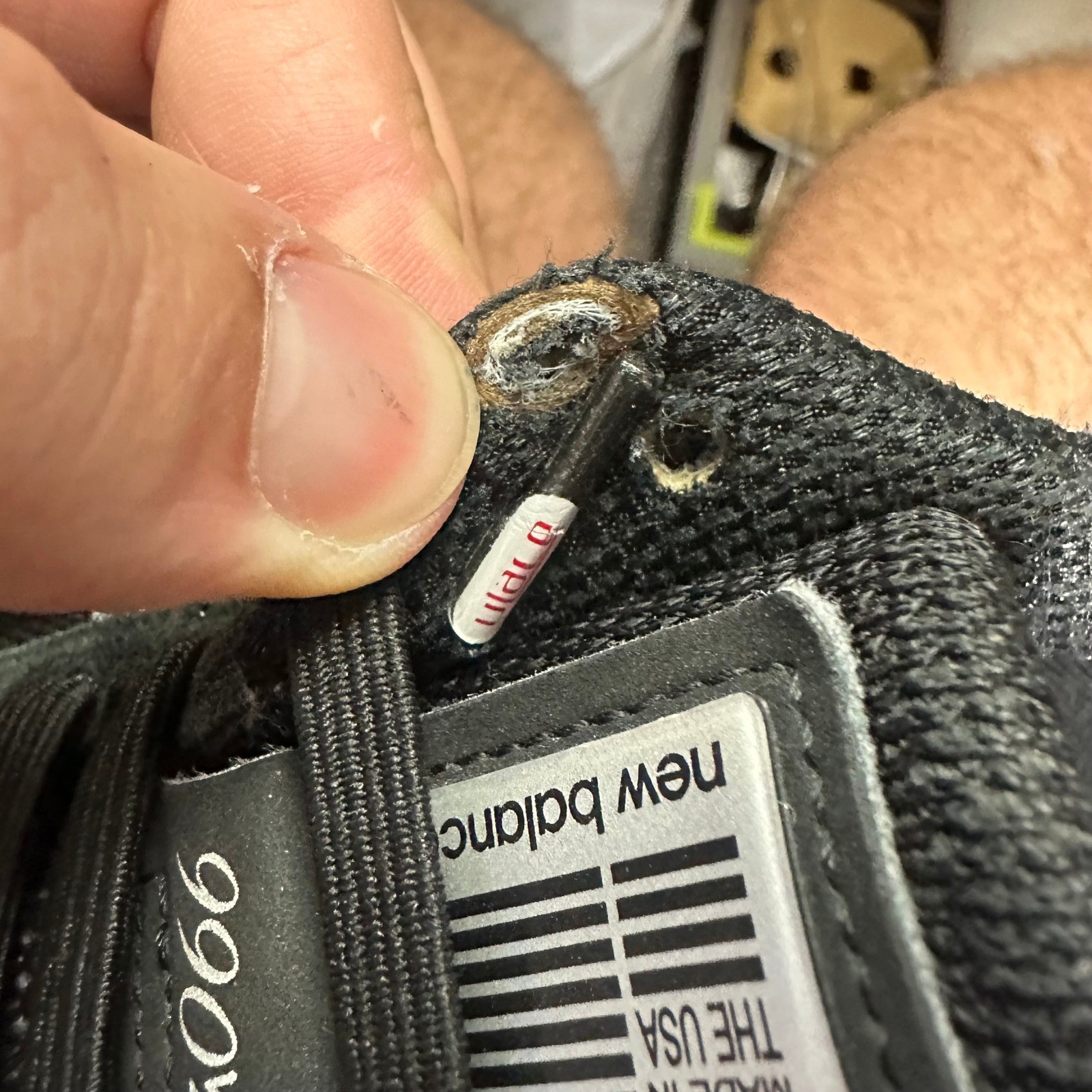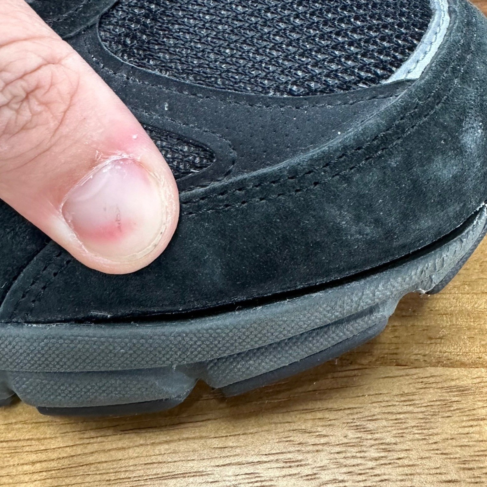 Has replacement laces. Some tiny rips on the insides as well. See pictures. Right shoe has a spot on the side peeling as well. Brand: New Balance Model: 990v4 Style Code: W990BK4 Color: Black/Silver Material: Suede/Mesh Closure: Lace Up Midsole: ENCAP Outsole: Rubber Country of Manufacture: USA Features: Reflective Accents, Breathable Mesh Toe Shape: Round Toe Heel Height: Low