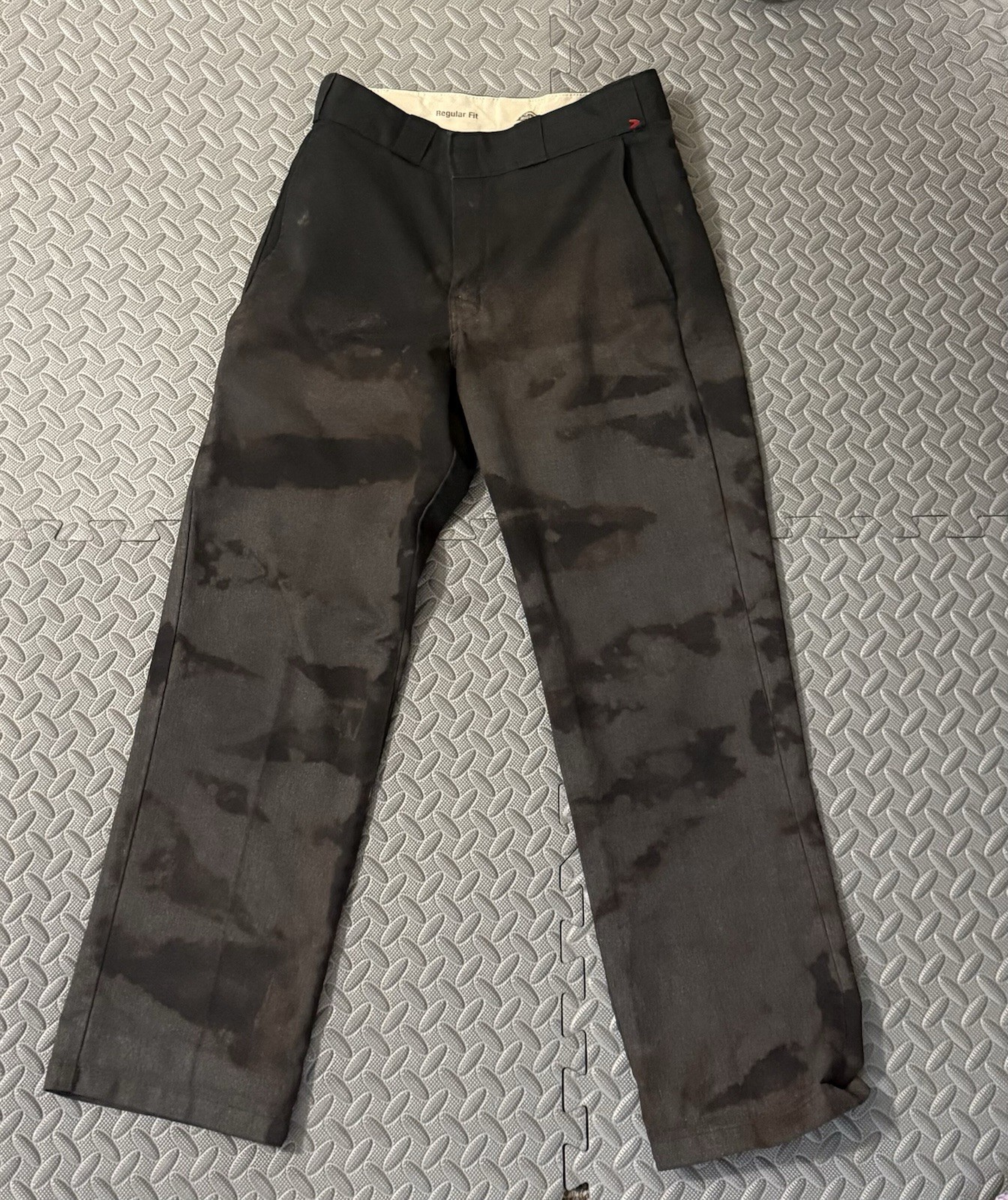 Bleached gently used Thrifted pants. It has been treated so the bleach doesnt continue to eat through the pants.