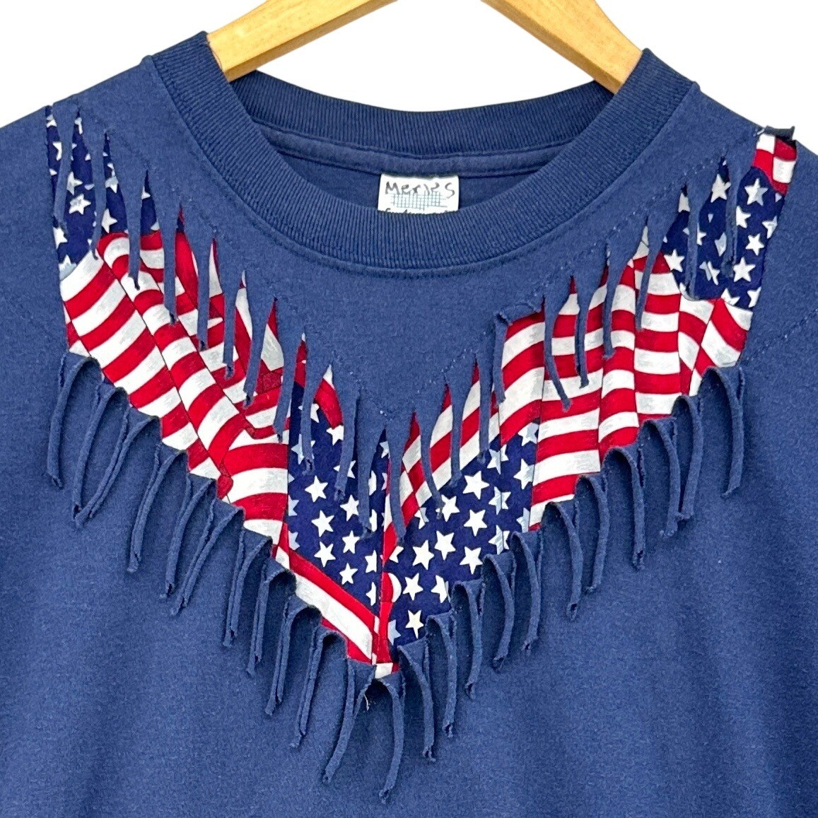 VTG 90's Upcycled Fashion Gear American Flag Fringe V-Neck Shirt SZ L Made USA