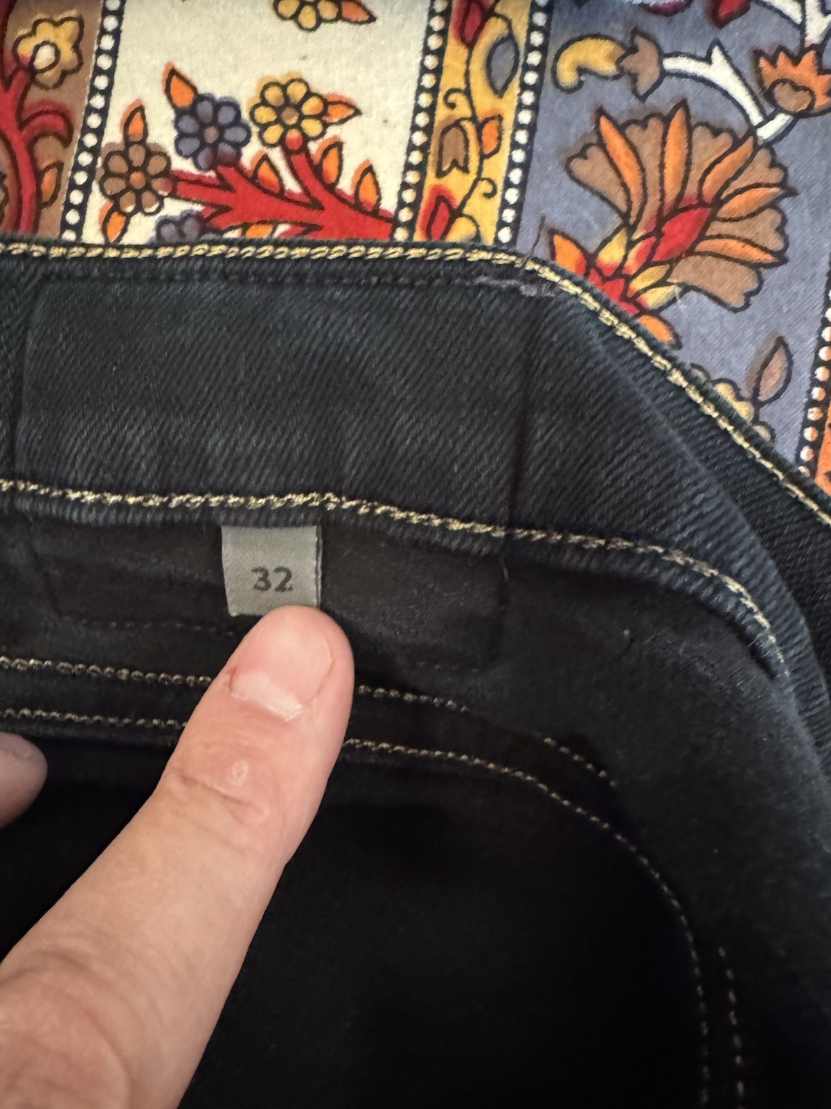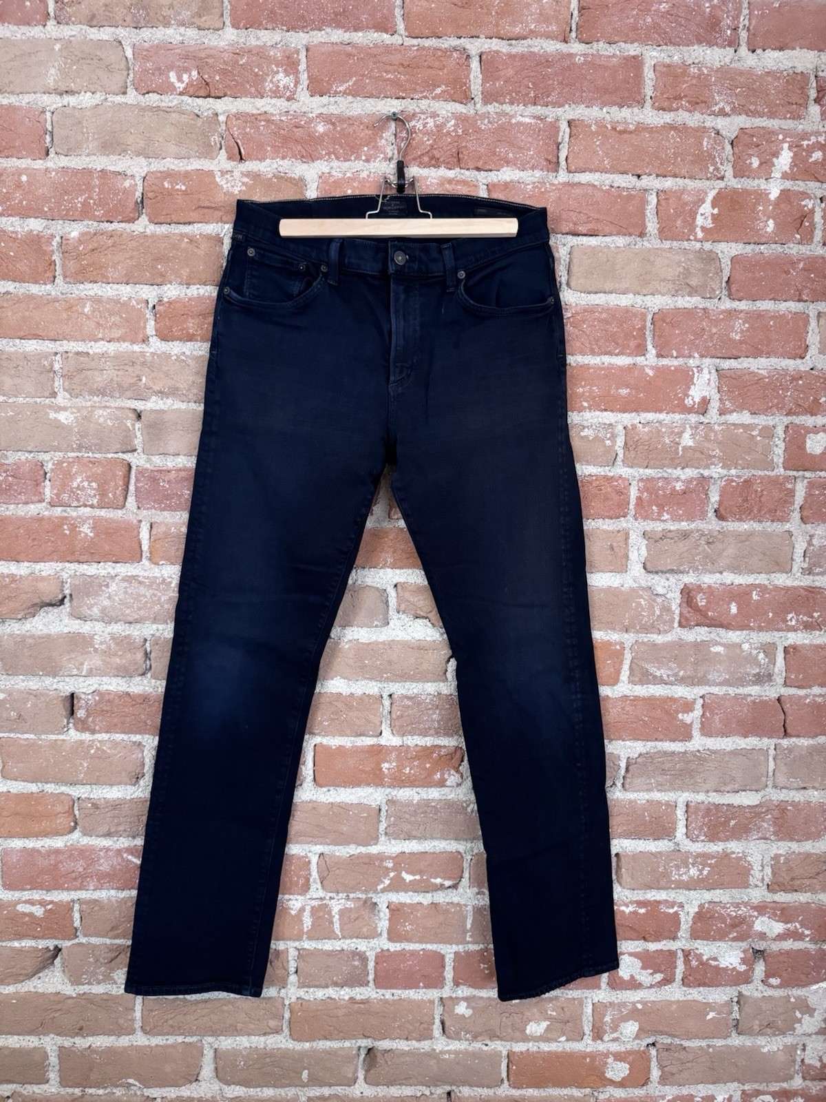 Pre-owned Citizens of Humanity men’s dark wash stretch denim jeans, size 32. Clean overall look with classic 5-pocket styling and a dark indigo / near-black wash. Made in the USA from imported materials.