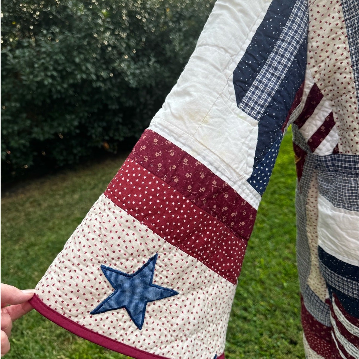 Hand Crafted Americana Farmhouse Quilted Dust Jacket made from an upcycled quilt. Features Americana themes of Flags, Farms, Houses, Hearts and Sailboats with red, cream and blue colors Material: 100% Cotton quilt, upcycled Because of the nature of the upcycled quilt, there could be some very minor staining or repairs on the piece. Design: Long duster silhouette with open front and finished edges and all interior seams finished with binding Size: Large Measurements: Bust 47" Length 41.5" Arm (Shoulder to Sleeve Hem) 21" Fit: Relaxed and roomy, ideal for layering Style: Patriotic, rustic, folk art, cottagecore, Americana