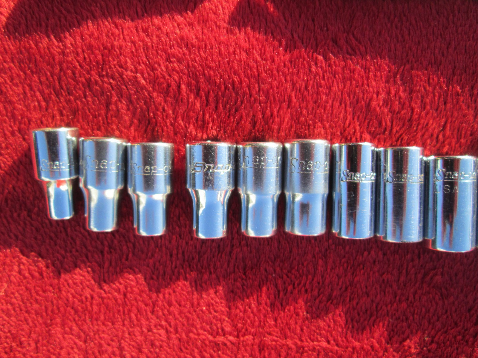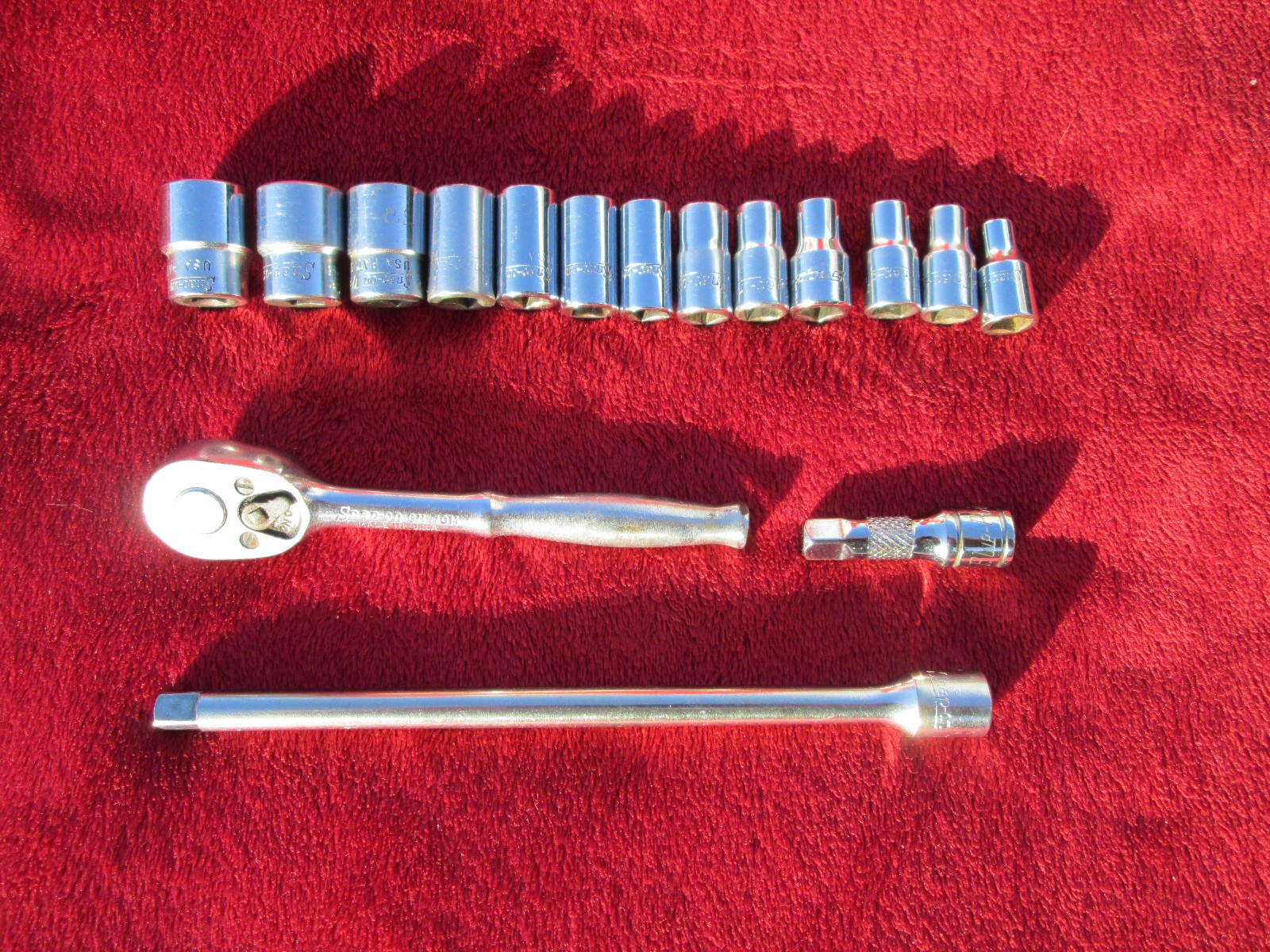 FREE SHIPPING, Nice Snap On Tools 1/4" drive SAE standard socket set in a dayton metal box, the devider is not fastened to the box. There is a 1 1/2" Blue Point extension, the rest are Snap On. All the parts are listed on the paper in the 2nd pic. Some of the red paint is missing on the red box. Thanks for looking