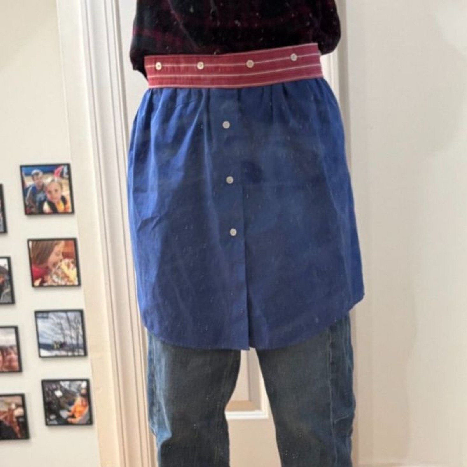 Tie Waist Apron Upcycled Shirt buttons blue with red stripe accent button front