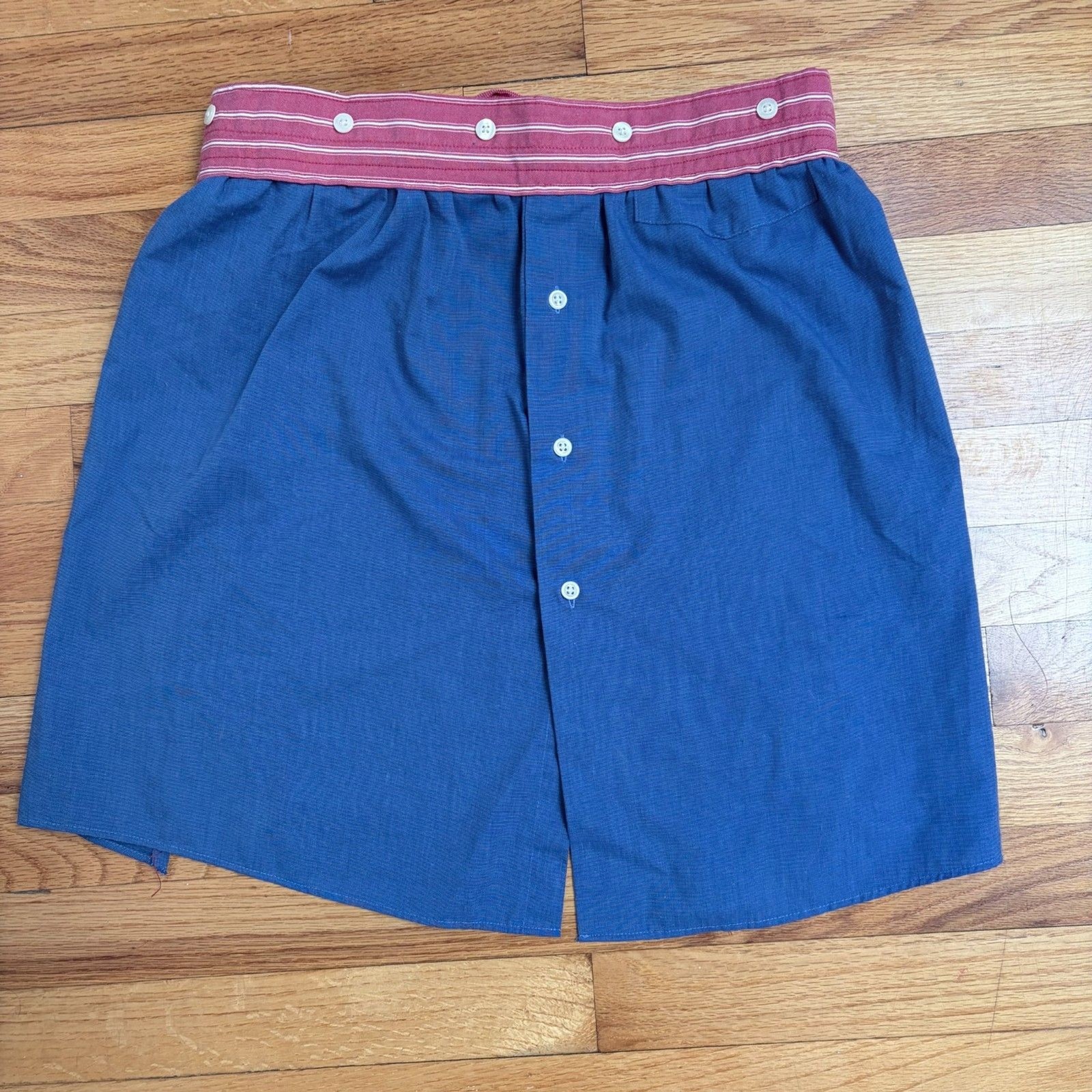 Upcycled Button Down Shirt Tie Waist Apron with Retro vintage vibes. The apron has red ticking stripes at the waist band and thin red stripe waist ties. Has functioning button down front. Feels like cotton or cotton blend, tag cut out. 19" long 24" waist band 23" each tie (I was told it was vintage but I don't know)