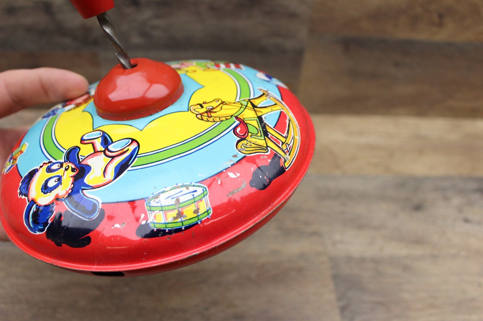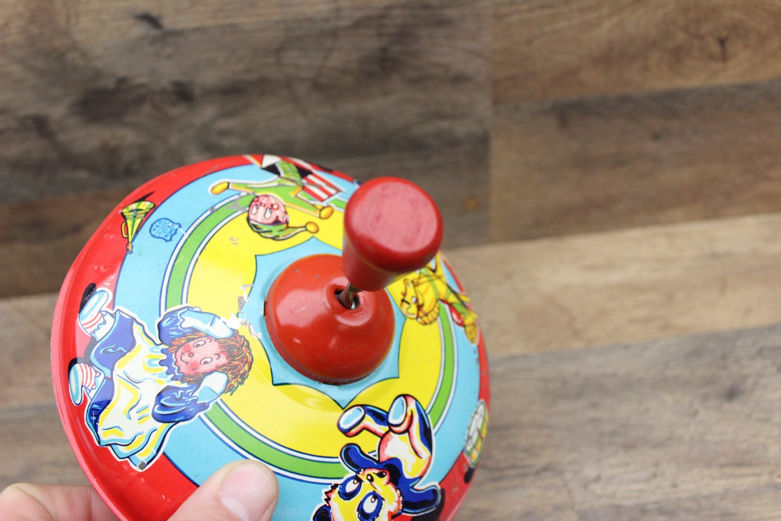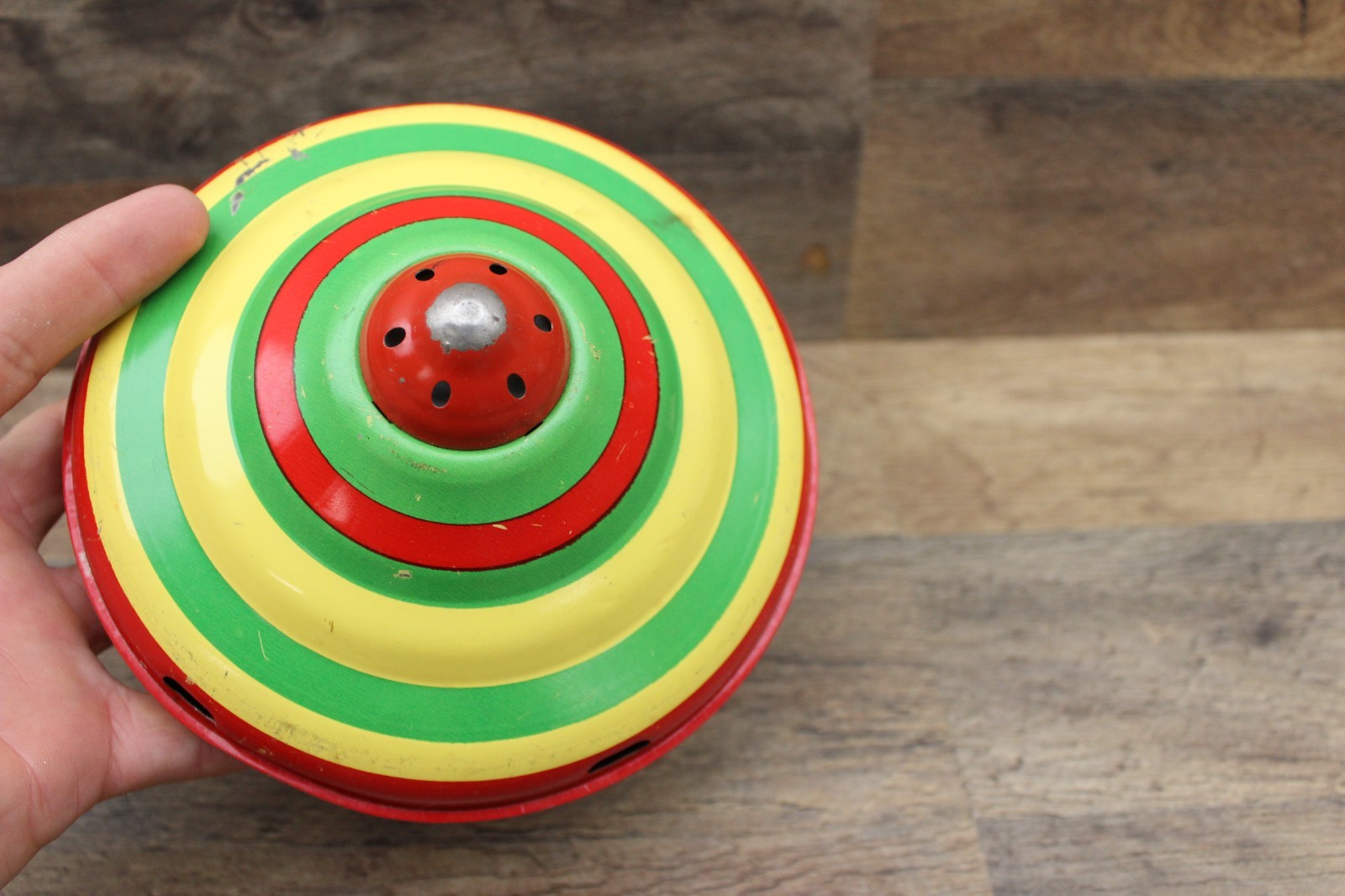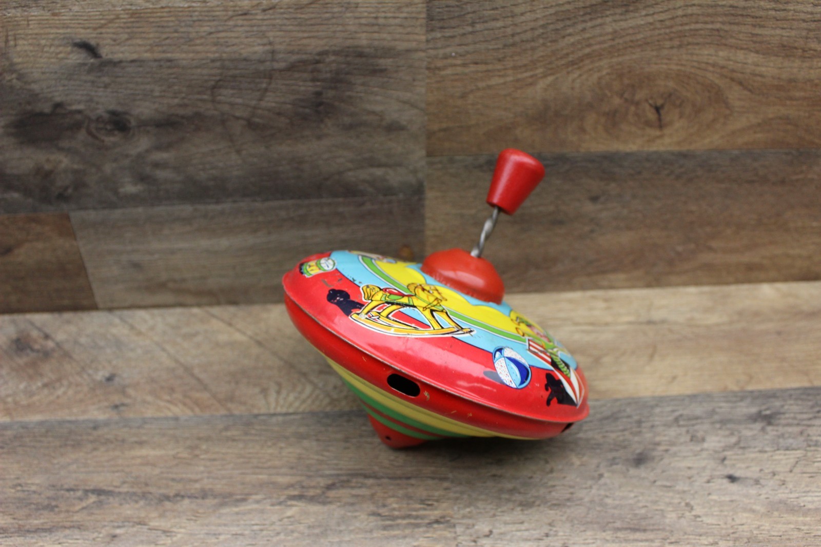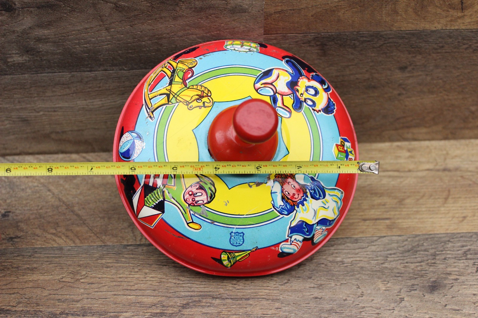 1950s J. Chein & Co. Tin Metal Spinning Top with Wooden Plunger Made In USA