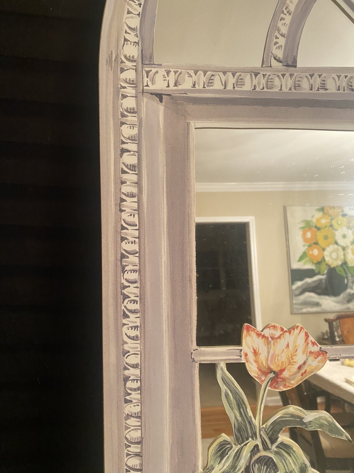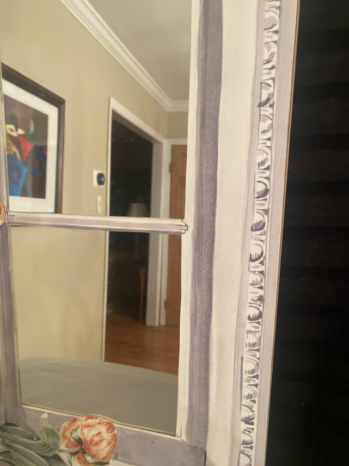 The mirror is in good condition with no damages. The mirror is made of wood with a lithograph mounted on wood and finished with textured brush strokes.