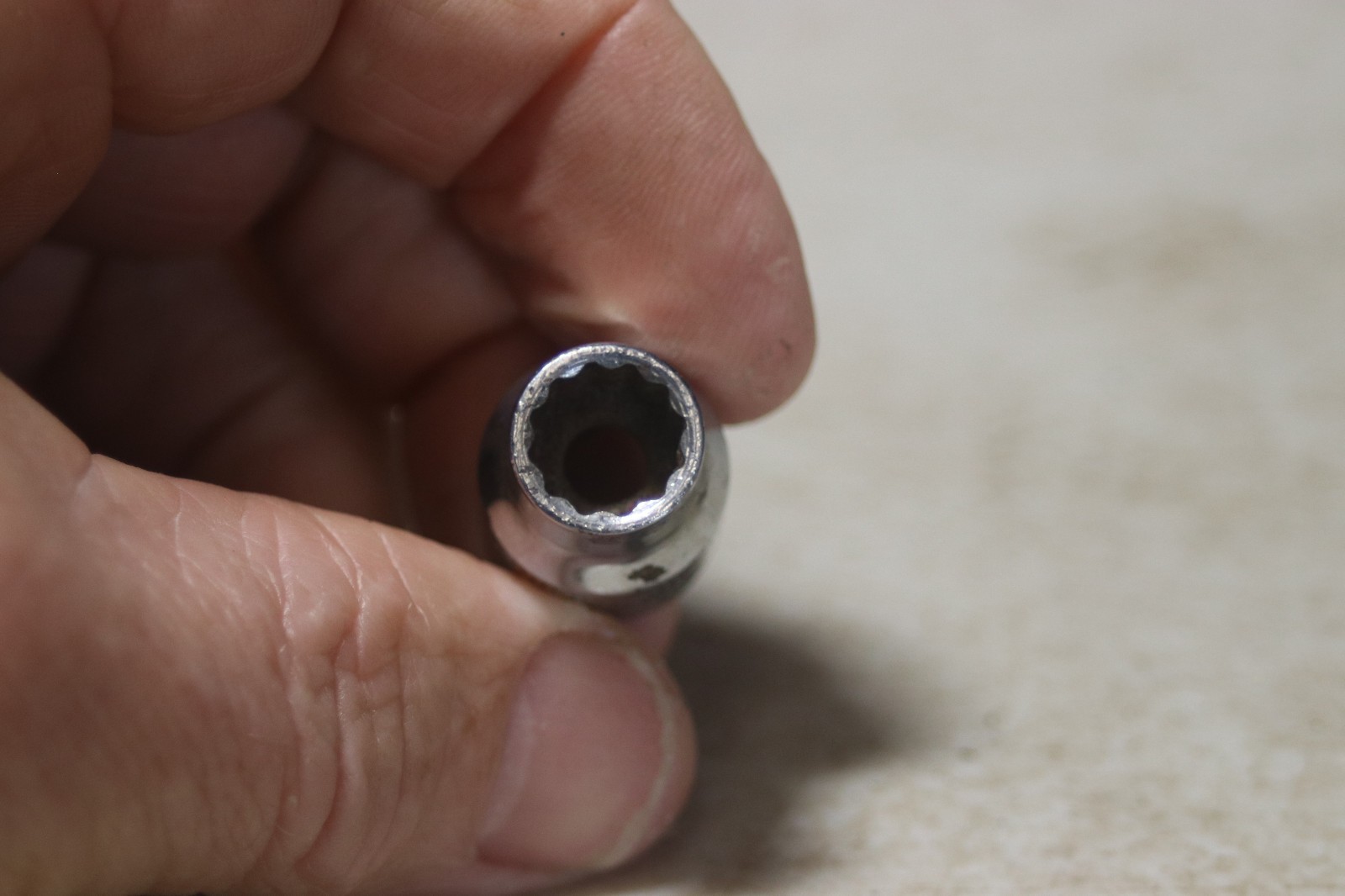Snap On FM9 3/8 inch drive 9mm 12 point socket, used, finish wear, chrome peeling, ID mark, scuffs and scratches.