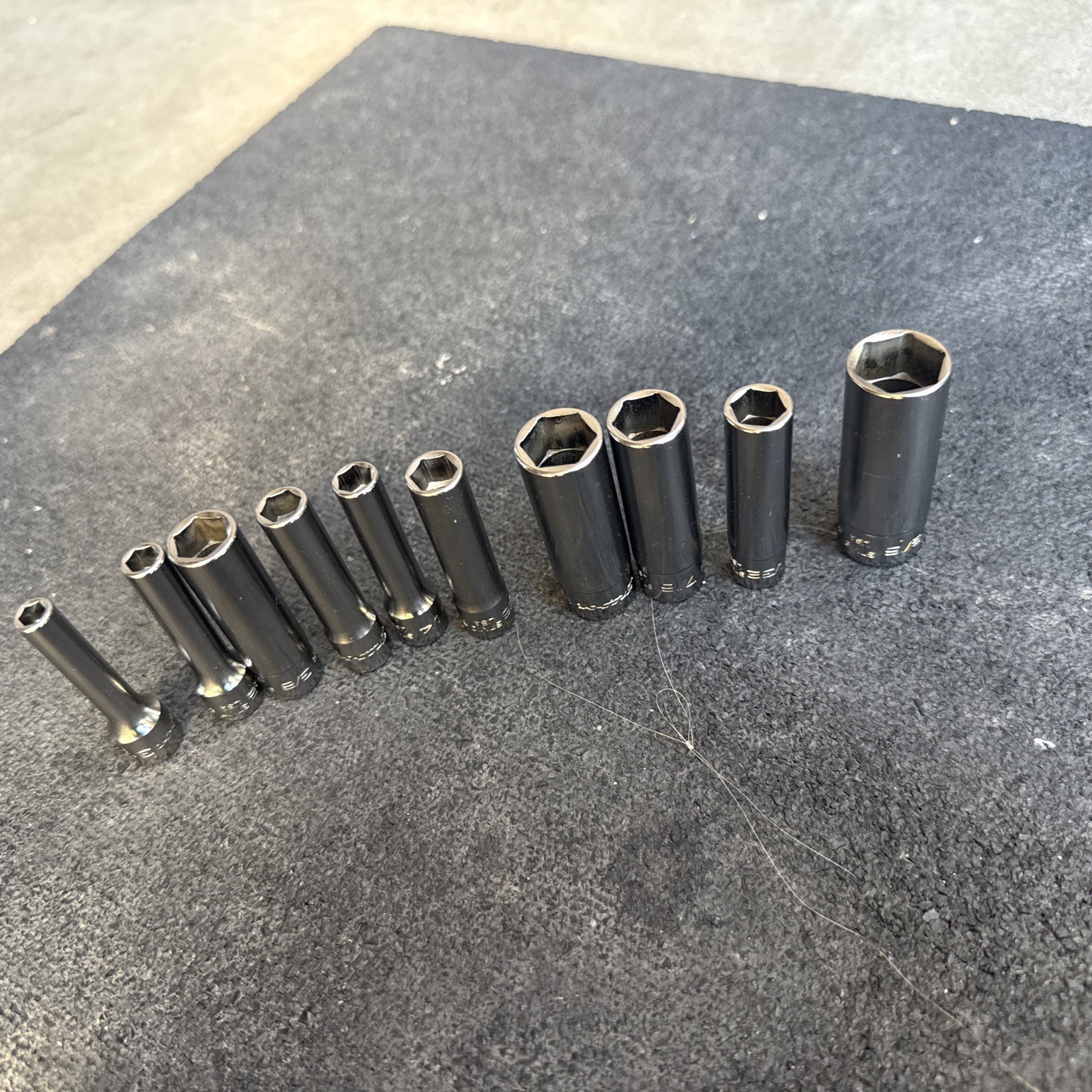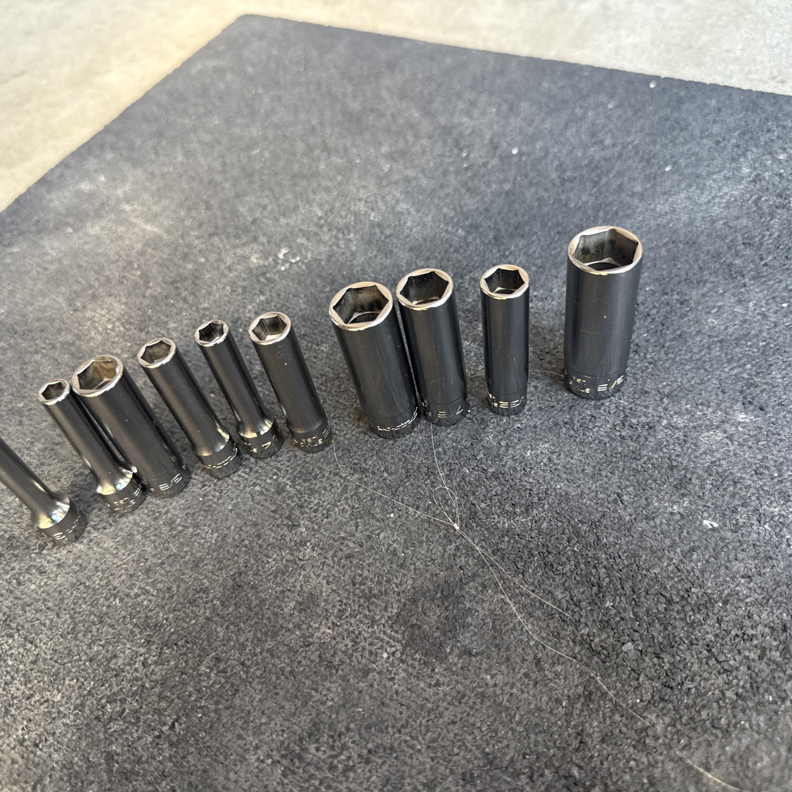 No tray The Snap On Tools 110STMY 1/4" Drive SAE Deep 6 Point Chrome Socket Set is a high-quality set of sockets designed for automotive use. This set includes 10 pieces ranging in size from 3/16" to 9/16", all with a deep length for better access to nuts and bolts. Made by the reputable brand Snap-on in the United States, these sockets are durable and built to last. The chrome surface finish not only looks sleek but also provides corrosion resistance for extended use. With a 6 point drive type and 1/4 inch drive size, this socket set is a reliable choice for any mechanic or DIY enthusiast.no warranty no tray sockets only