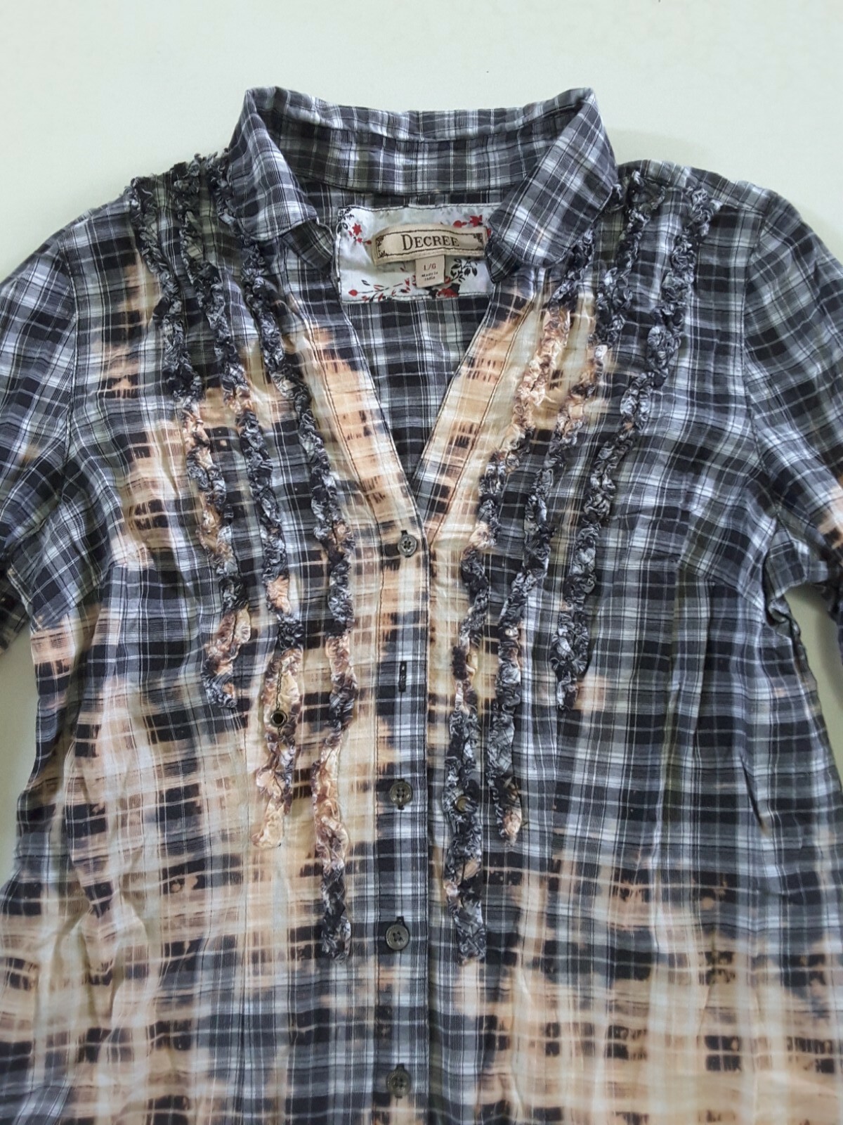 Upcycled Distressed Bleached Hand Dyed Ruffle Country Grunge Rockabilly Shirt L
