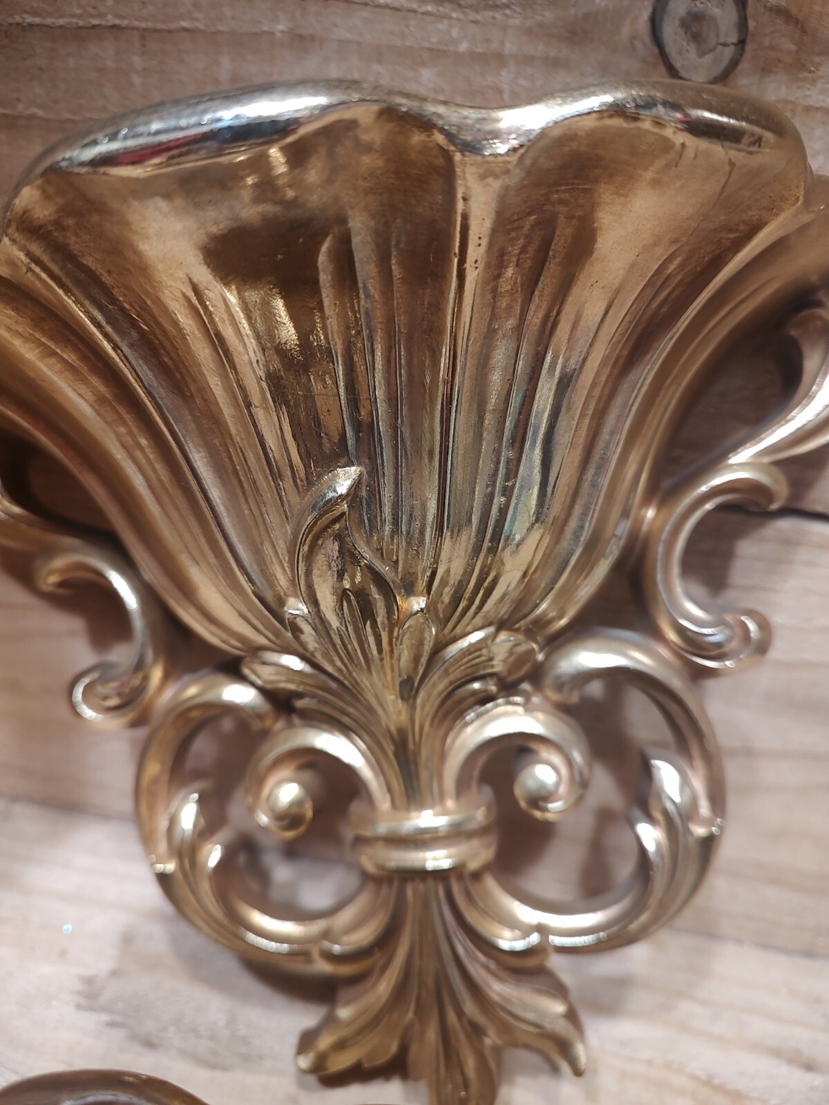 Add a touch of vintage charm to your space with this set of 2 Syroco wall sconces from the 1960s. The gold color and gilded features of these medium-sized sconces add a luxurious feel to any room. Made in the USA, these vintage original pieces are a great addition to any architectural or garden collection.