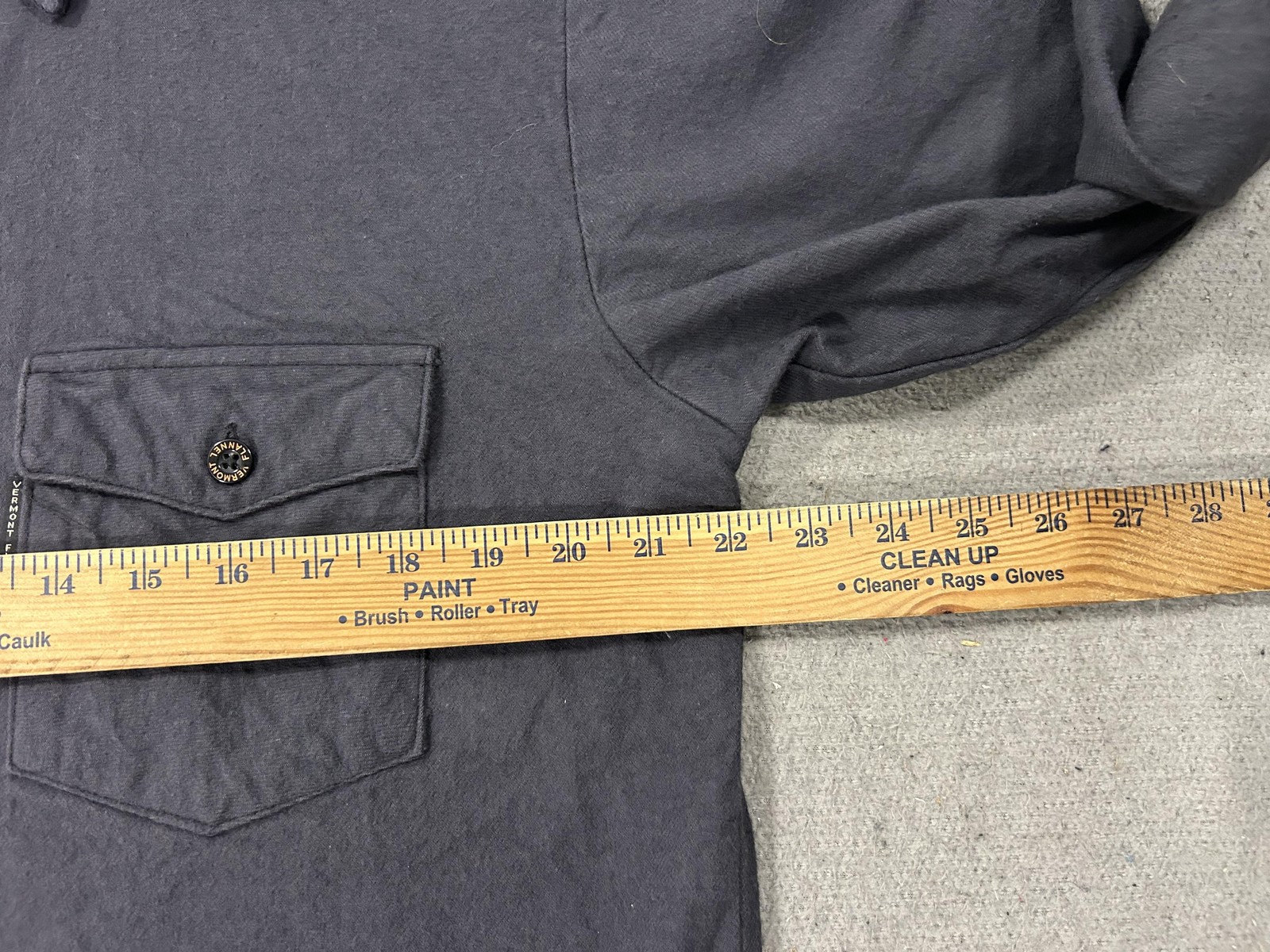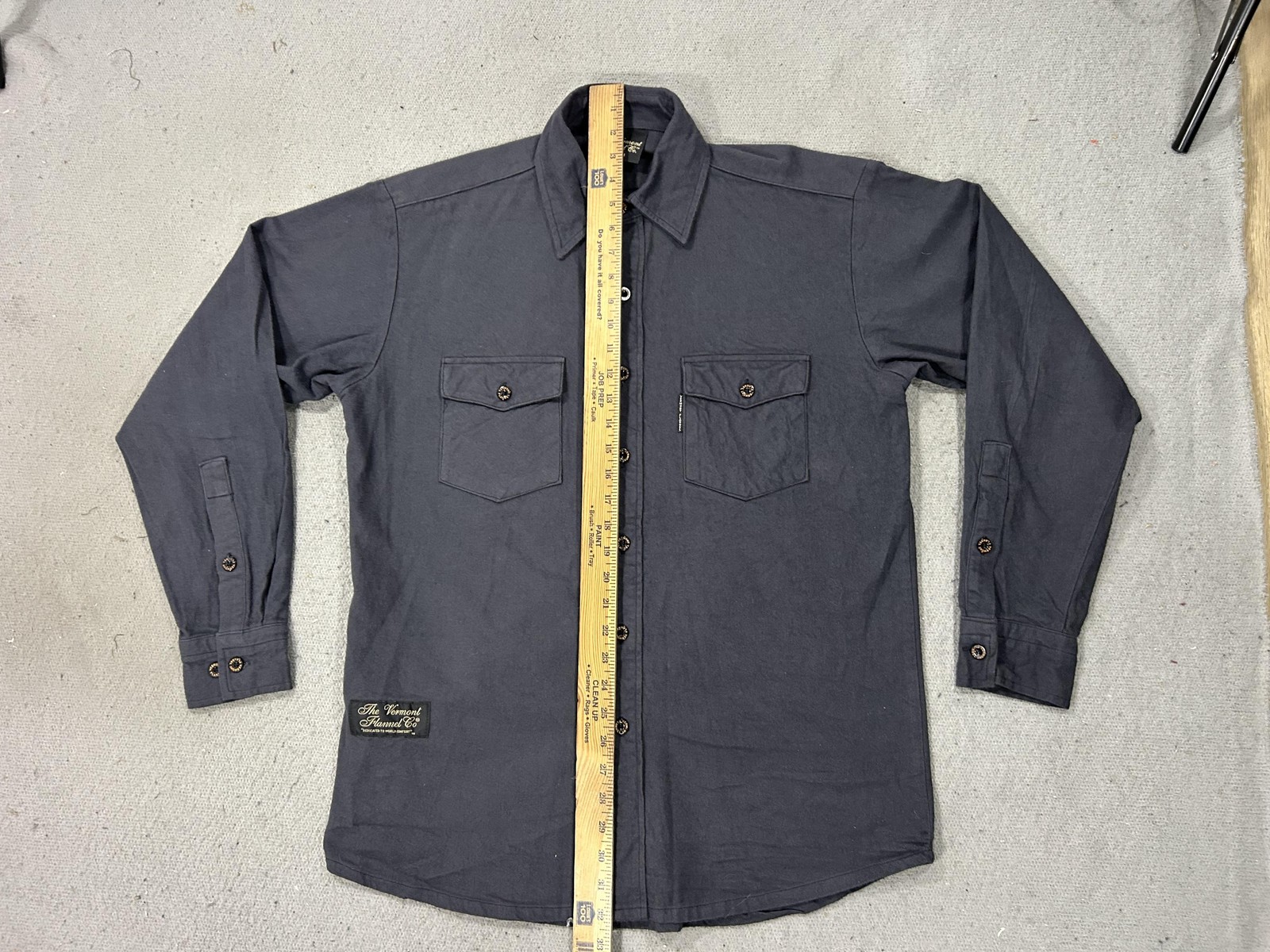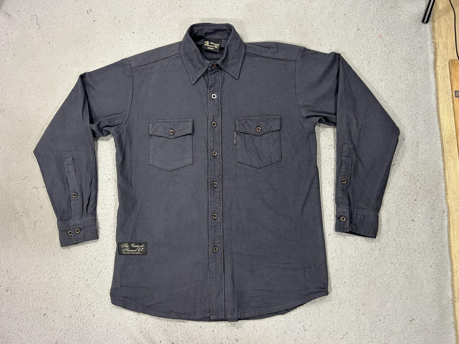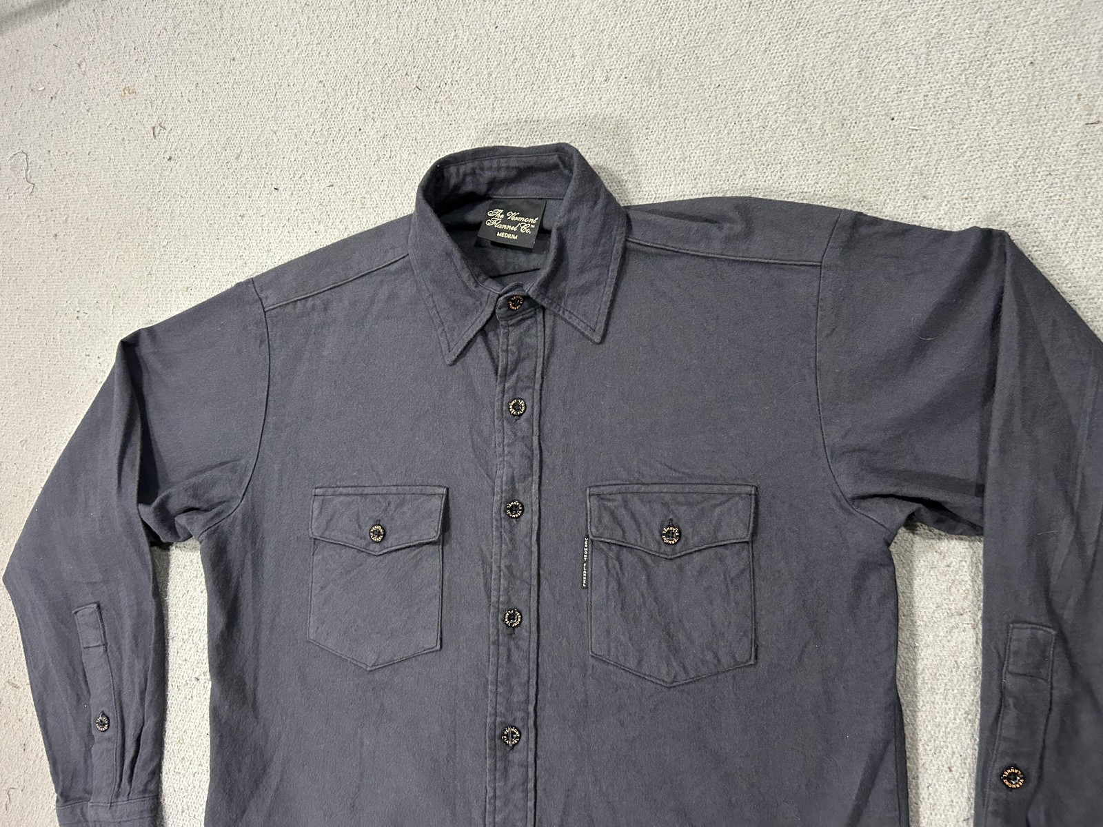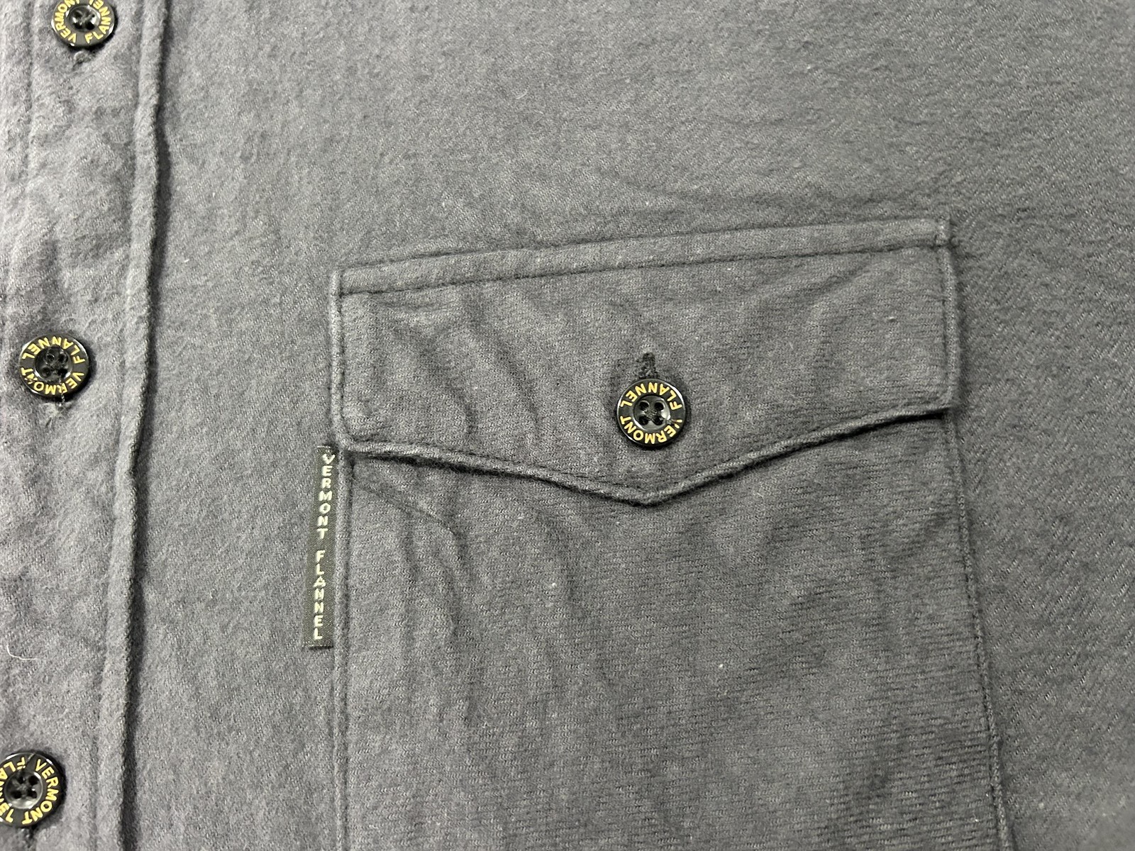 Brand: The Vermont Flannel Co. Style: Long-sleeve flannel button-front shirt with two button-flap chest pockets and a curved hem. Color: Solid charcoal gray. Size on tag: Medium (mens fit). Materials: 100% organic cotton flannel; finest imported fabric (per inner tag). Made in USA: Handcrafted in America (per tag). Details: Branded Vermont Flannel buttons, Vermont Flannel woven label at lower front, spread collar, adjustable button cuffs, soft brushed fabric for comfort and warmth, ideal for casual wear, workwear, or outdoor layering.