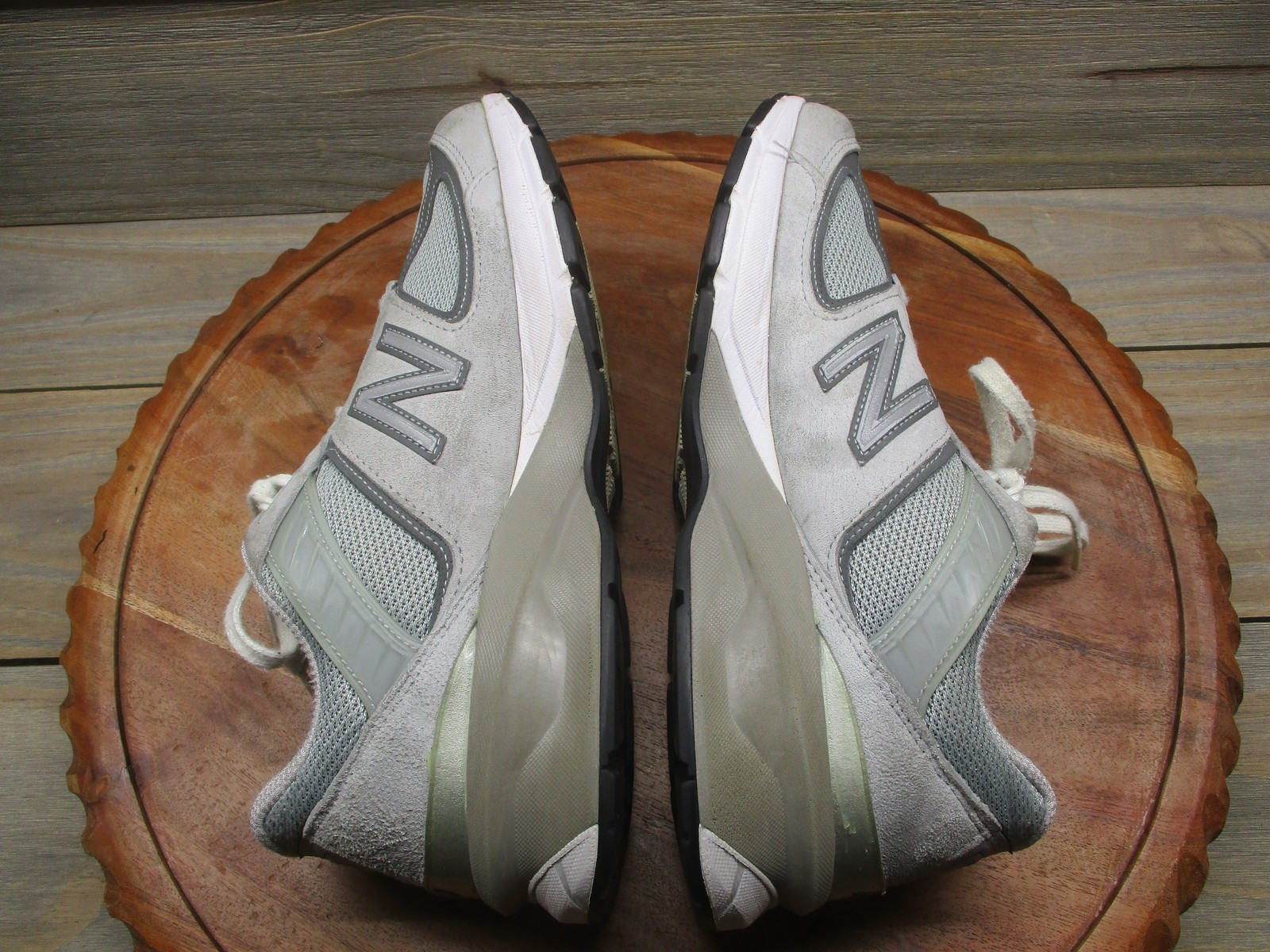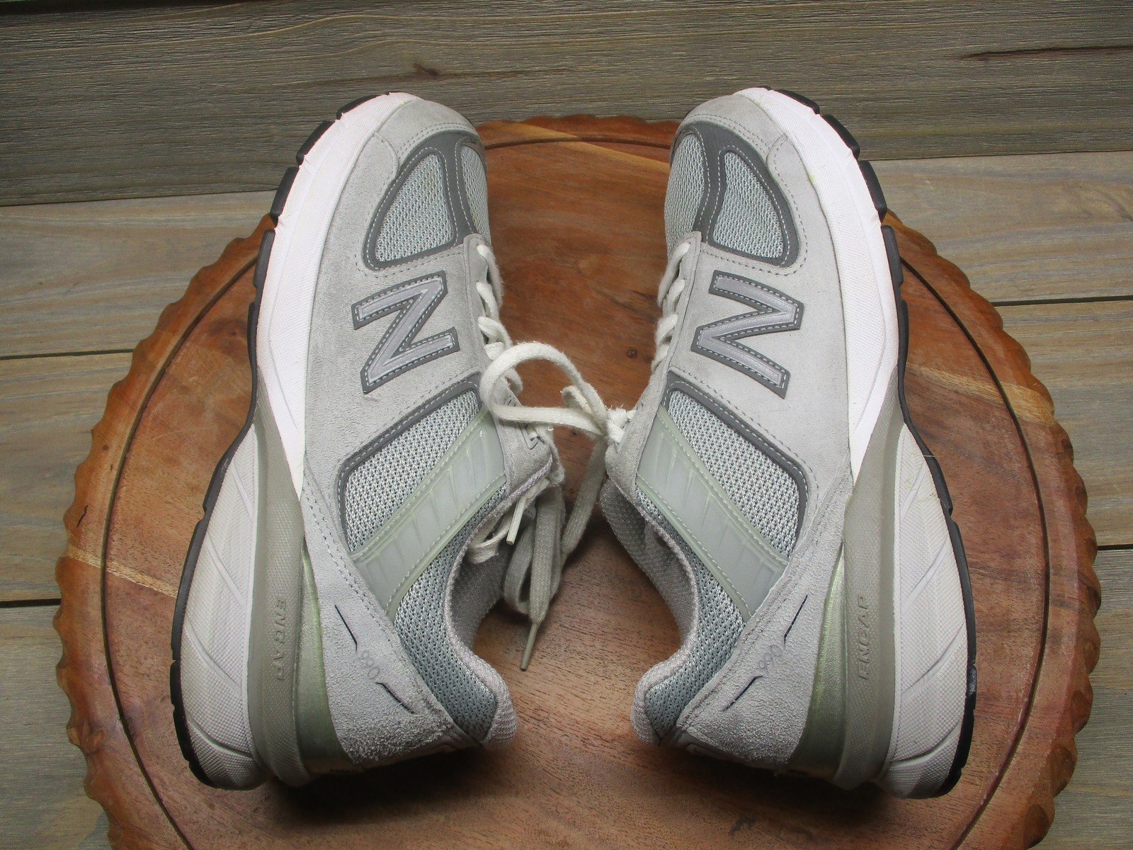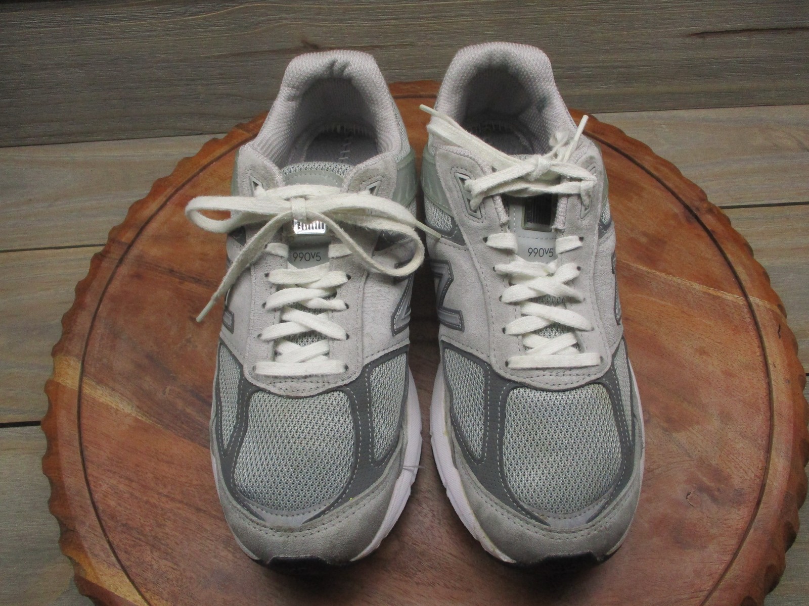 Brand: New Balance. Item: Womens low top running shoes with lace-up closure. Tag size: 10 US; womens D width with 8 UK, 41.5 EU, and 27 CM sizing. Color/Pattern: Light gray and dark gray panels with white midsoles, laces, and interior lining. Material: Suede and mesh textile upper with padded fabric lining and durable rubber outsole. Design details: Classic New Balance 990v5 silhouette with layered suede overlays, breathable mesh panels at the toe box and quarters, padded tongue and collar, and sculpted ENCAP midsole for support. Features: Cushioned midsole for comfort during running and walking, breathable upper for airflow, low top profile for easy movement, and traditional lace-up closure for an adjustable fit. Branding and tags: N logo overlays on both sides, 990v5 branding at the tongue tabs, New Balance logos at the heels and outsole, and interior size label reading W990GL5 D 10 US 08 UK 41.5 EU 27 CM with additional factory information. Country of origin: Made in USA. Occasion: Suitable for everyday casual wear, running and jogging, walking, gym workouts, and general athletic activities in all seasons. UPC: 193662149480. Notes: Please review all photos for close-up views of the uppers, midsoles, outsoles, and interior details.