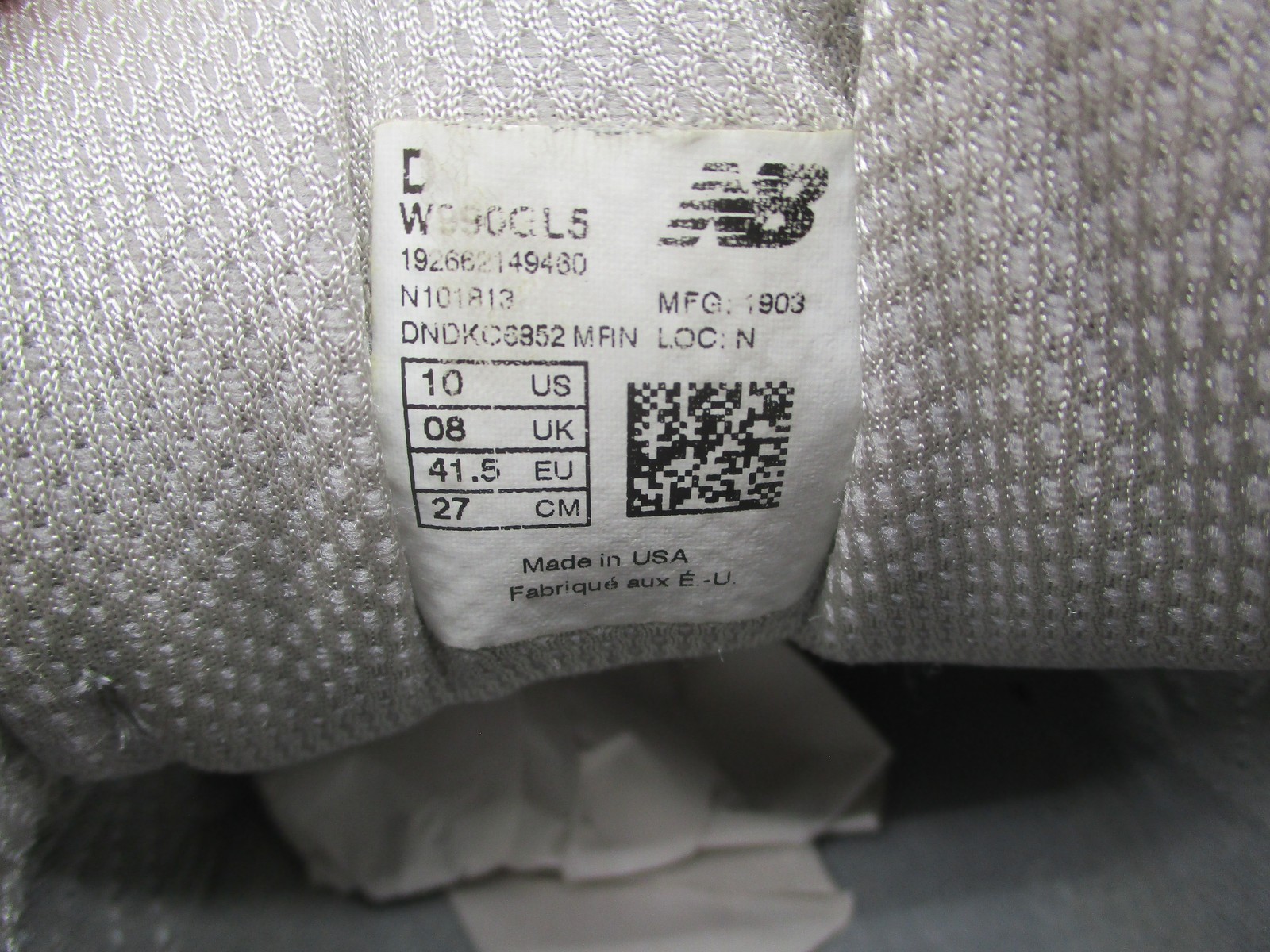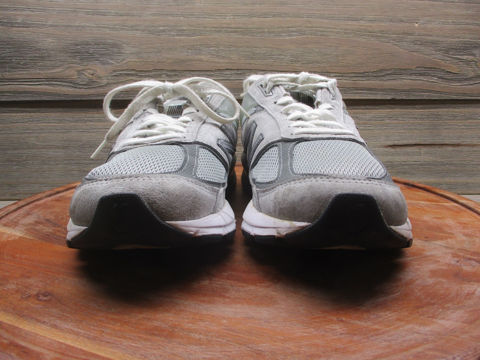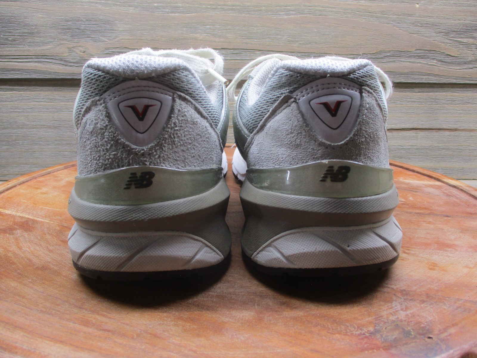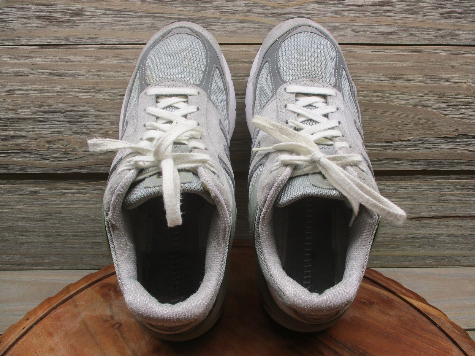 Brand: New Balance. Item: Womens low top running shoes with lace-up closure. Tag size: 10 US; womens D width with 8 UK, 41.5 EU, and 27 CM sizing. Color/Pattern: Light gray and dark gray panels with white midsoles, laces, and interior lining. Material: Suede and mesh textile upper with padded fabric lining and durable rubber outsole. Design details: Classic New Balance 990v5 silhouette with layered suede overlays, breathable mesh panels at the toe box and quarters, padded tongue and collar, and sculpted ENCAP midsole for support. Features: Cushioned midsole for comfort during running and walking, breathable upper for airflow, low top profile for easy movement, and traditional lace-up closure for an adjustable fit. Branding and tags: N logo overlays on both sides, 990v5 branding at the tongue tabs, New Balance logos at the heels and outsole, and interior size label reading W990GL5 D 10 US 08 UK 41.5 EU 27 CM with additional factory information. Country of origin: Made in USA. Occasion: Suitable for everyday casual wear, running and jogging, walking, gym workouts, and general athletic activities in all seasons. UPC: 193662149480. Notes: Please review all photos for close-up views of the uppers, midsoles, outsoles, and interior details.