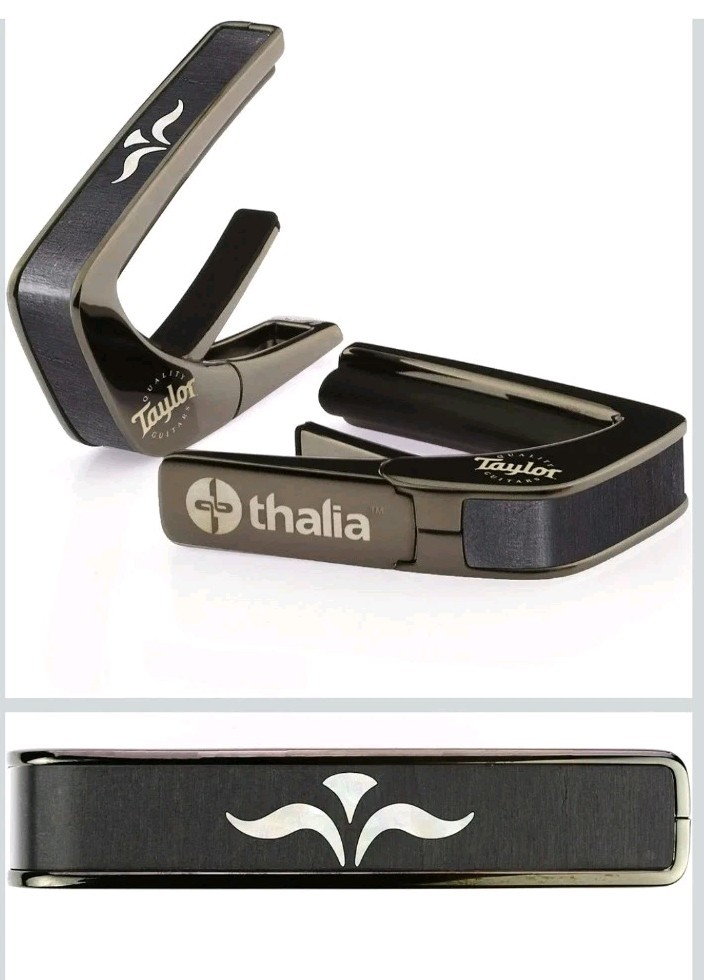 Brand new sealed Thalia brand licensed CAPO for Taylor guitars guitar capo in black chrome with 600 series wing pearl inlay design.