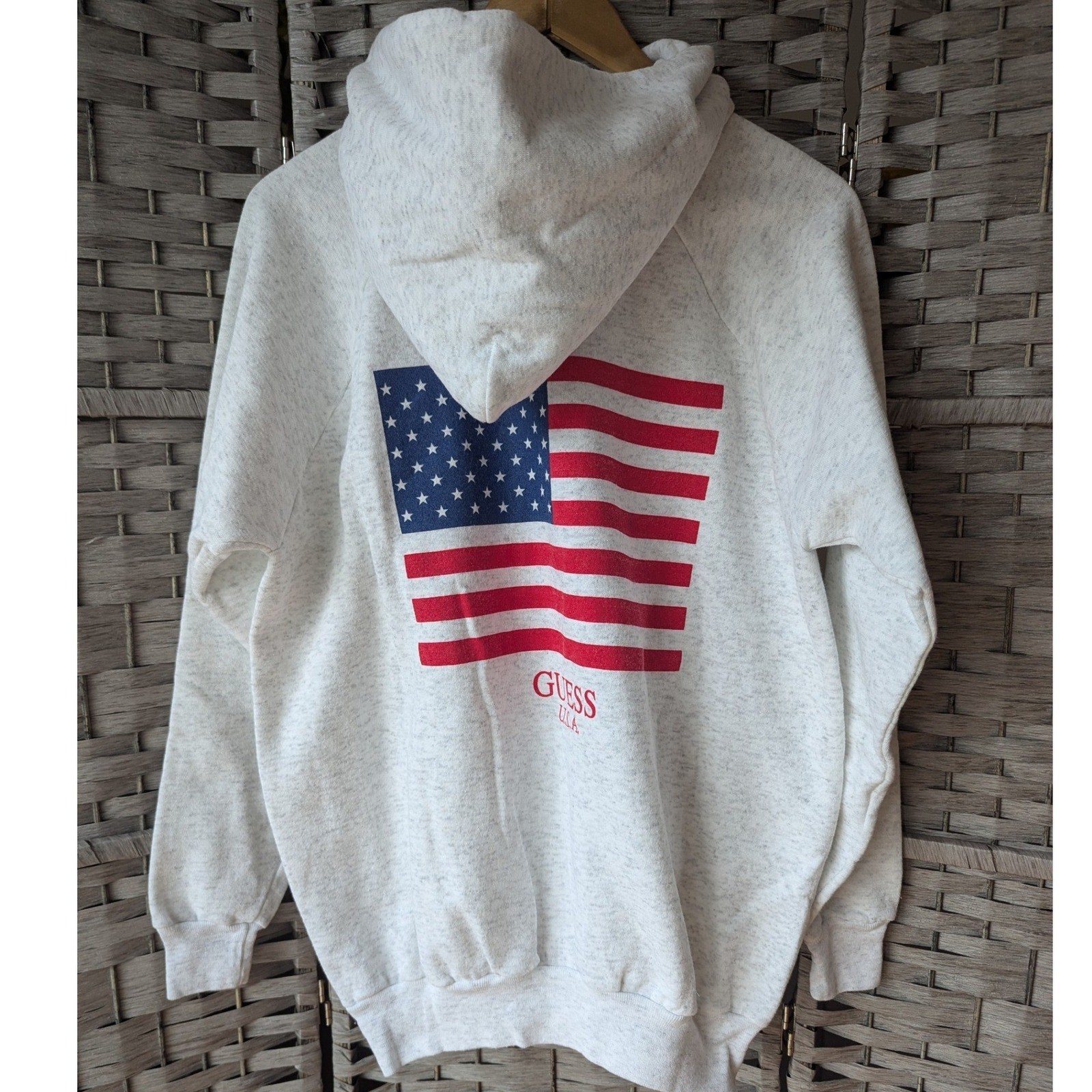 Vitg 90s Guess American Flag Hoodie Pull On Heathered Gray Made in USA One Size