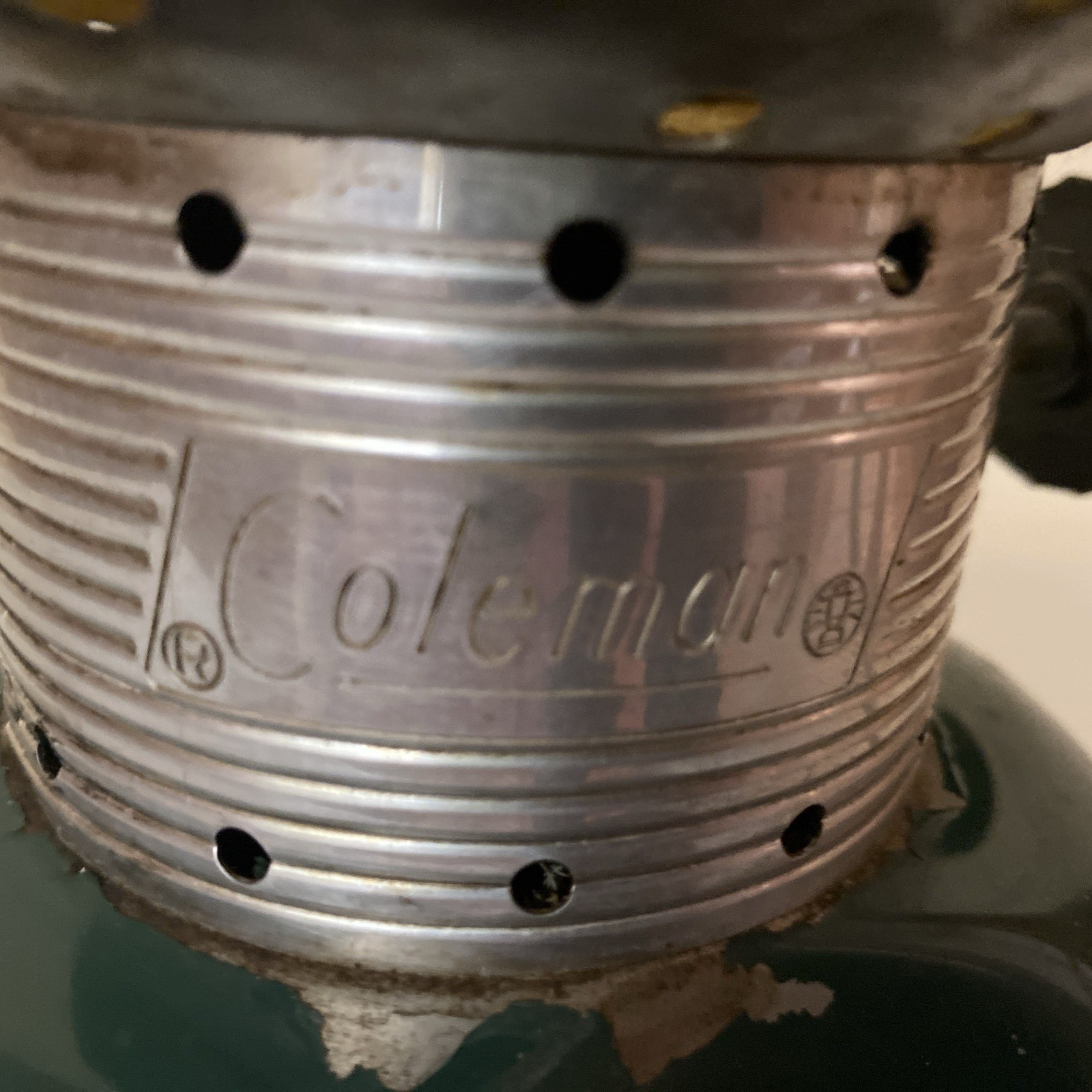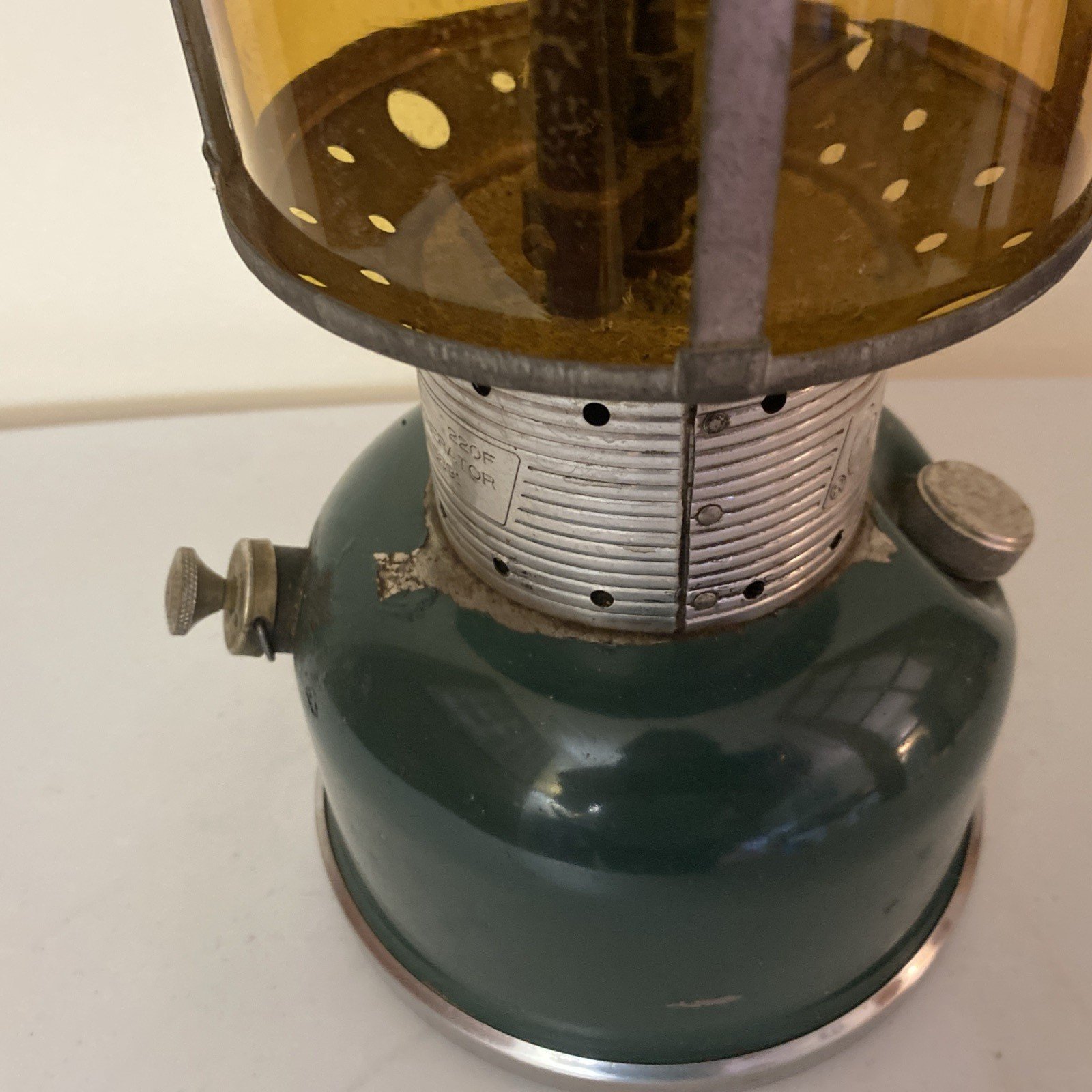 COLEMAN MODEL 220F LANTERN~GREEN~MADE IN U.S.A.~AMBER GLASS
