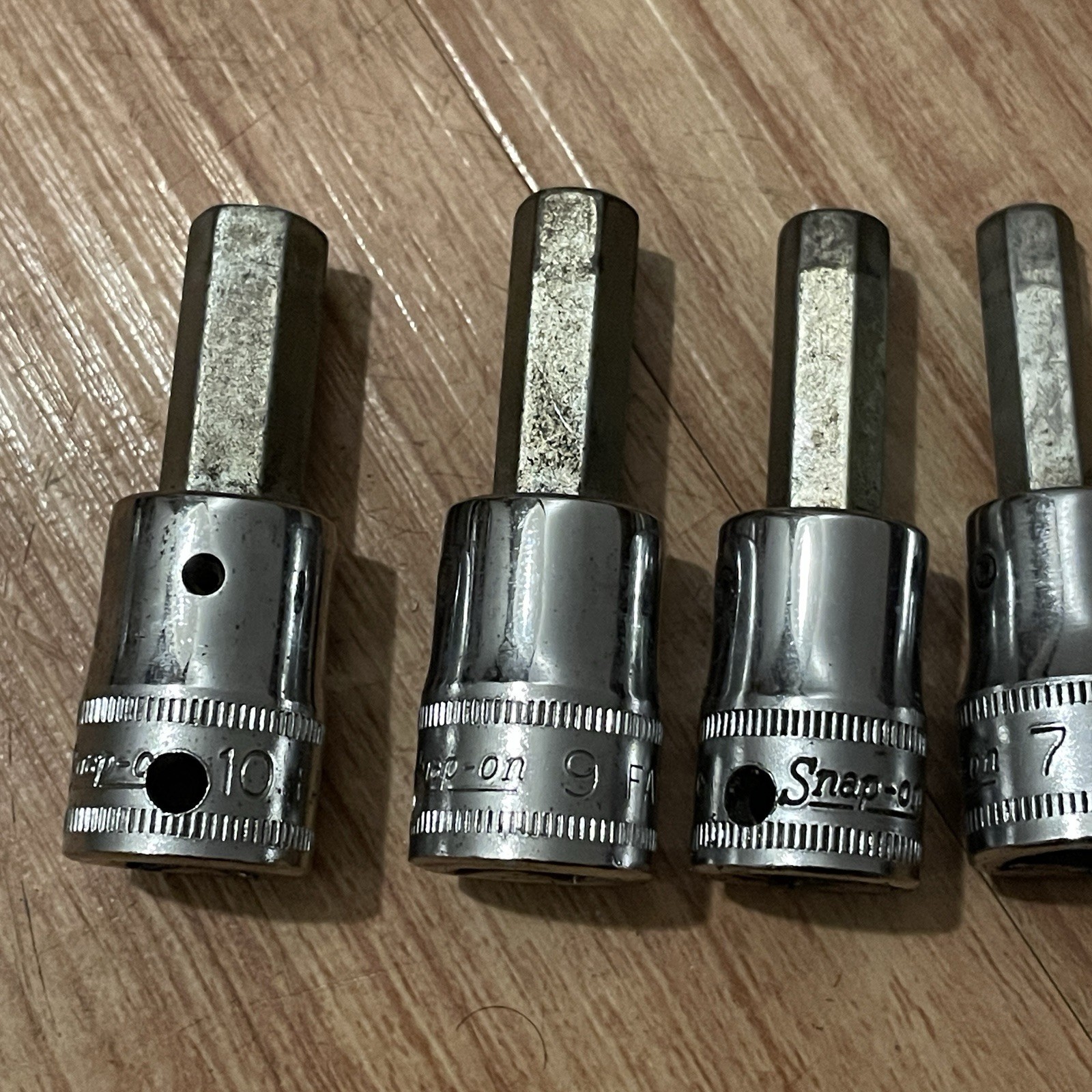 Snap-on 4-10mm 3/8" Drive Metric 7 Piece Hex Bit Socket Set. Great Preowned Condition. The set includes: 4mm,5, 6, 7, 8, 9, 10mm. Check the pictures for more details. Shipped with ground advantage package