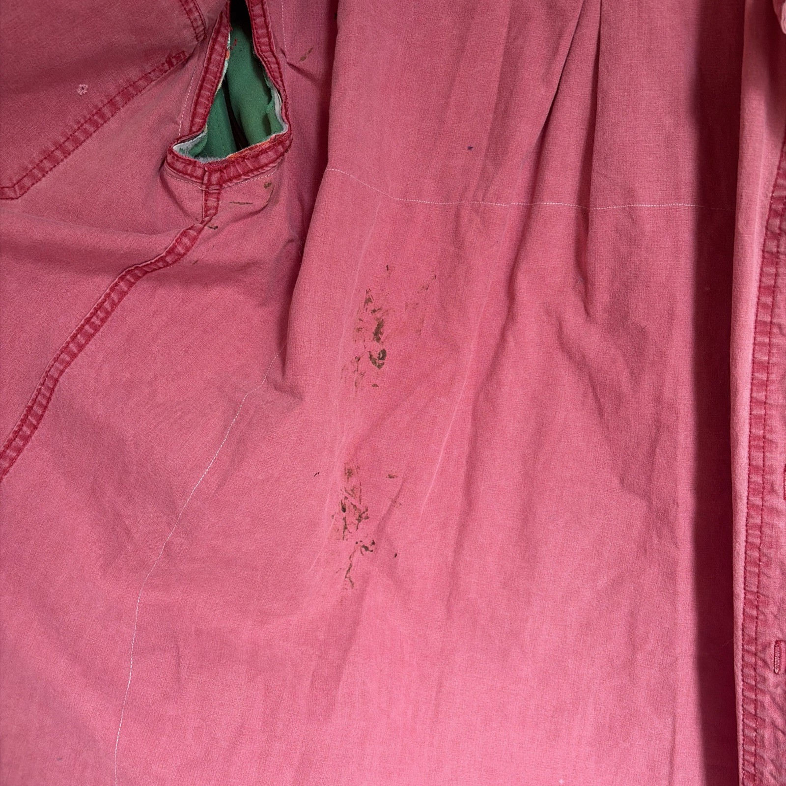 This was briefly used as an artist smock and the stains on the front are white paint and the stains inside are actually from an adhesive and slightly textured. Not for everyone. Worn and shows it but it tells a story and is an interesting Upcycled quirky one of a kind piece. It could be a fun piece to further distress with more paint and texture to enhance what’s already organically there from honest wear.