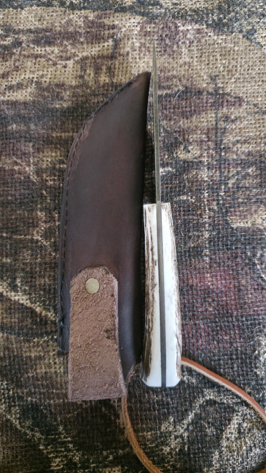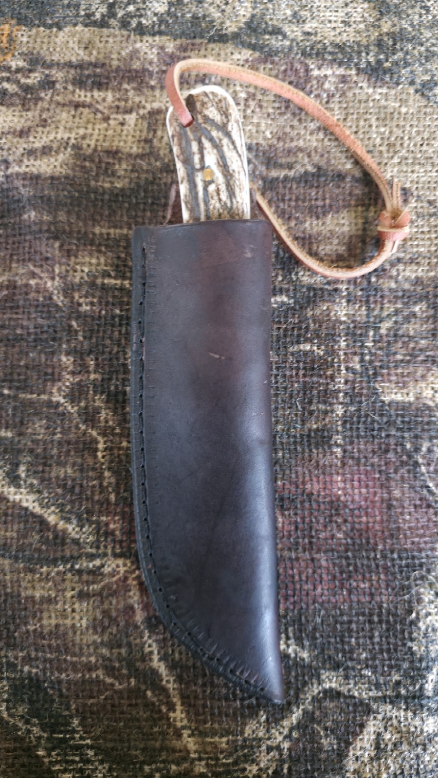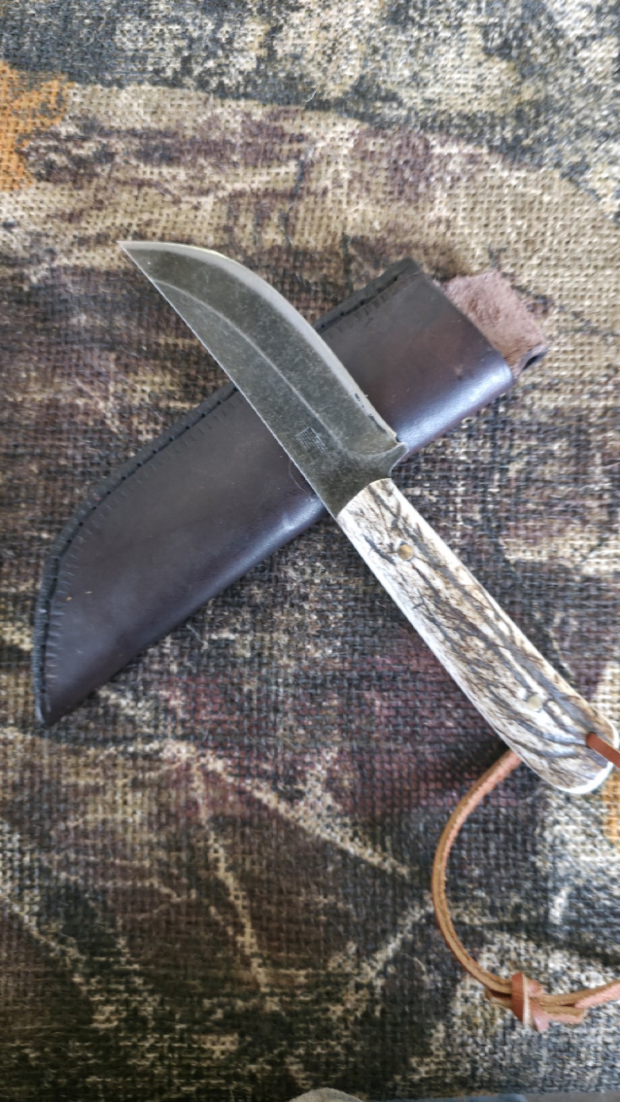 The R&A Custom Handmade Knife is a high-quality hunting knife made in the USA. This knife features a trailing point blade made of 8670 carbon steel with a black color and a plain edge. The handle is made of elk horn, adding a unique touch to the design. This original piece comes with a sheath, making it a practical and stylish addition to any collection of custom knives.